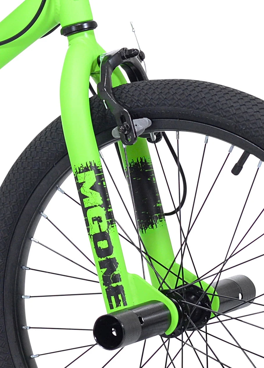 The Kent Bicycles 20-inch Boy's Madd Gear freestyle bicycle is the bike for the budding action sports athlete. The heavy-duty steel freestyle frame with extreme inspired color and graphics is the solid platform that this bicycle is built on. The sturdy 48 spoked wheels with freestyle street tires will give the aspiring action sports athlete a smooth ride while shredding the neighborhood streets. A rear linear-pull brake and front side pull with reach adjust brake levers will keep the riders speed in check with ease. The cable detangler rotor system, along with front and rear pegs round out the freestyle package for this bike. Chainguard, reflector kit, and a kickstand are all included as well.