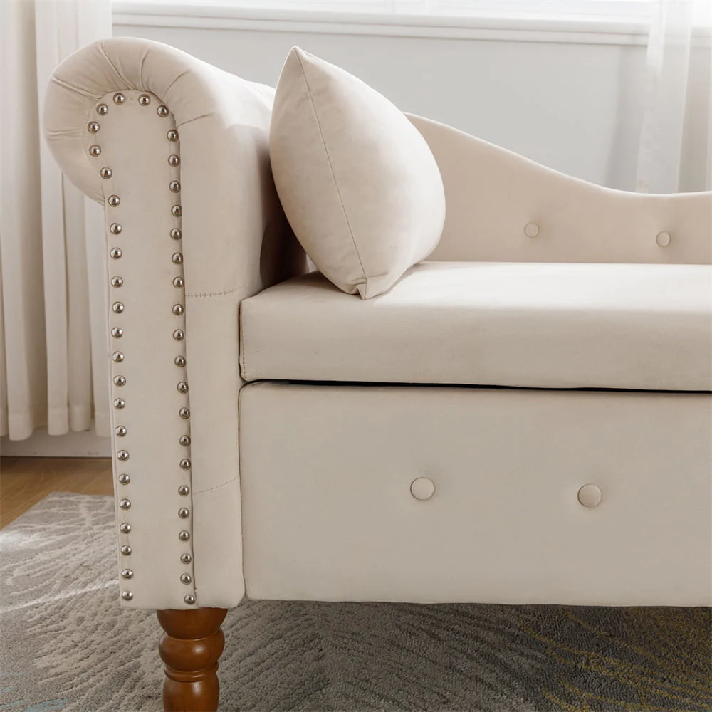 This indoor chaise lounge features a button tufted design inspired by the chesterfield style, complemented by nailhead trim and rolled armrests.