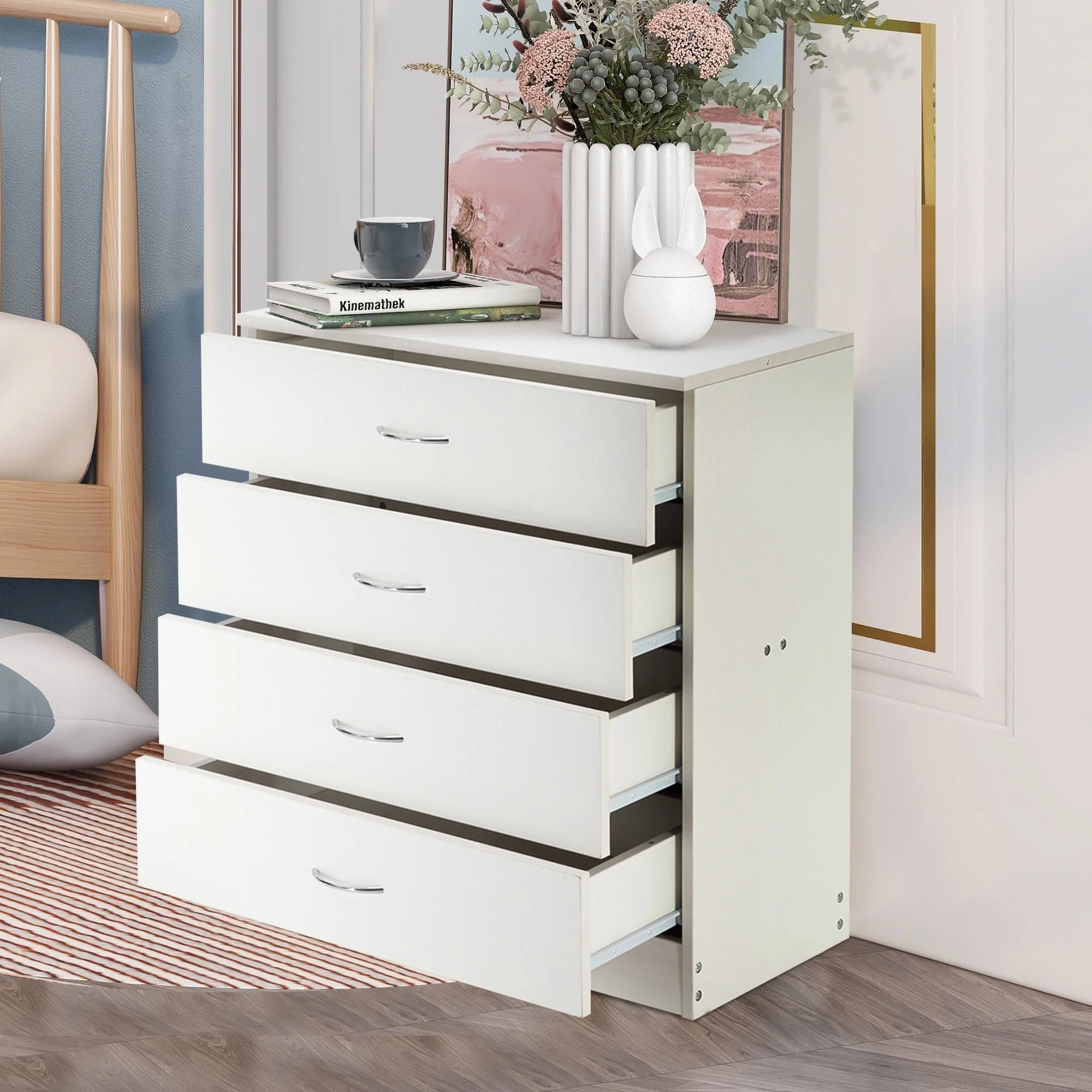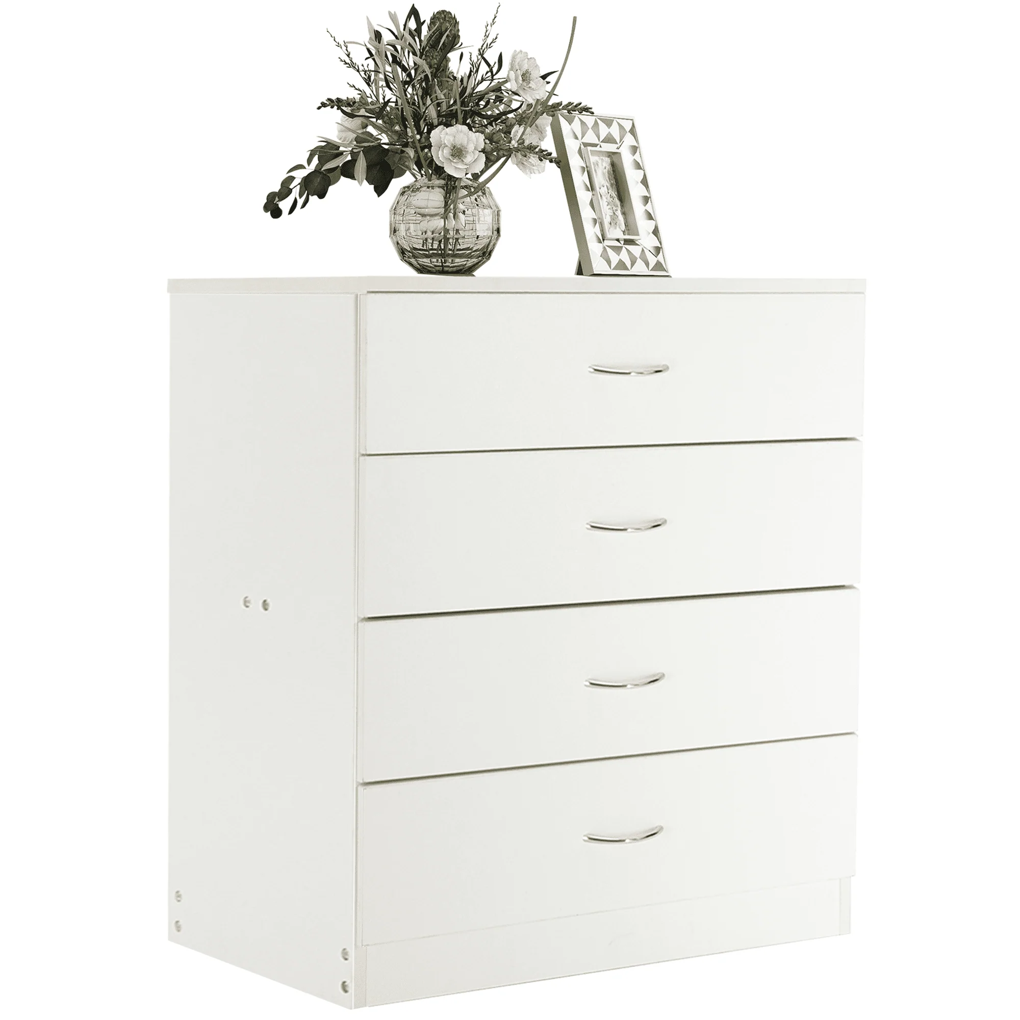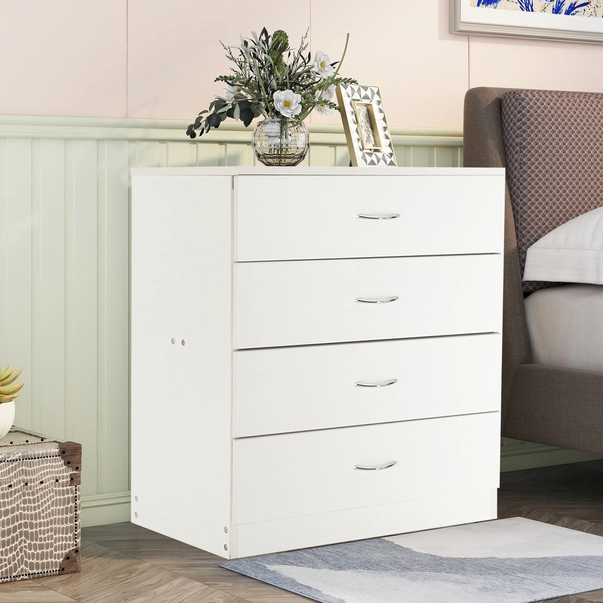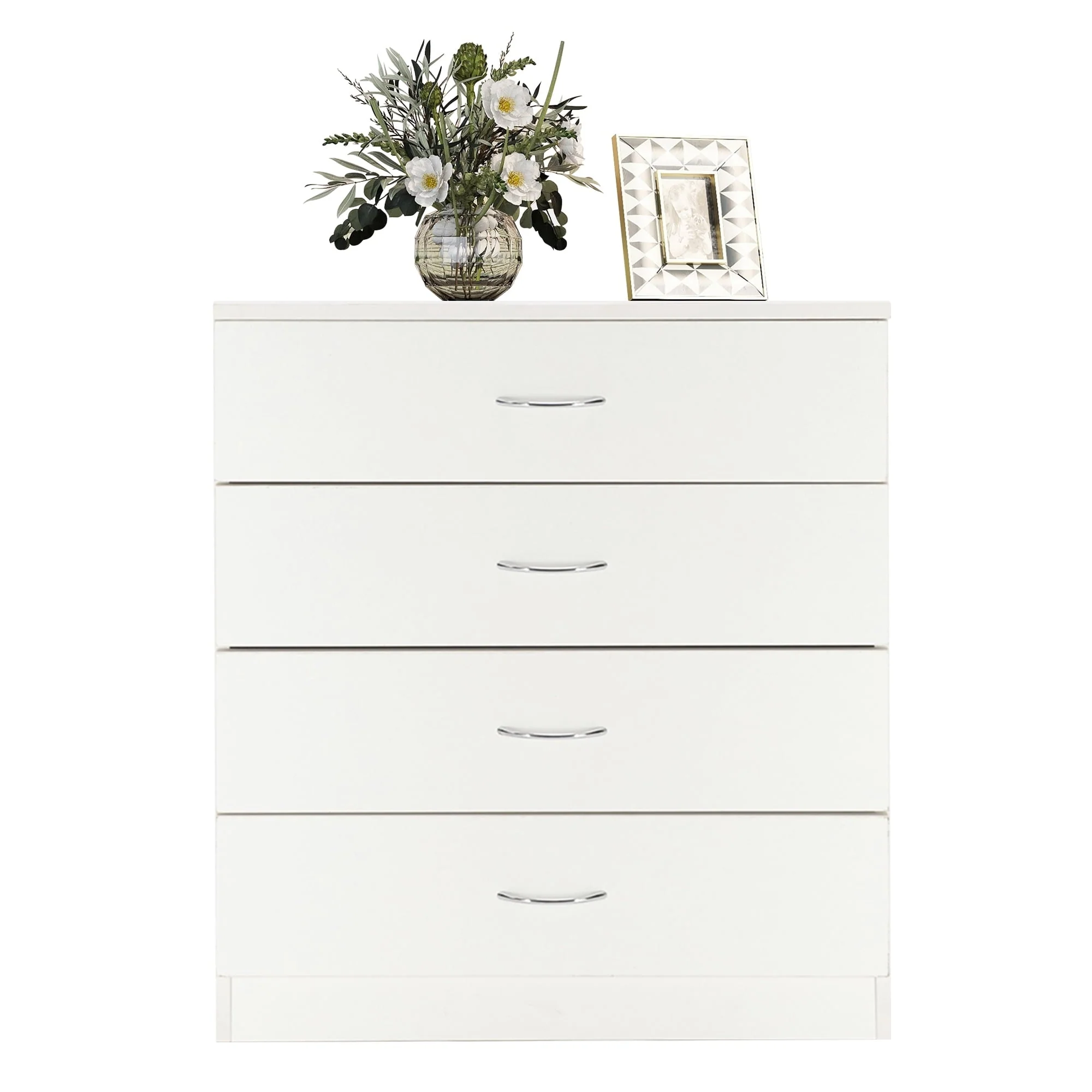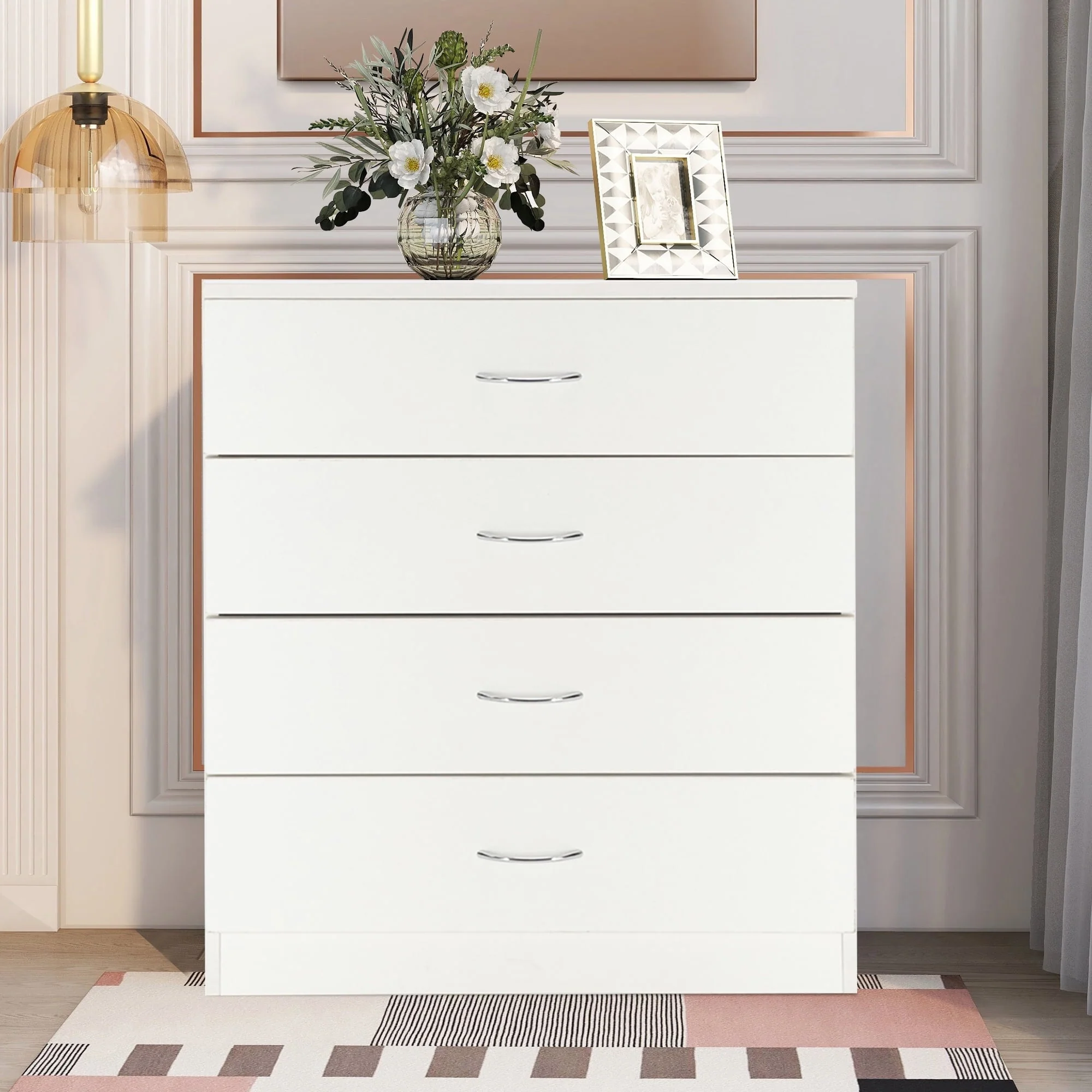 This elegant wooden 4-drawer cabinet strikes a clean-lined rectangular silhouette that features a simple and stylish appearance, adds an elegant touch to your bedroom, and blends effortlessly into any home style. Three drawers with a metal handle offer out-of-sight storage for bedside essentials, while the dresser’s top surface provides a perfect platform for a phone charger and a stylish lamp.