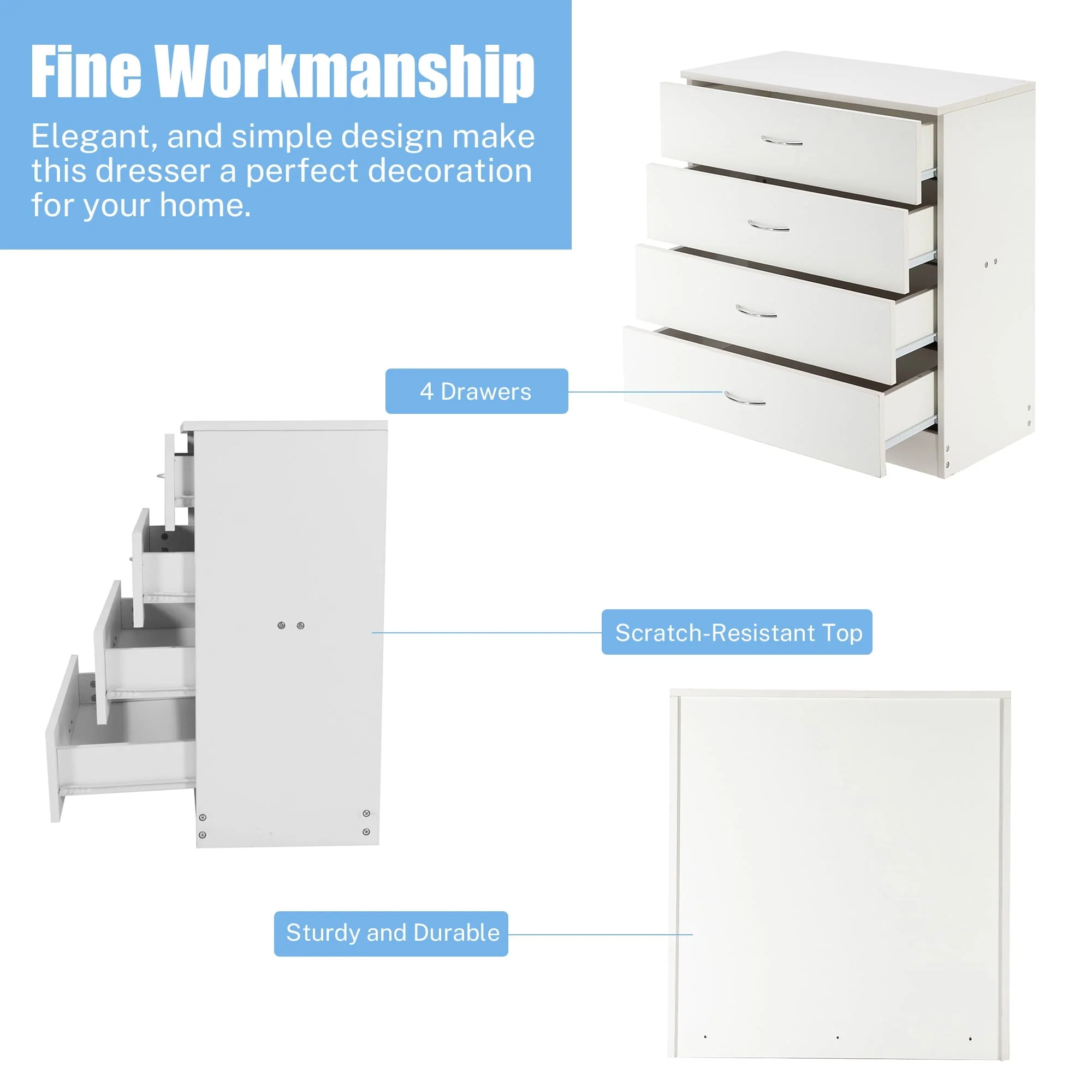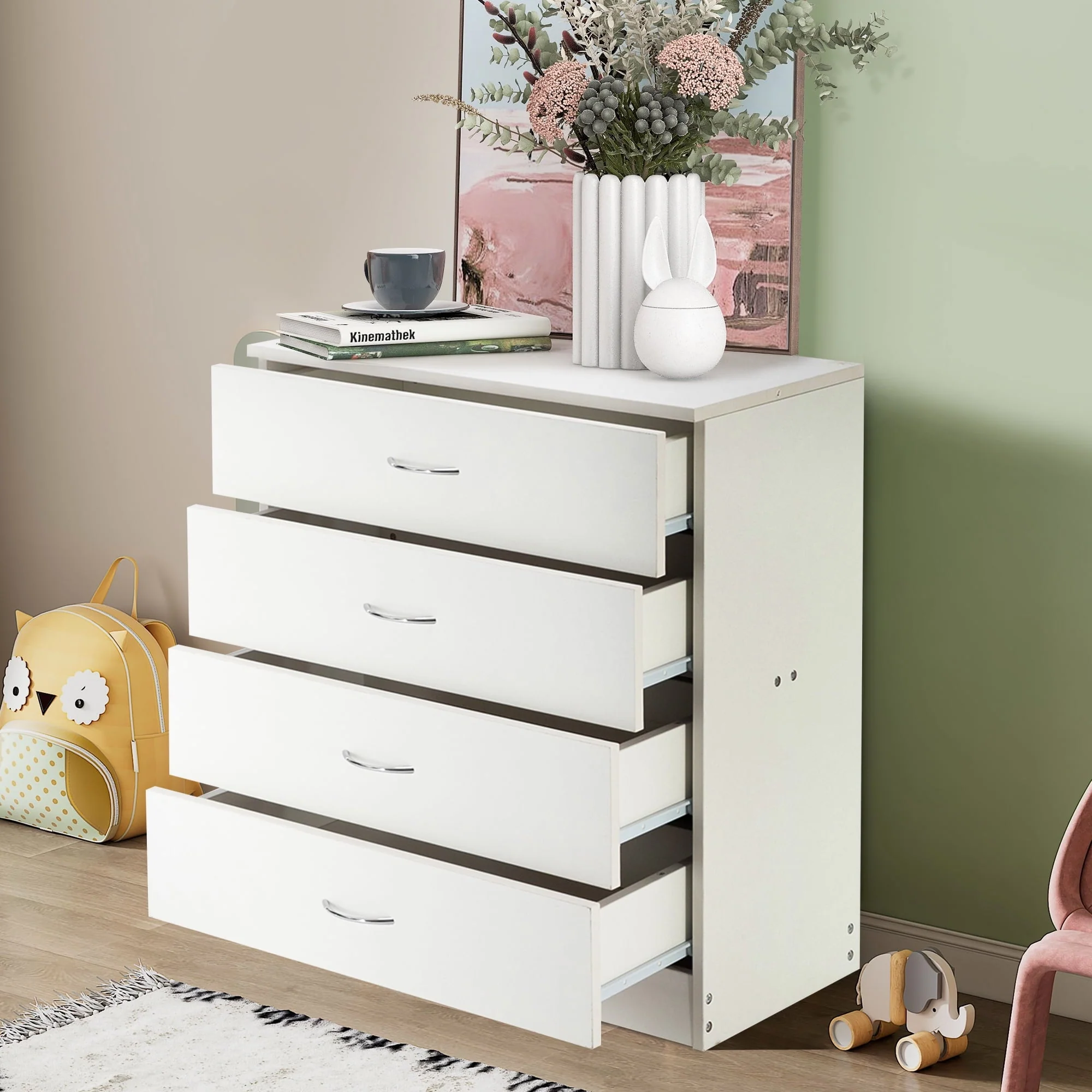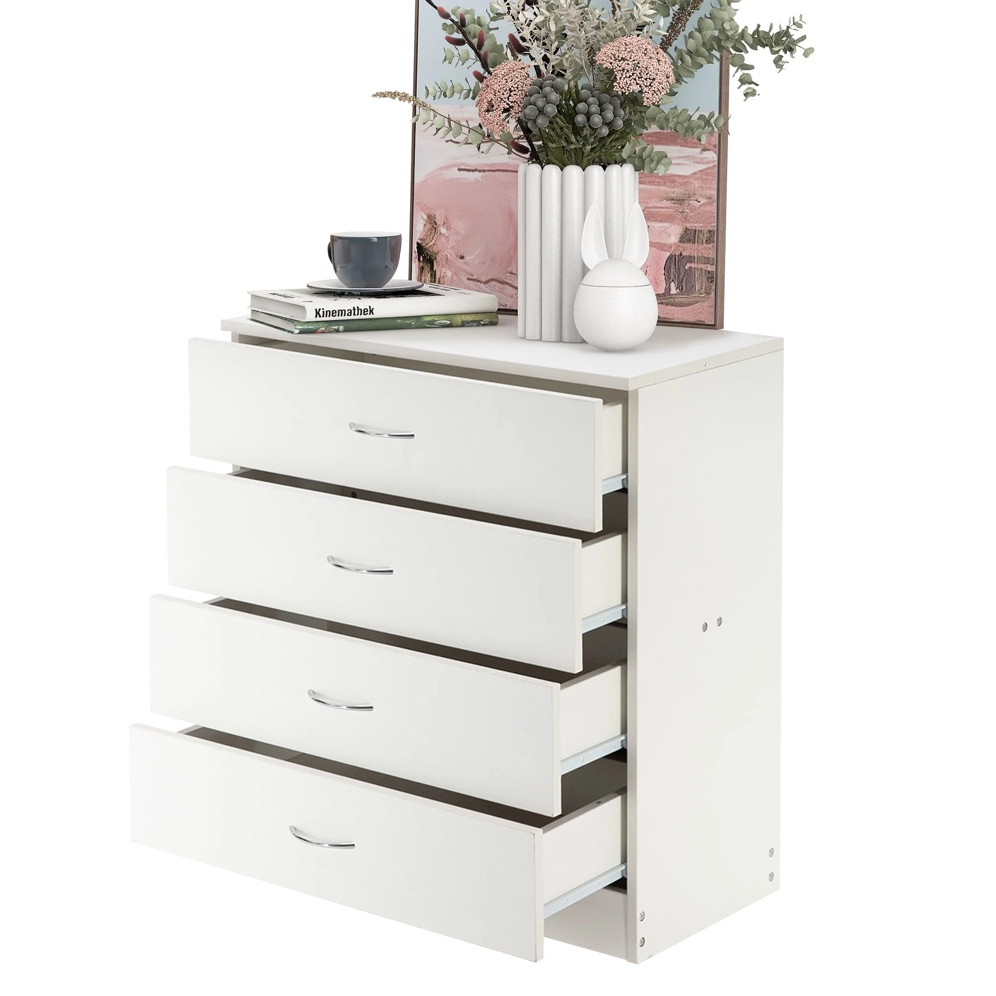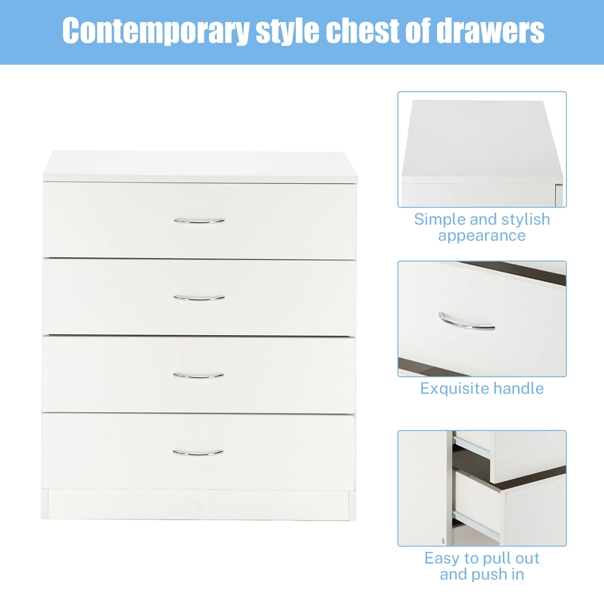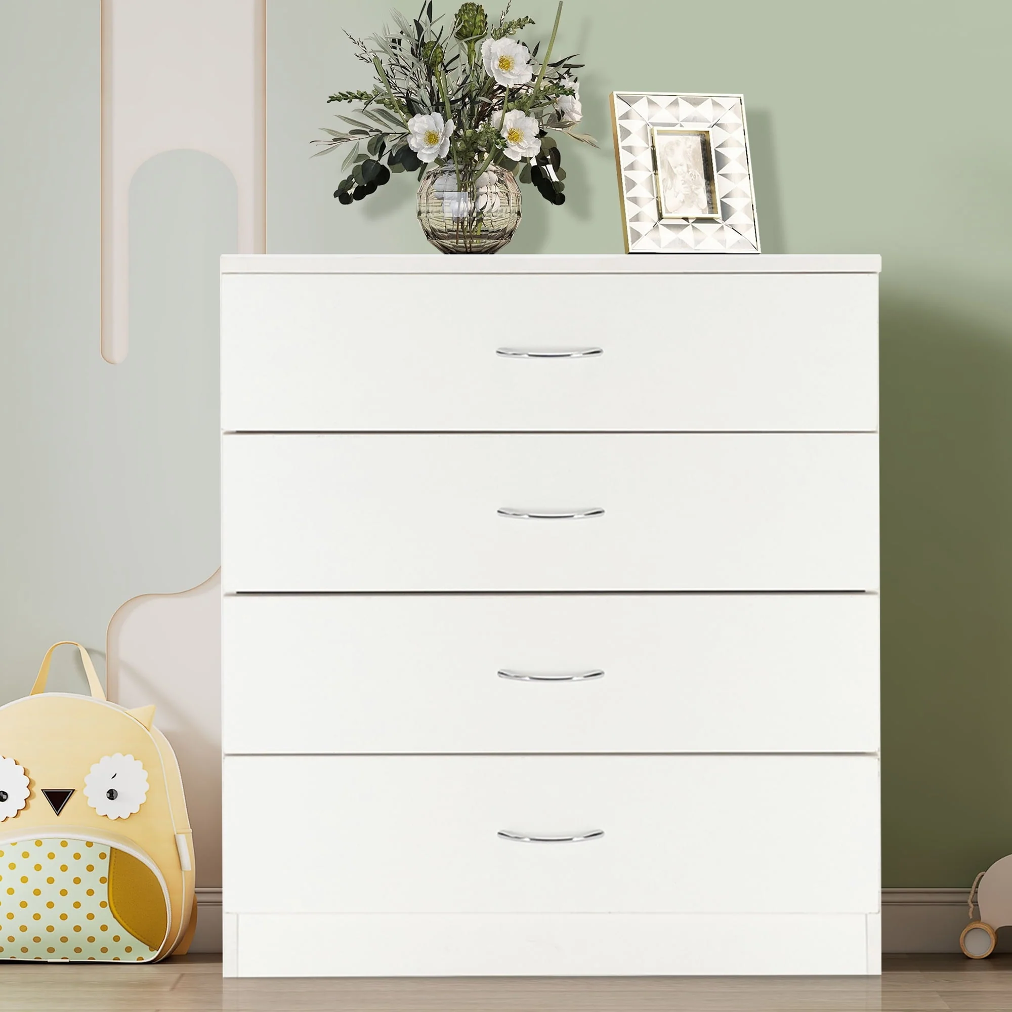 This elegant wooden 4-drawer cabinet strikes a clean-lined rectangular silhouette that features a simple and stylish appearance, adds an elegant touch to your bedroom, and blends effortlessly into any home style. Three drawers with a metal handle offer out-of-sight storage for bedside essentials, while the dresser’s top surface provides a perfect platform for a phone charger and a stylish lamp.
