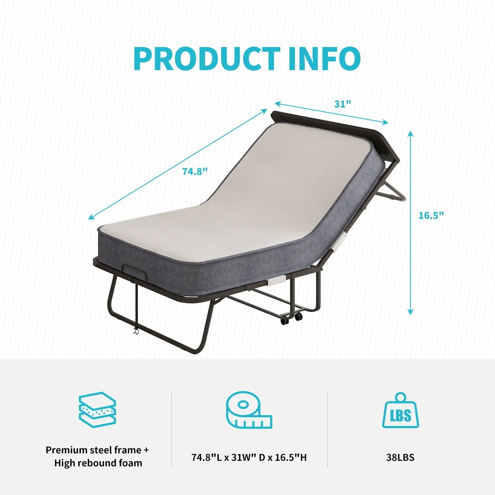 �?60 Swivel Wheels】This foldable rolling bed with mattress and headboard is equipped with four 360° swivel wheels, allowing for effortless portability. The smooth-rolling caster wheels make it easy for individuals of all ages to transport and store this bed, and it can be easily moved by one person. Additionally, the double locking casters can be engaged to prevent any slipping or movement of the bed.