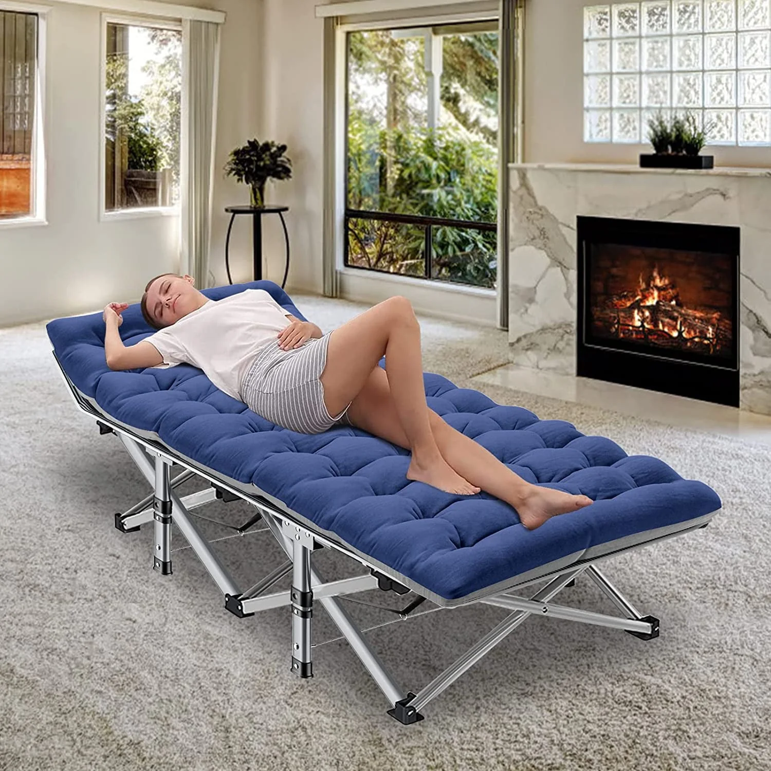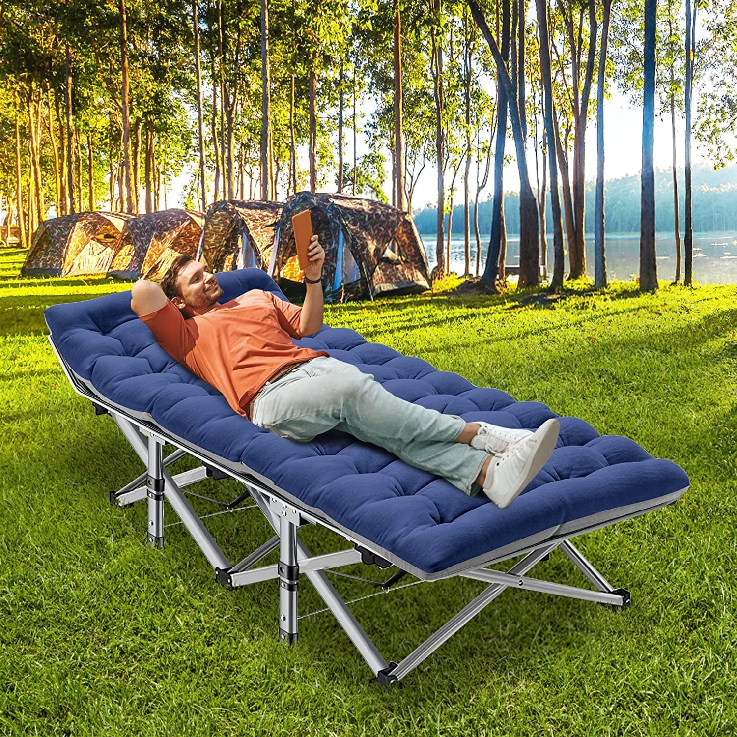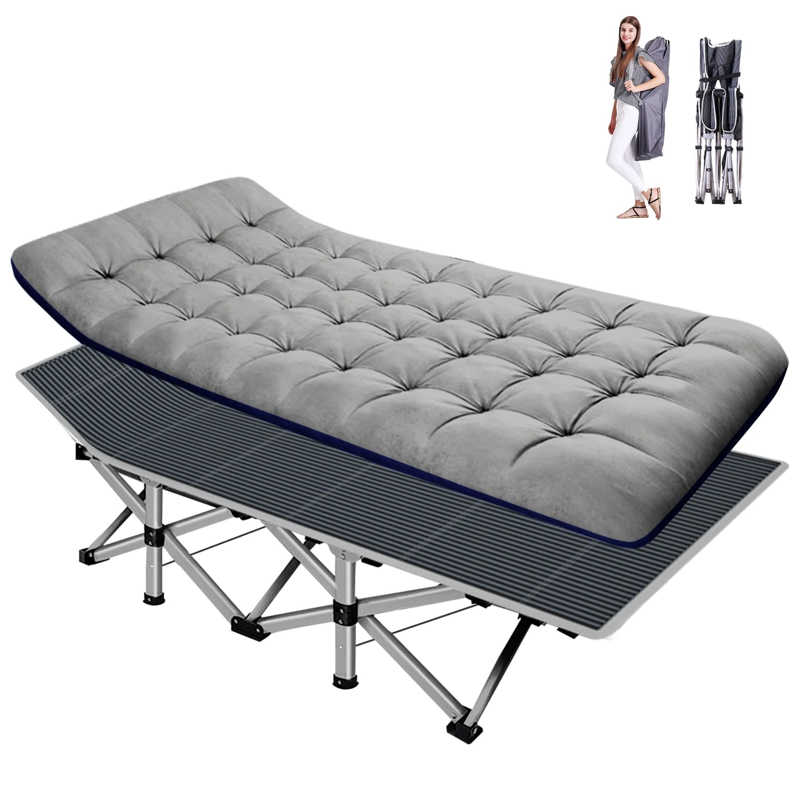 Slsy Folding Camping Cot, Lightweight Portable Heavy Duty Adult & Kids Travel Cot Supports up to 880lbs. Can bear 1 adult or 2 children sleeping on it to rest. Quality double layers 1200D polyester fabric and steel frame. Equipped with 2 Sided mattress, you can sleep more comfortably in this portable folding camping bed. Soft cushions add extra comfort, you will feel more comfortable and warm during sleep in fall and winter. In hot weather, the cushion can also be taken away for the breathable. No need for troublesome installation. Our foldable cot opens in less 10 seconds, light weight, easy-to-fold. Unfolded Dimension: 75"* 28"*14",Folded Dimension: 39'' * 8''. Weighs approximately 17 pounds. A carry bag with a handle is available. Easy to take it out for camping. Great folding cot,outdoor cot,camping cot with mattress, for hiking, camping, traveling, hunting; or as a snap cot in the office; also a perfect temporary bed when guests visit your home.