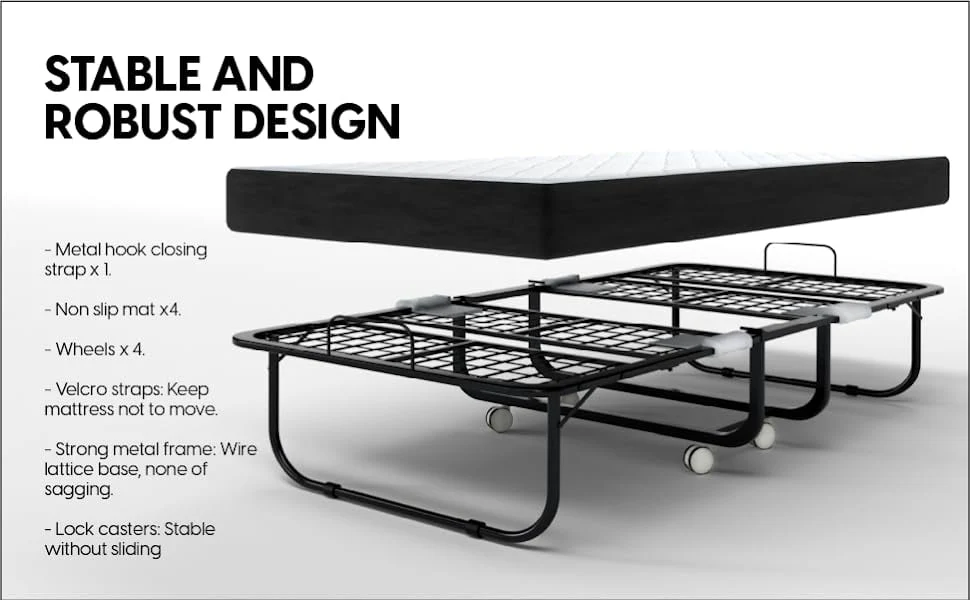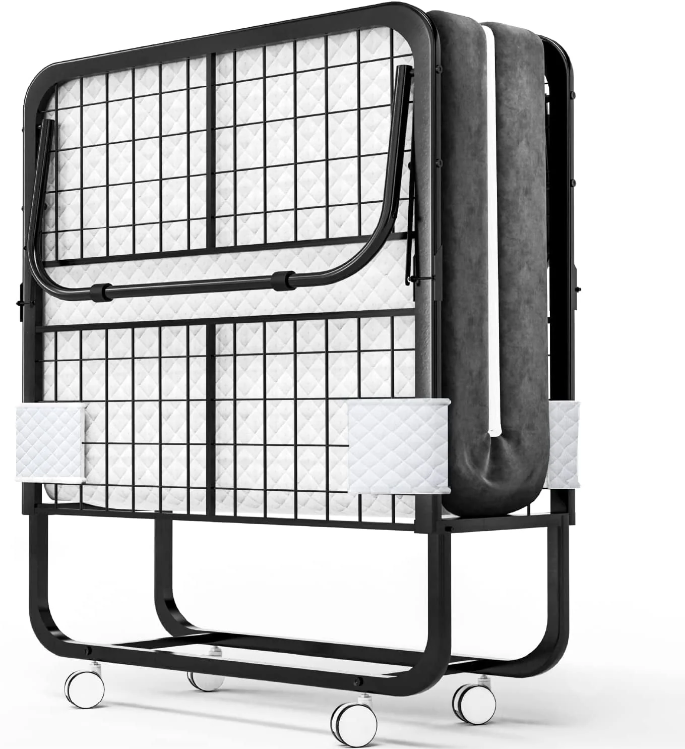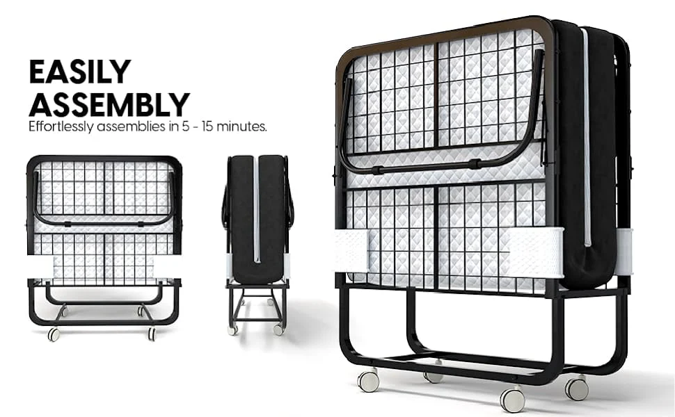 Fold Up Bed for Easy Storage - 75x31" Twin Size Bed Frame The 4 smooth-rolling wheels make it easy to transport anywhere.,Multi Use Bed Frame - This portable folding rollaway bed is perfect for a small apartment, guest room, dorm room, or living room. It is also ideal for workplace lounges and sleeping quarters.,Quick & Easy Assembly - Set up the folding bed with mattress for adults in 7 simple steps! Our portable folding bed comes with a manual, tools, and screws. We recommend having 2 people set it up.