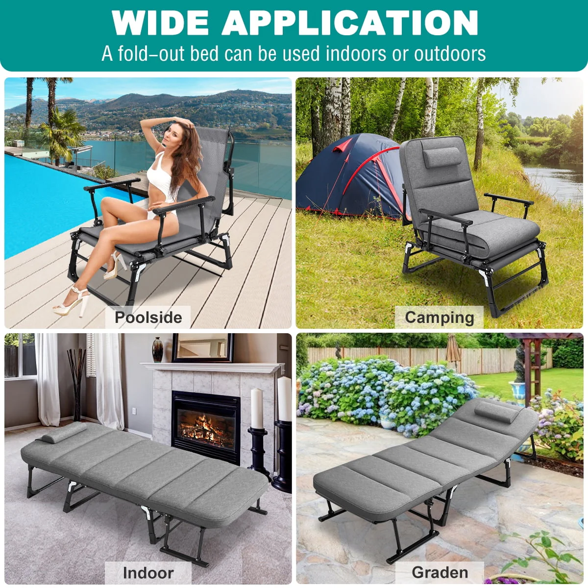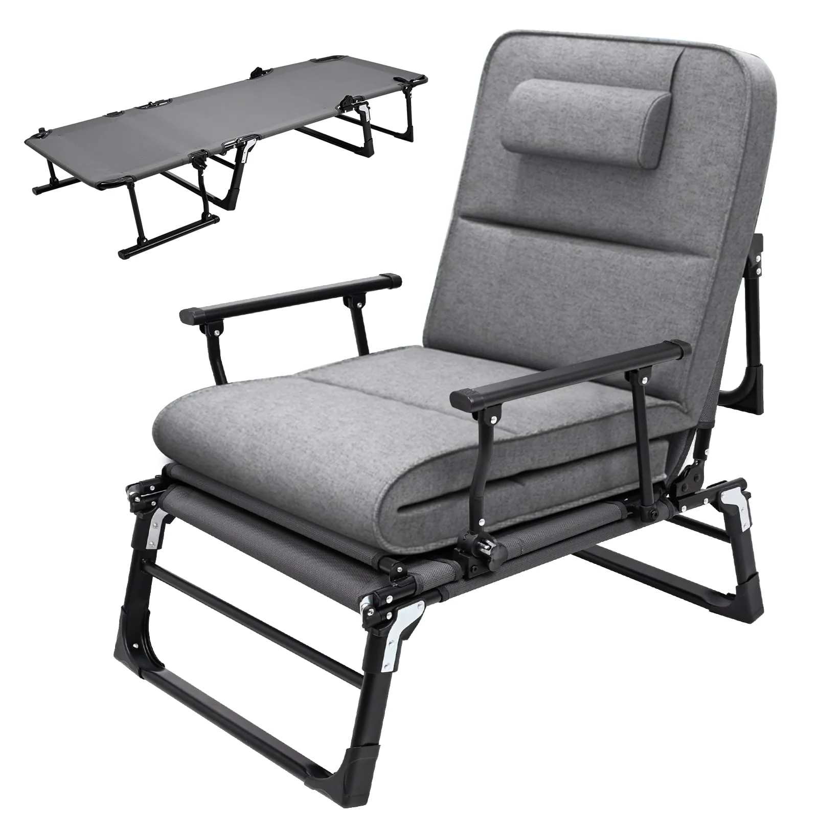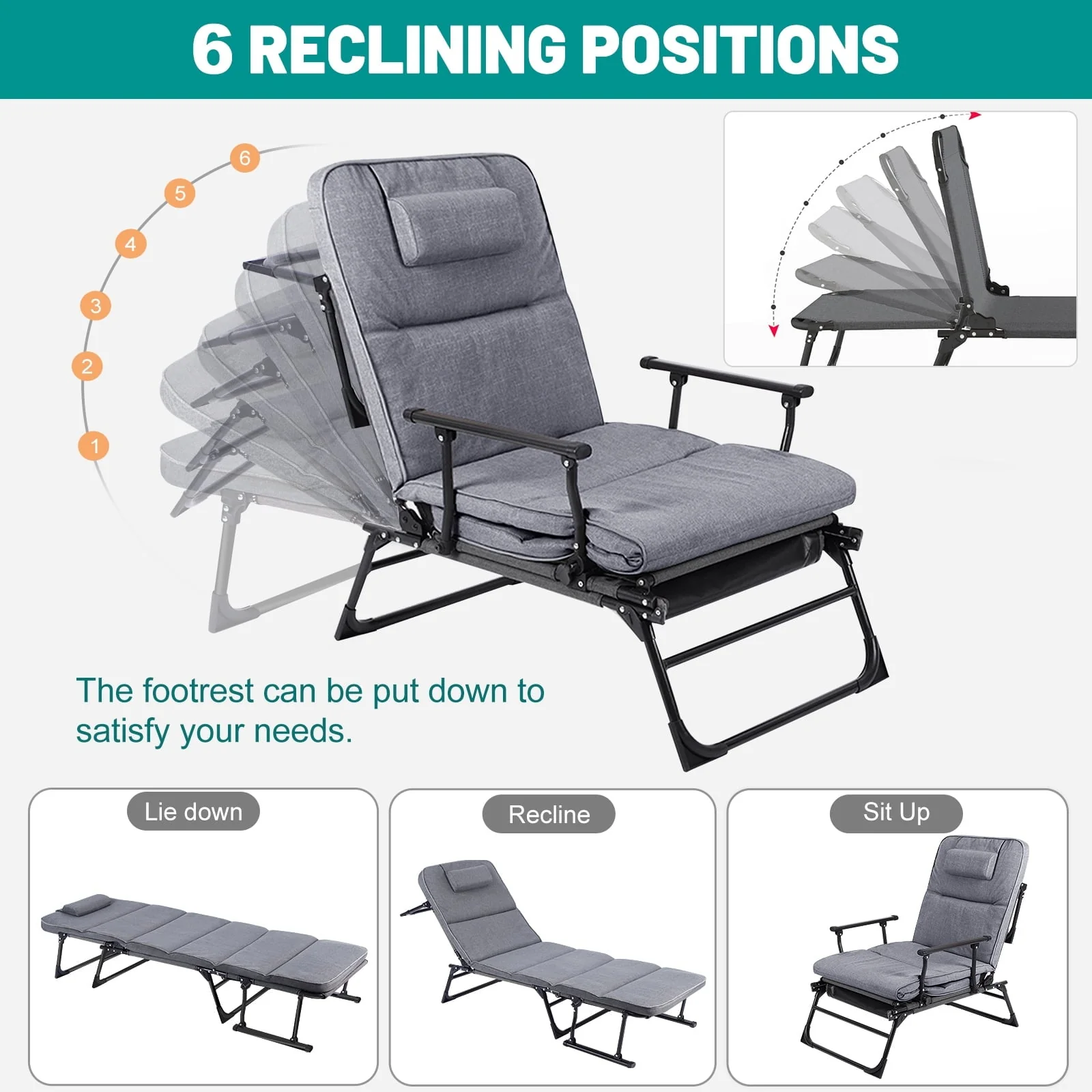 FICISOG Convertible Sleeper Chair Bed with Adjustable 6 Position Backrest. Foldable design with 3 in 1 Versatile Performance. This multifunctional folding armchair can be easily converted into a lounge sofa chair or bed to meet your different needs. Hidden legs and armrests add support to the bed, making it simple yet elegant. Equipped with a mattress, you can sleep more comfortably in this portable folding lounge chair cot. Compact, incredibly fast and easy to set up. Expanded size: 71"X24"X13", folding size is 31.5"x5.5", chair size is 23.6"x33.5"x34.6" . The armrests will provide extra support if the foldable chair is unfolded. The metal frame of the Sleeper Chair Bed is scientifically designed to be durable enough to hold up to 440 lbs. You can use this sleeping cot both inside and outside.Such as office chair, guest beds, office naps, travel rest or sunshine beach use. Excellent Choice for relaxing on the patio or beach, or as a sleeping cot while camping. You could take the folding camping cot for pool, beach, hiking, camping, traveling, hunting; or as a snap cot in the office; also a perfect temporary bed when guests visit your home.