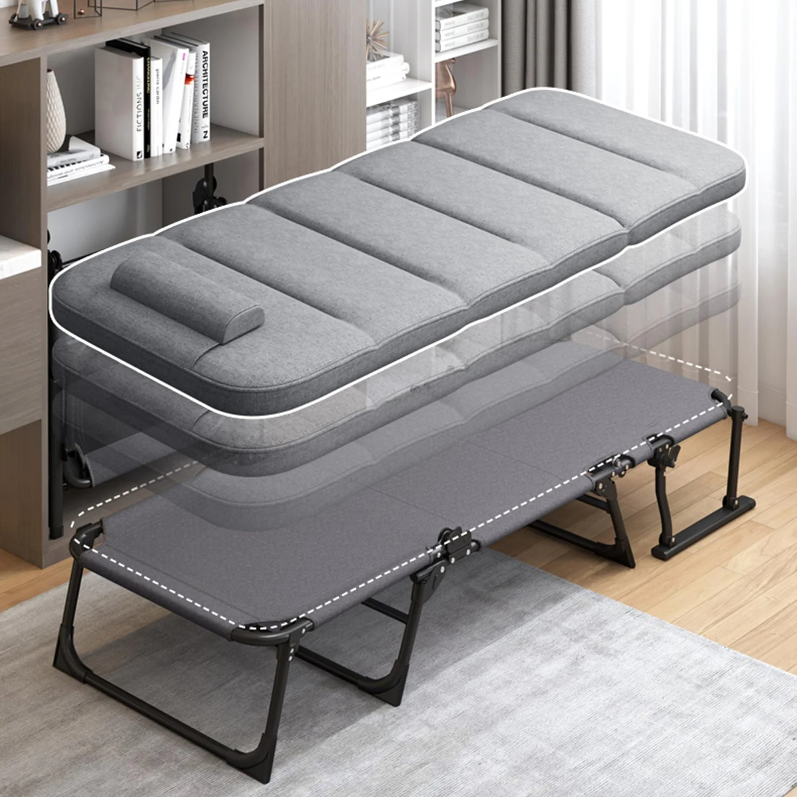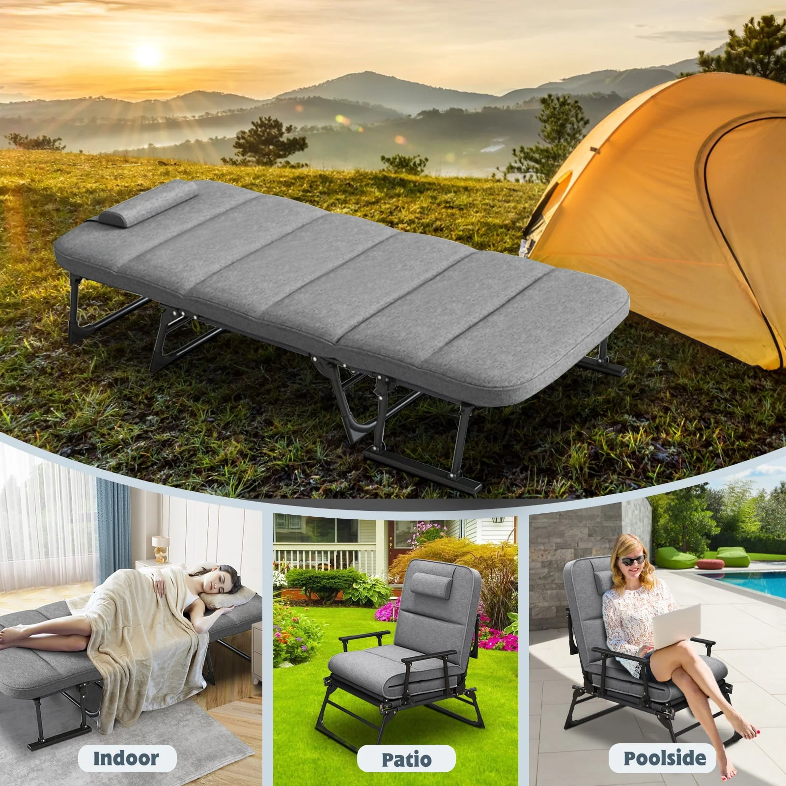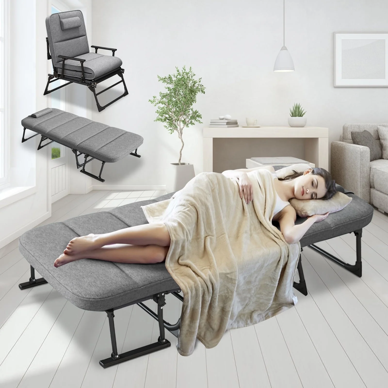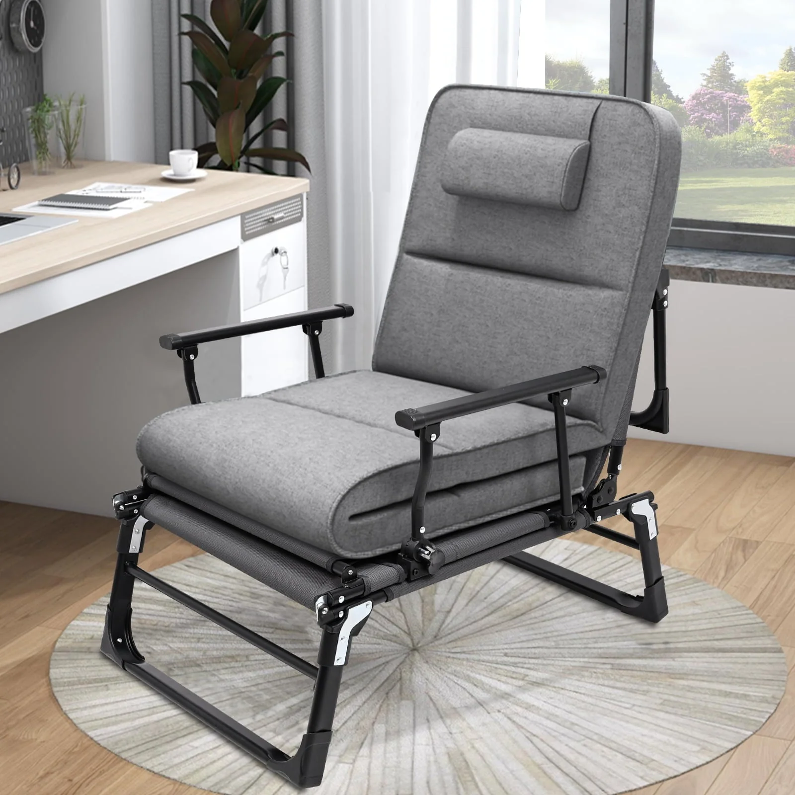 FICISOG Convertible Sleeper Chair Bed with Adjustable 6 Position Backrest. Foldable design with 3 in 1 Versatile Performance. This multifunctional folding armchair can be easily converted into a lounge sofa chair or bed to meet your different needs. Hidden legs and armrests add support to the bed, making it simple yet elegant. Equipped with a mattress, you can sleep more comfortably in this portable folding lounge chair cot. Compact, incredibly fast and easy to set up. Expanded size: 71"X24"X13", folding size is 31.5"x5.5", chair size is 23.6"x33.5"x34.6" . The armrests will provide extra support if the foldable chair is unfolded. The metal frame of the Sleeper Chair Bed is scientifically designed to be durable enough to hold up to 440 lbs. You can use this sleeping cot both inside and outside.Such as office chair, guest beds, office naps, travel rest or sunshine beach use. Excellent Choice for relaxing on the patio or beach, or as a sleeping cot while camping. You could take the folding camping cot for pool, beach, hiking, camping, traveling, hunting; or as a snap cot in the office; also a perfect temporary bed when guests visit your home.