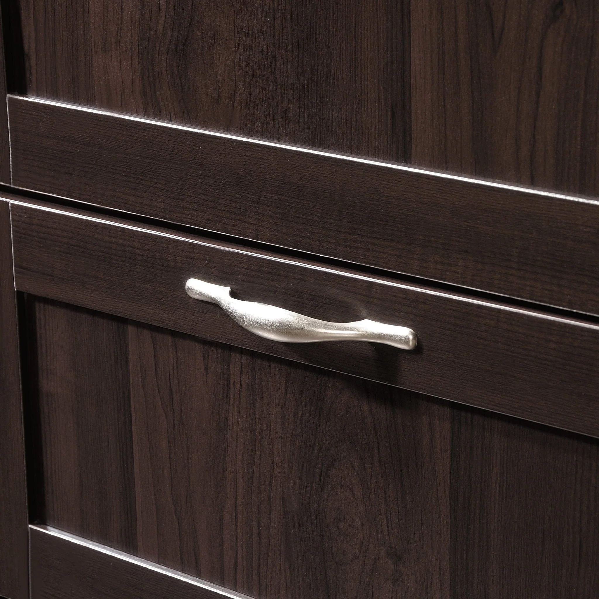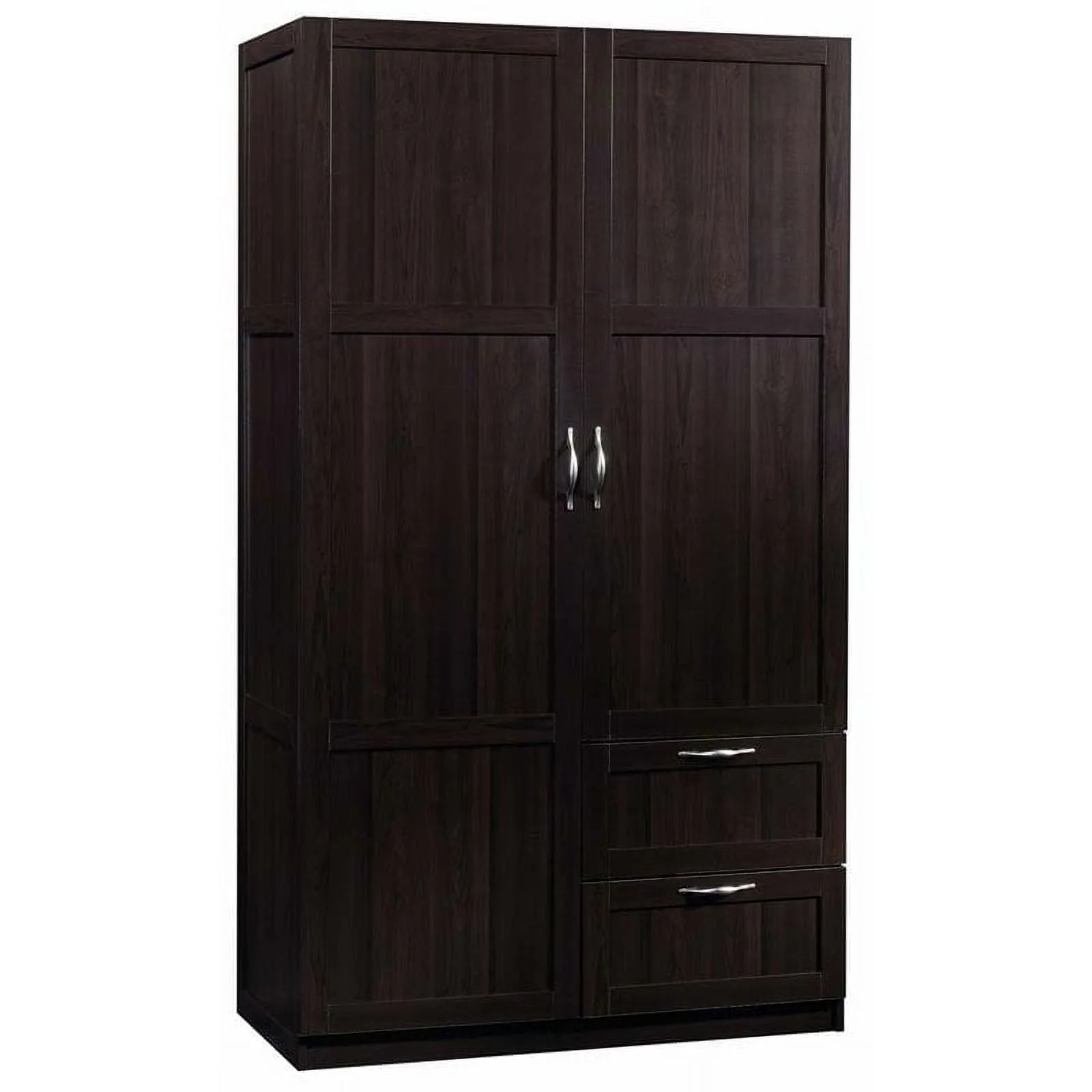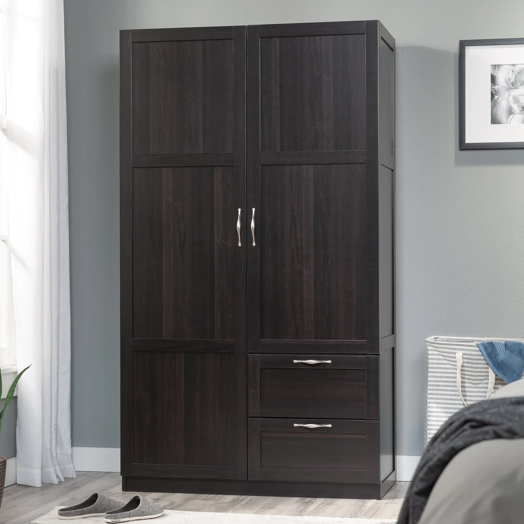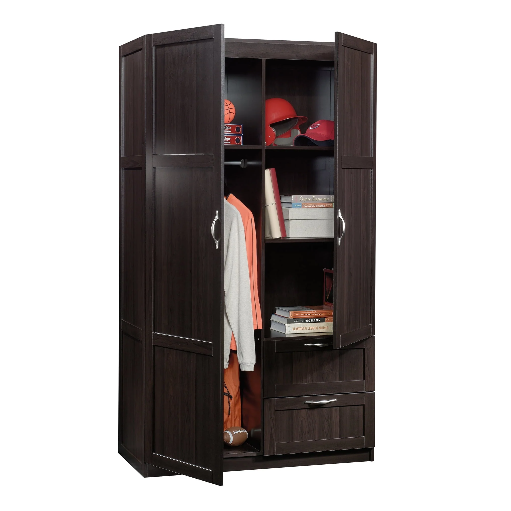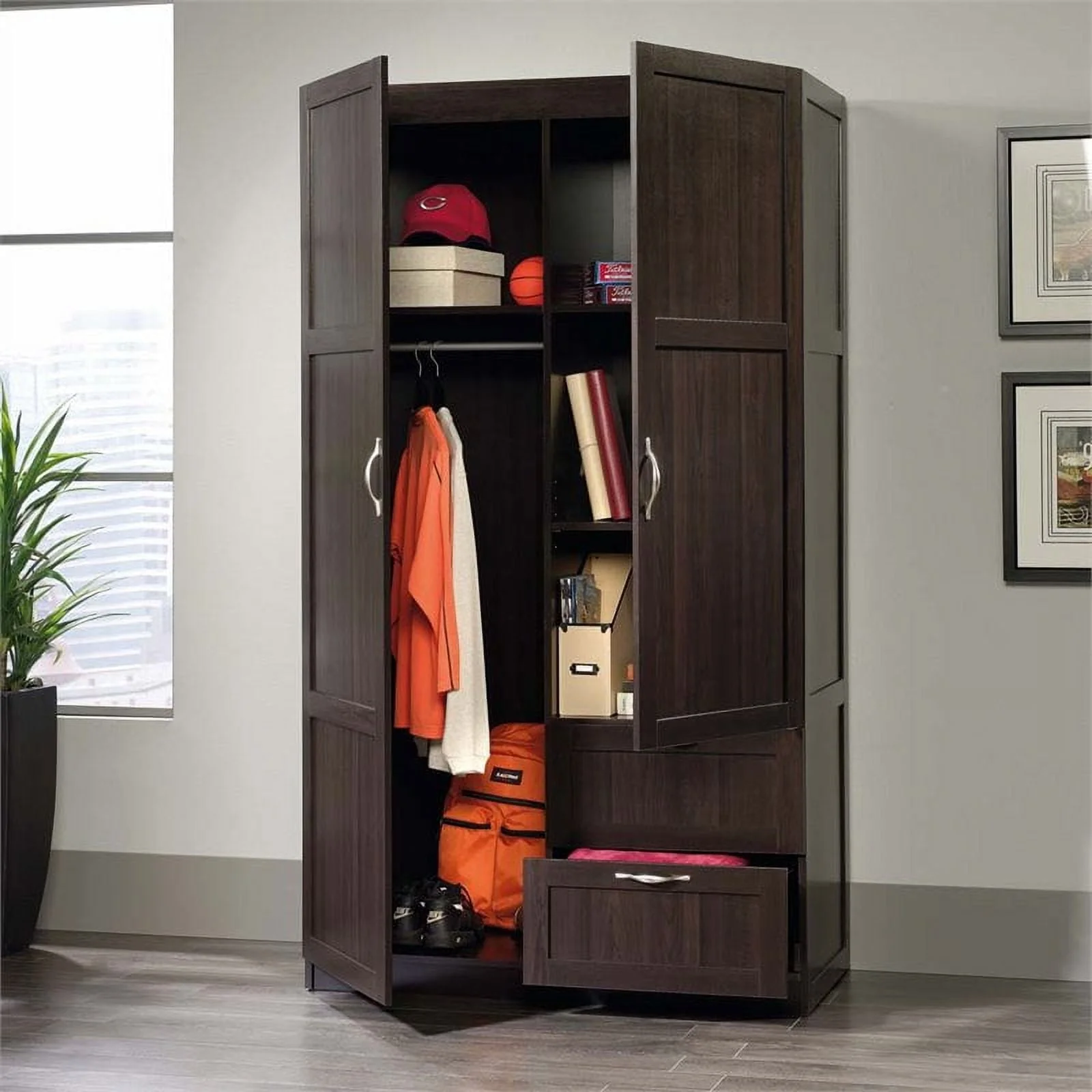Need a place to store your abundance of clothes, linens, jackets, school or work supplies, and much more? Check out this storage cabinet from Sauder Select collection. This cabinet with doors features a garment rod to hang coats, jackets, your school uniform, dress clothes, and anything that needs to be kept wrinkle free. The upper fixed shelf behind the full-length door, and one fixed and one adjustable shelf behind the upper door, give you ample room to store board games, shoes, organizing bins, seasonal outerwear, books—anything you could think of! Two lower easy-to-access sliding drawers with metal runners, create storage space for blankets, pillows, extra bed sheets and more. The storage possibilities are endless! Place this storage wardrobe in any room of your home for ample storage space. Finished in a dark Cinnamon Cherry and detailed with framed panel doors and sides, this wardrobe with drawers is the perfect storage solution for you.