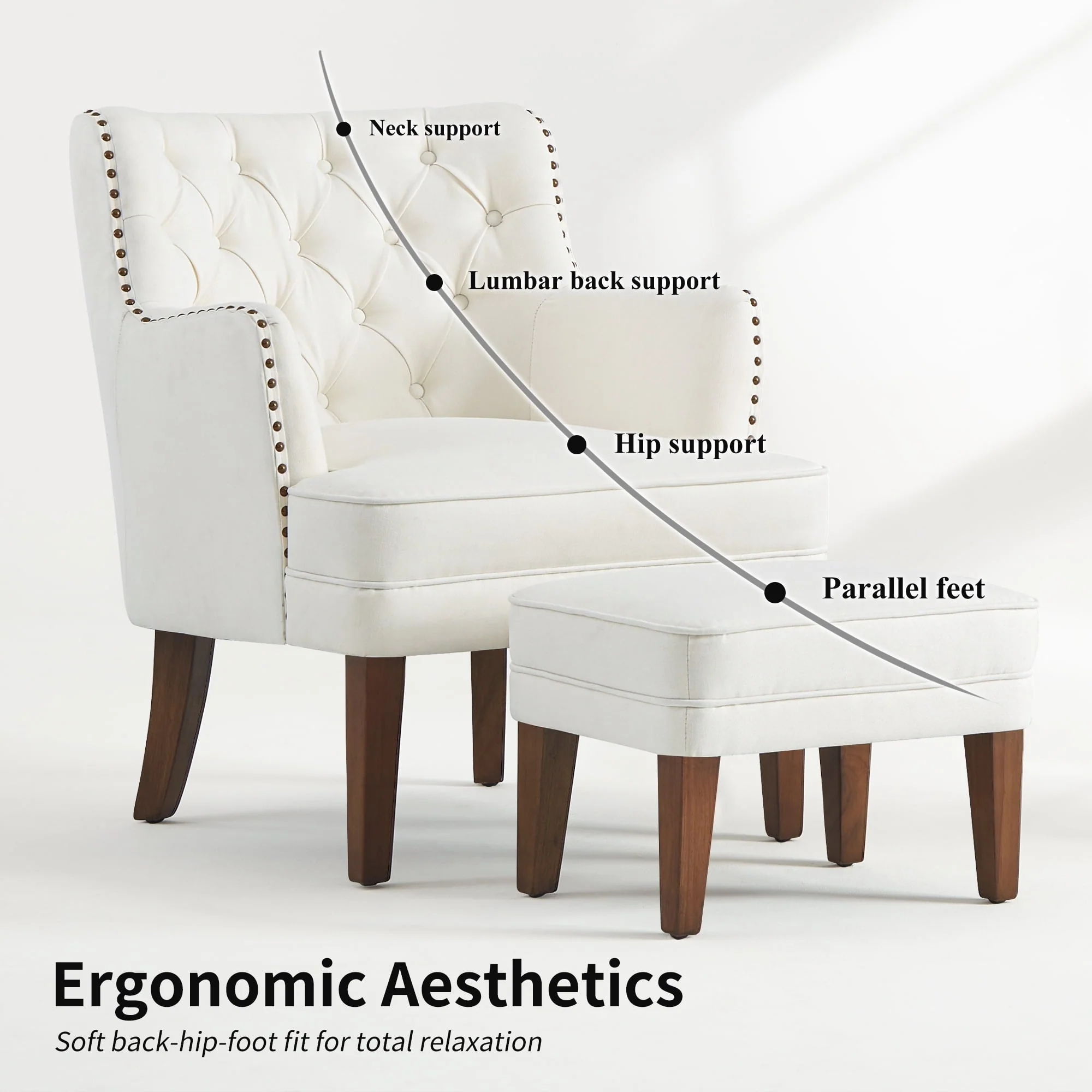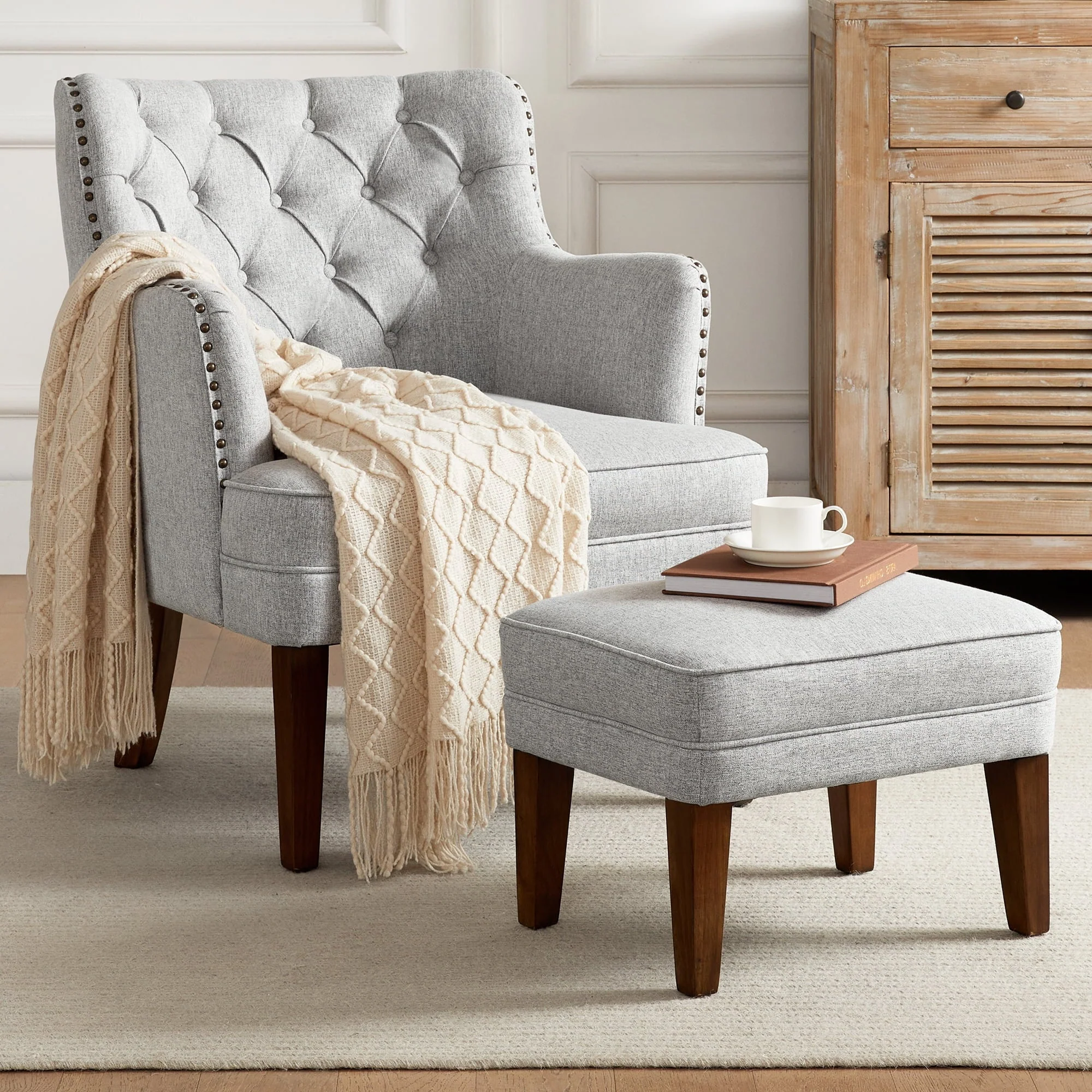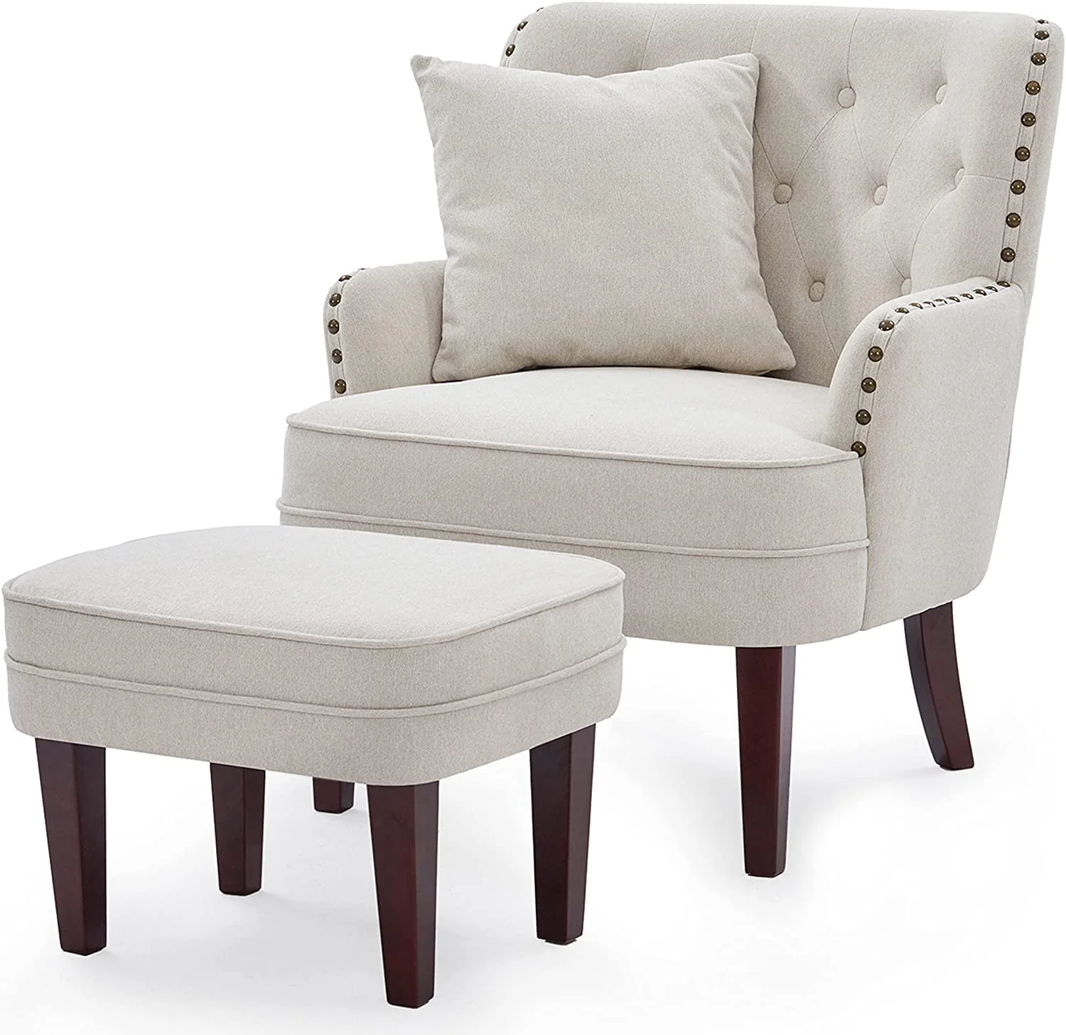 Made with plush upholstery accented with a stunning nailhead trim, our club chair and ottoman set brings a charming contemporary design to your interior space.