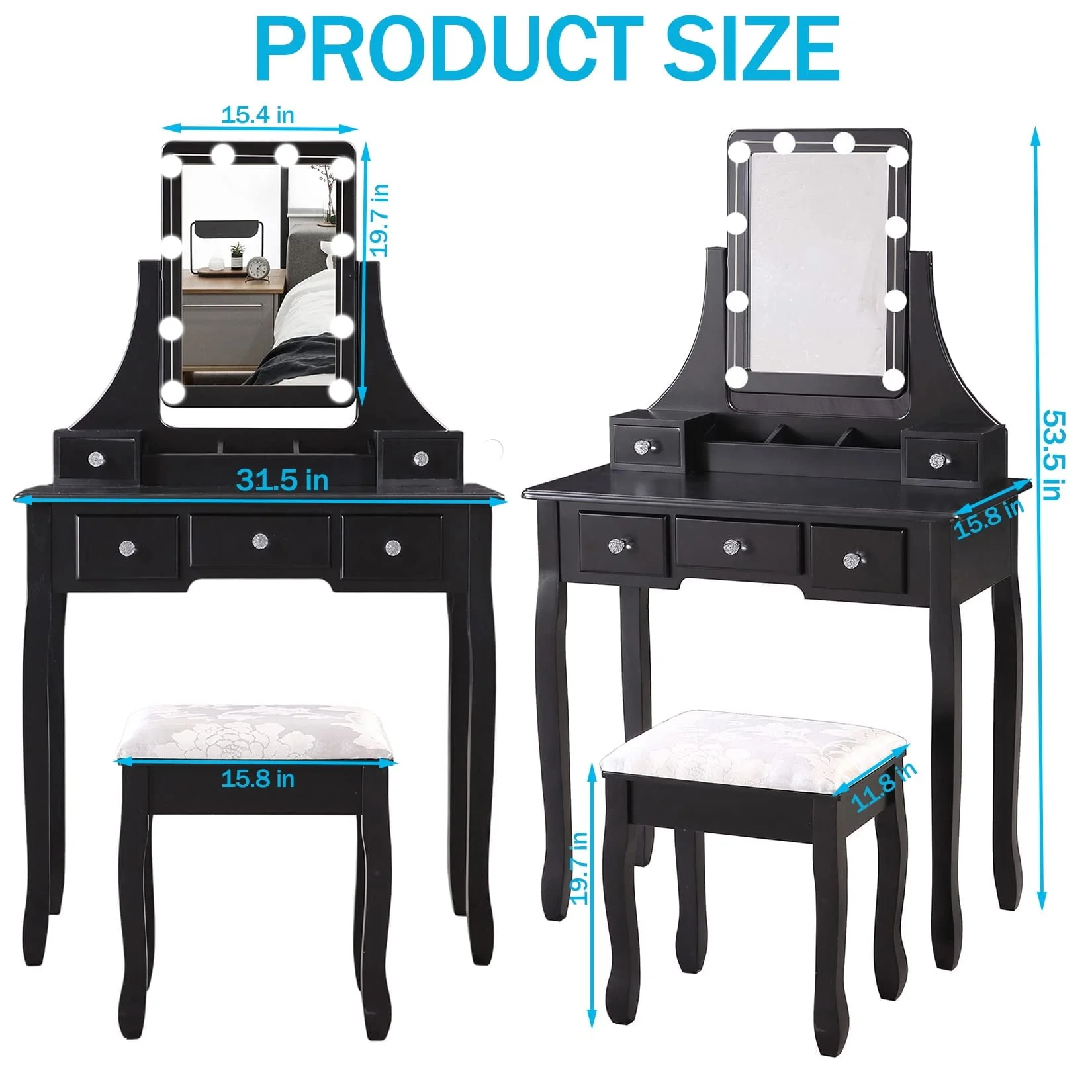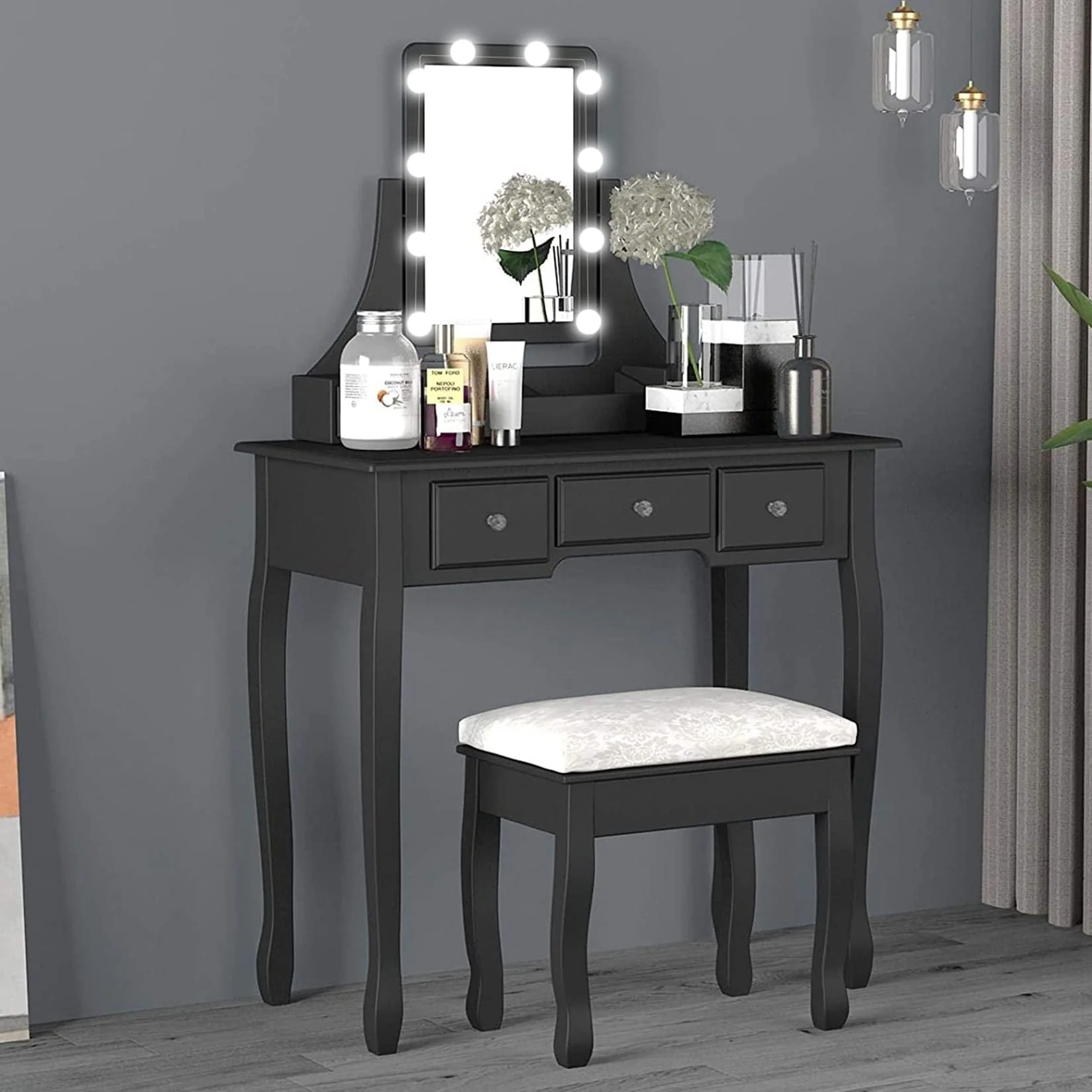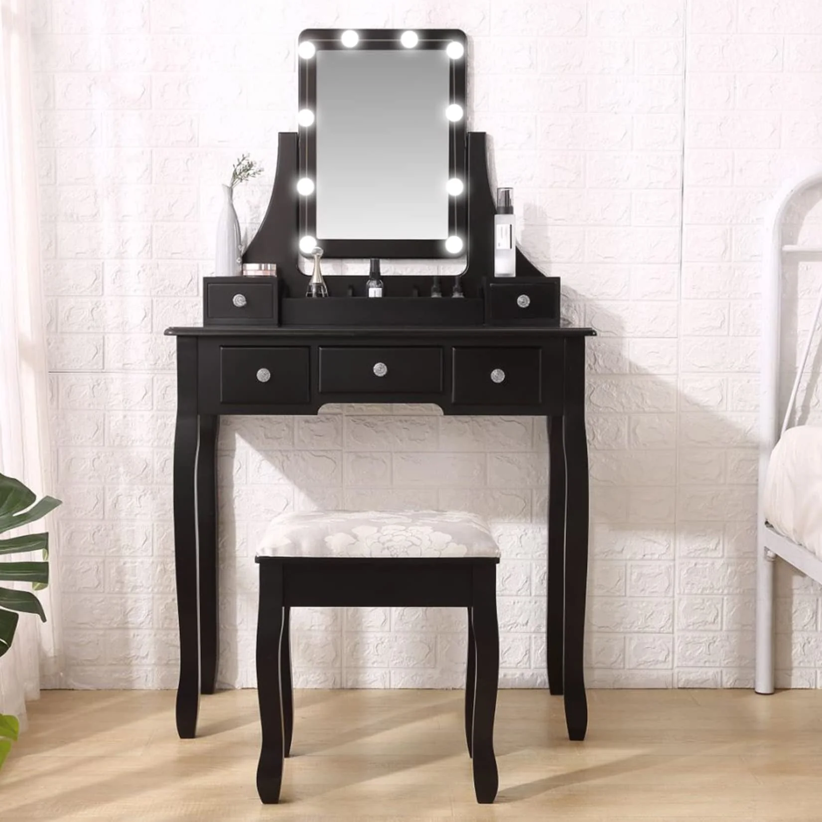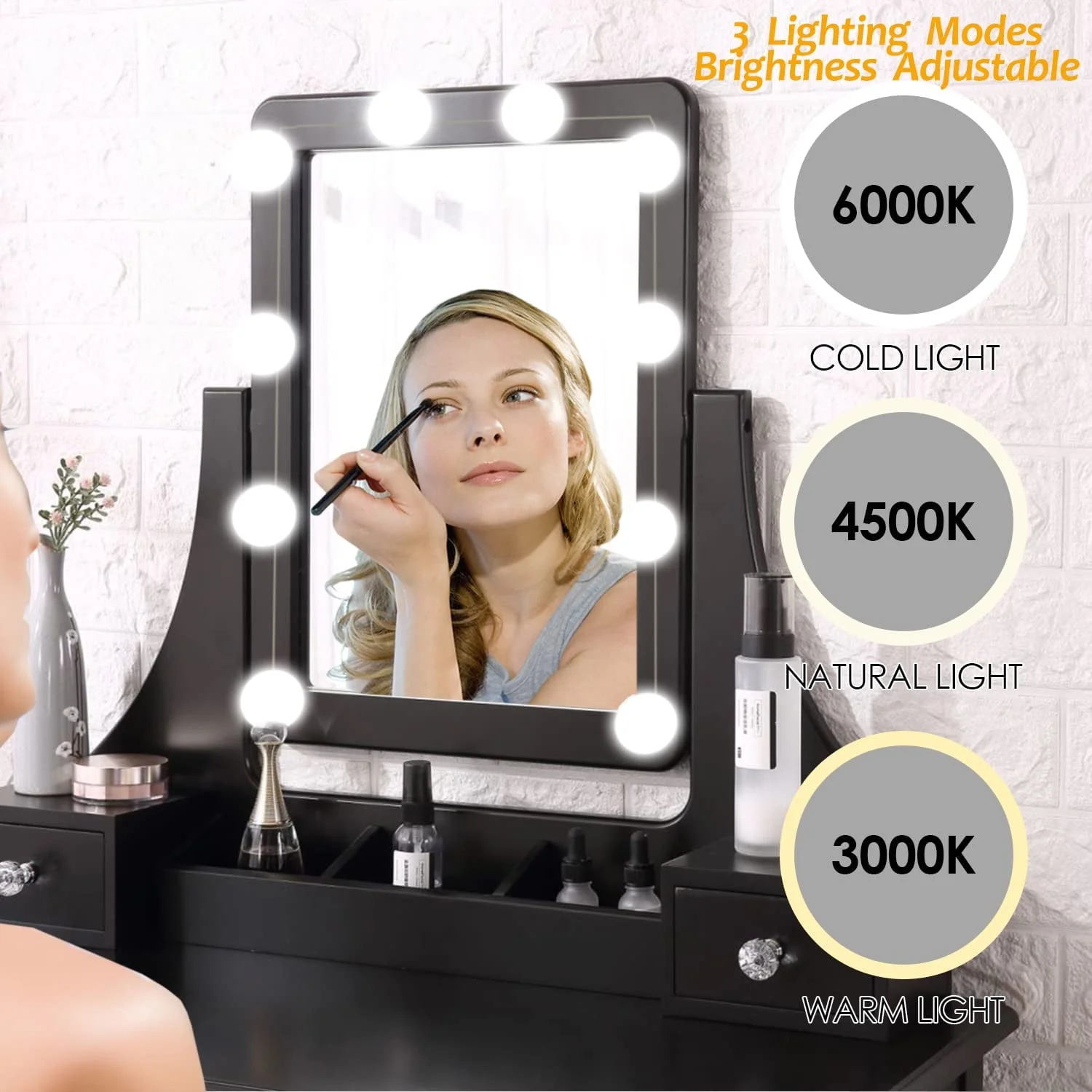 ãLIGHTED VANITY MIRRORãThe makeup vanity features a mirror with 10 LED bulbs.You can change the lighting tones from cool, warm, daylight, and dim,and you can adjust the brightness according the light condition as required.The clear and super brightness will illuminate your makeup station and ensure makeup impeccable.