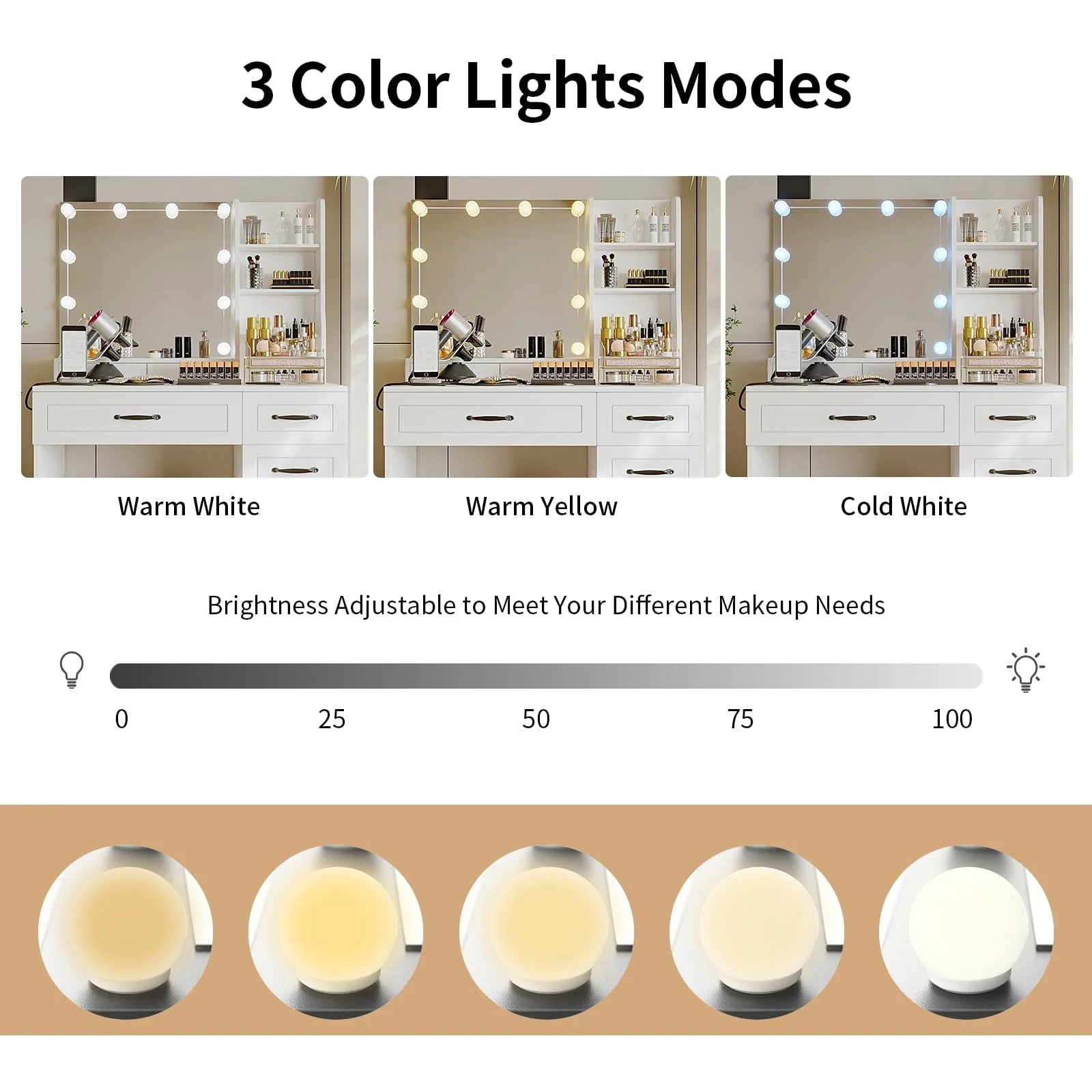 The dressing table is equipped with 10 LED bulbs, providing 3 color modes for you to switch between natural light, warm light, and cold light, with adjustable brightness to meet all your makeup needs.