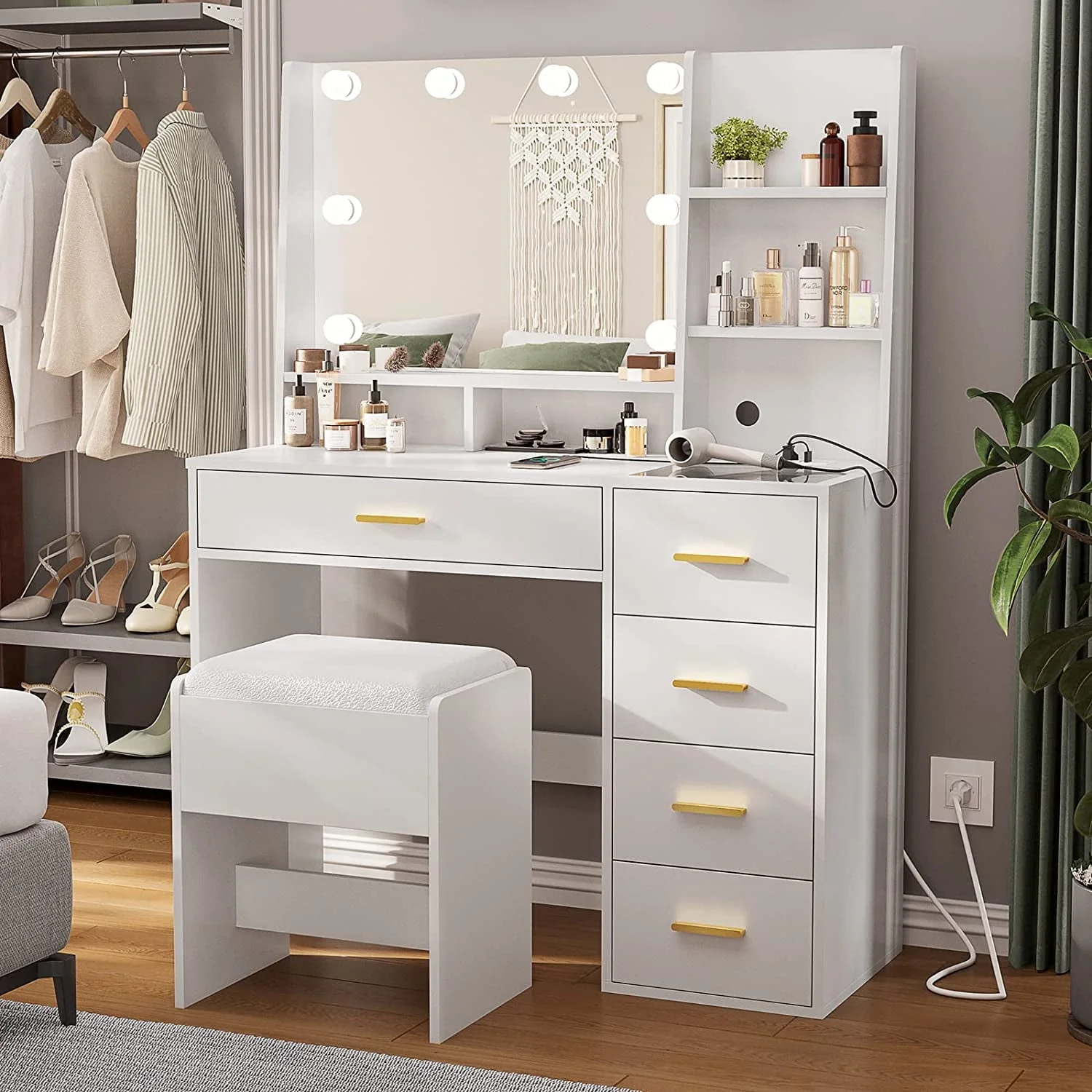 ✨Vanity Set Desk with Charging Station: This vanity mirror with lights and table set has a power strip on table top, and the charging station contains 2 USB ports and 2 sockets for you to charge your electronics in time.