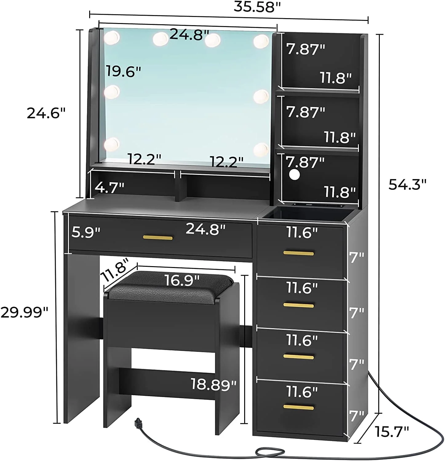 Vanity Table Size: 35.58 "L x 15.7"W x 54.3"H