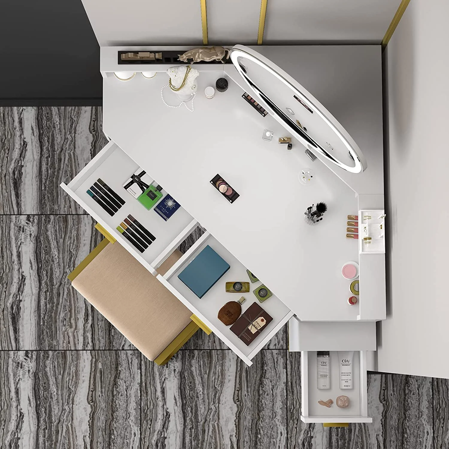 White Lighted Makeup Corner Vanity Table Set Mirrors, 3 Drawers, Cabinet & Padded Stool For women and girls, having such an eye-catching makeup vanity table with lighted mirror is their dream. The vanity table set with Mirrors, 3 Drawers, Cabinet & Padded Stool, all your beauty essentials are at hand.