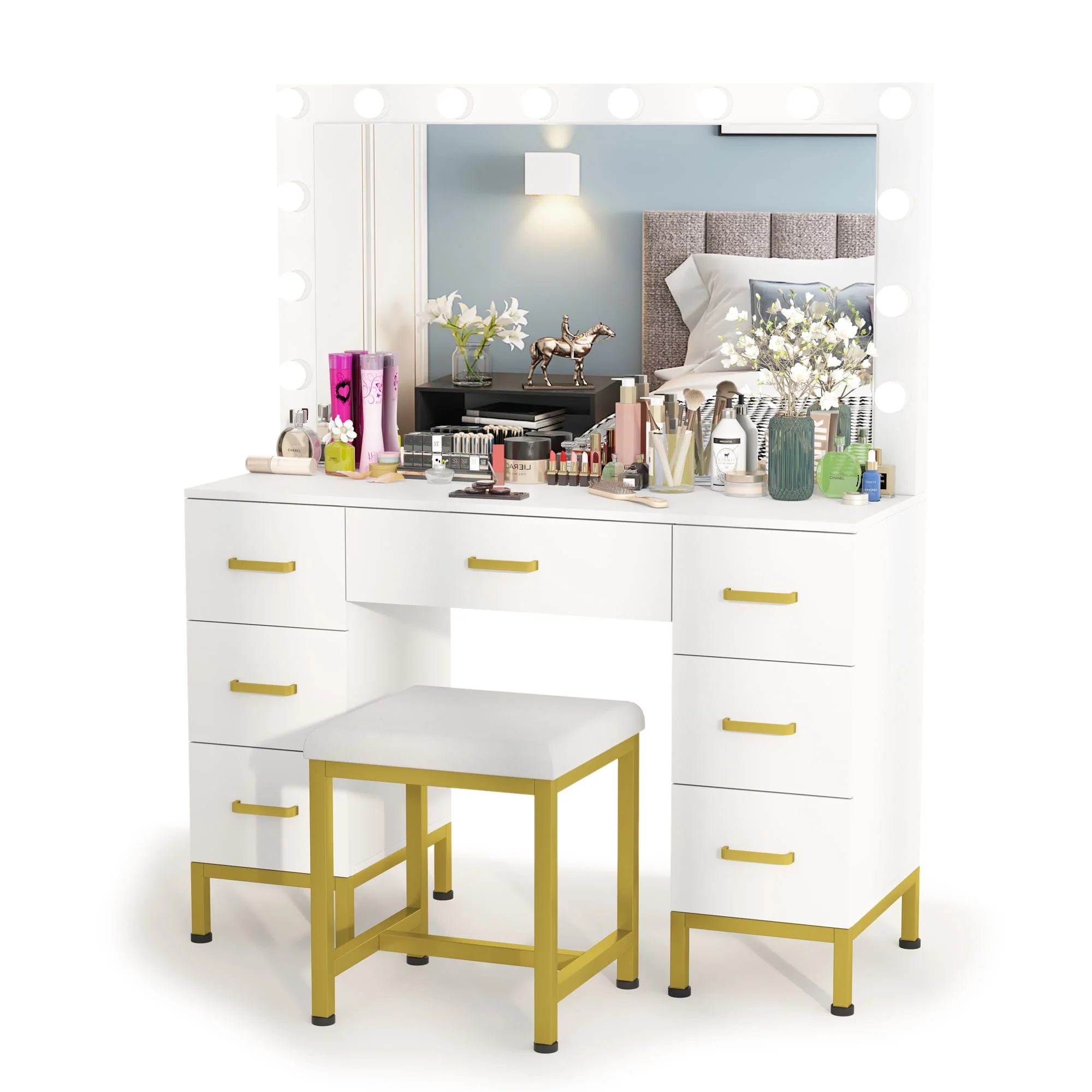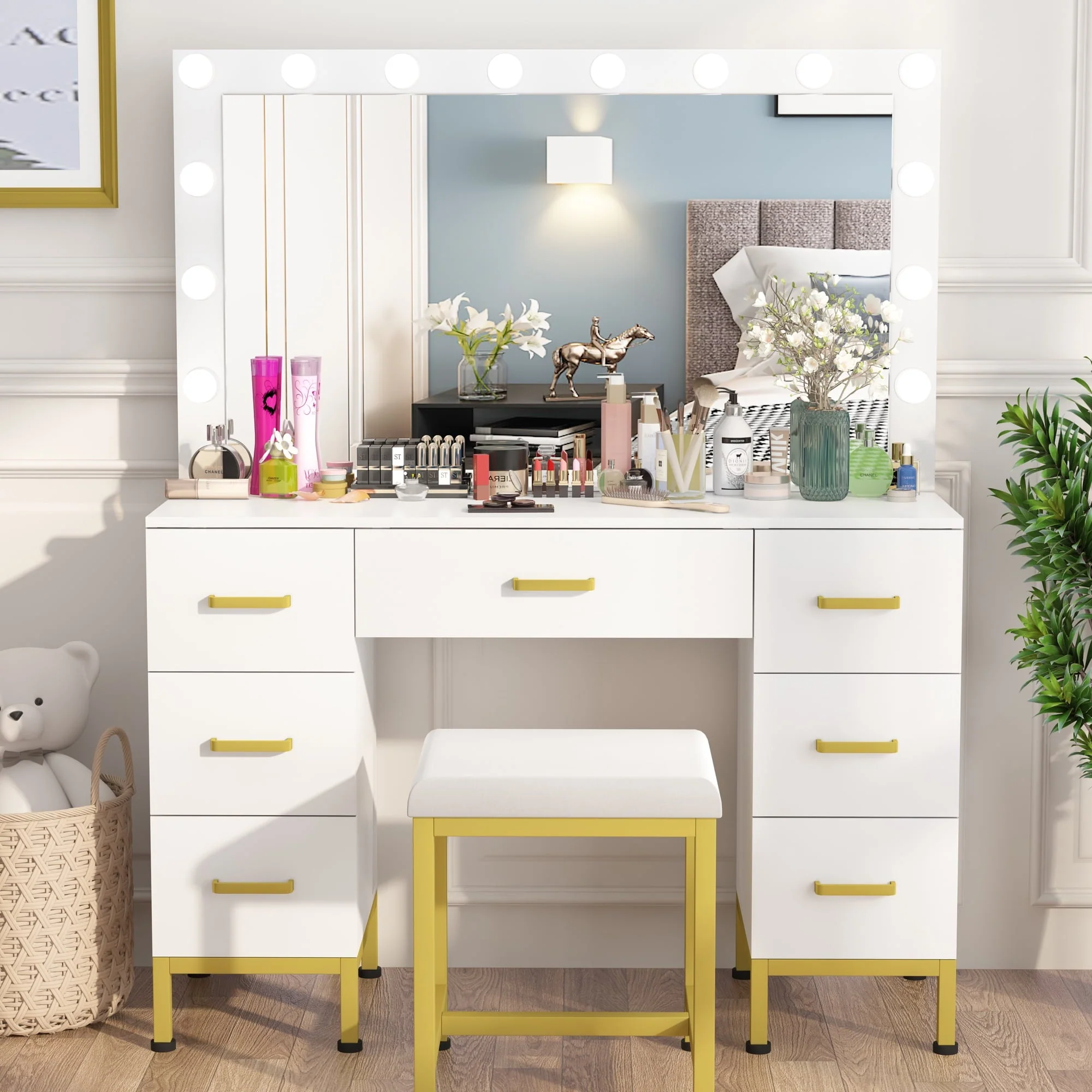 🎁【LARGE CAPACITY SPACE】Makeup vanity with 7 drawers, provides ample storage space to easily organize your makeup, jewelry and other accessories. At the same time, the dresser desktop still has a lot of space for your computer or other office supplies. Make your room neater and cleaner.