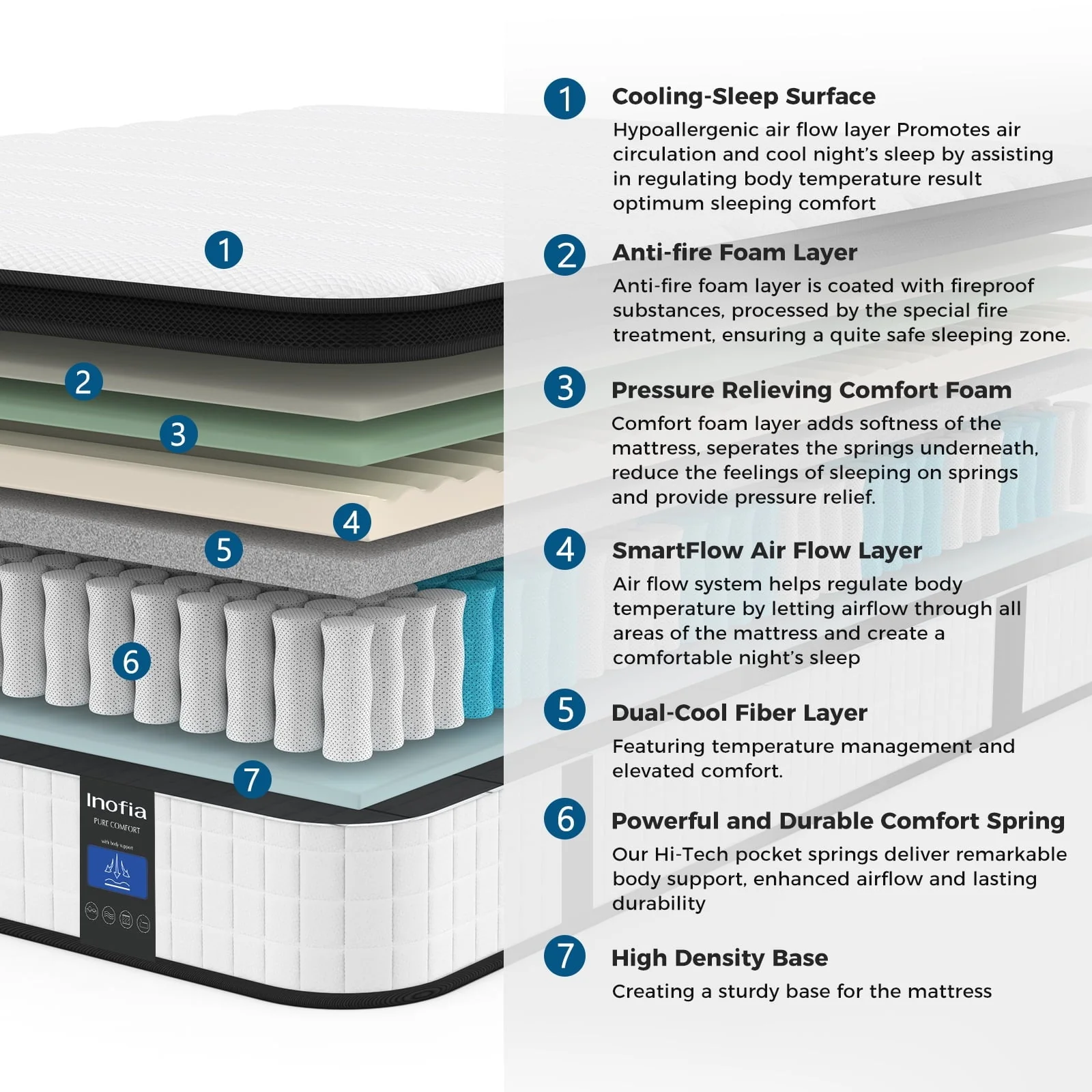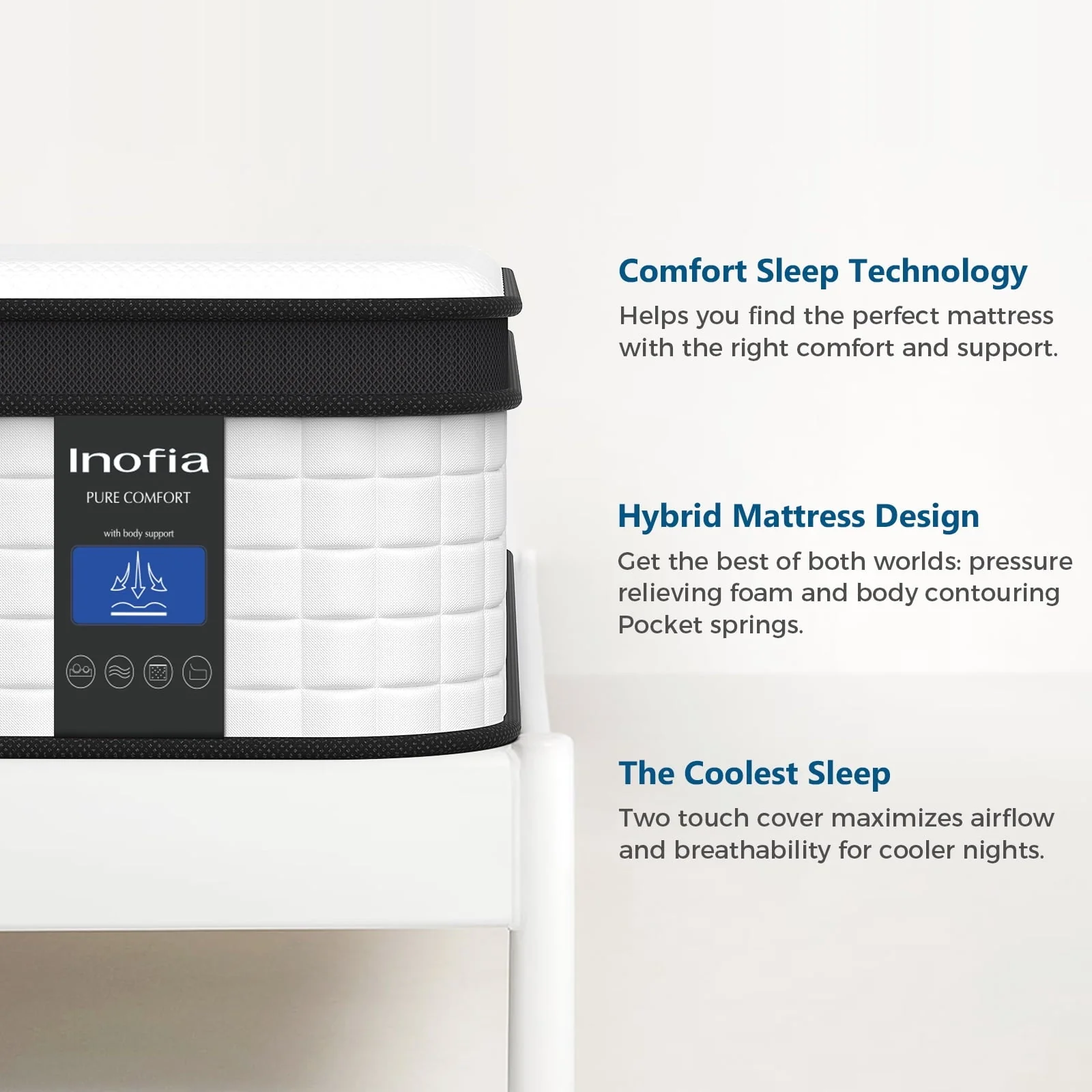The Inofia queen hybrid mattresses are designed with 7-zoned targeted support system, which will give you the best spine alignment and pressure relief. The cool cover is made of dual-layered soft knitted fabrics which are super breathable, it can help release moisture and regulate the sleeping climate. Underneath the cover, multi-layers of CertiPUR-US certified comfort foam are laid in place, creating a plush-to-sleep feel. The 7 zoned individual encased coils are positioned at the core of the mattress, conforming to the body for targeted pressure relief, offering a balanced sleep experience for many individuals. Airy mesh on the side promotes heat dissipation and independently encased coils beneath enhance airflow. Inofia double mattress is shipped rolled, compressed, and vacuum-sealed in an easy-to-handle box. It fits all frames, box springs, wood foundation, etc. even on the floor directly