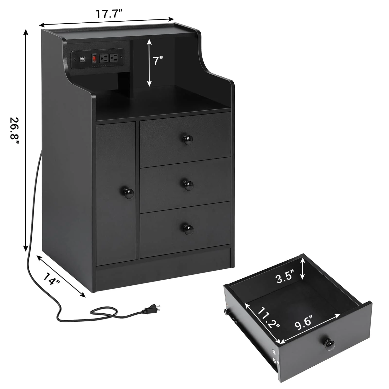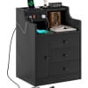 Nightstand with 3 Storage Drawers and Hutch, Black Night Stand with Charging Station End Side Table with 1 Door, Modern Bedside Table for Bedroom