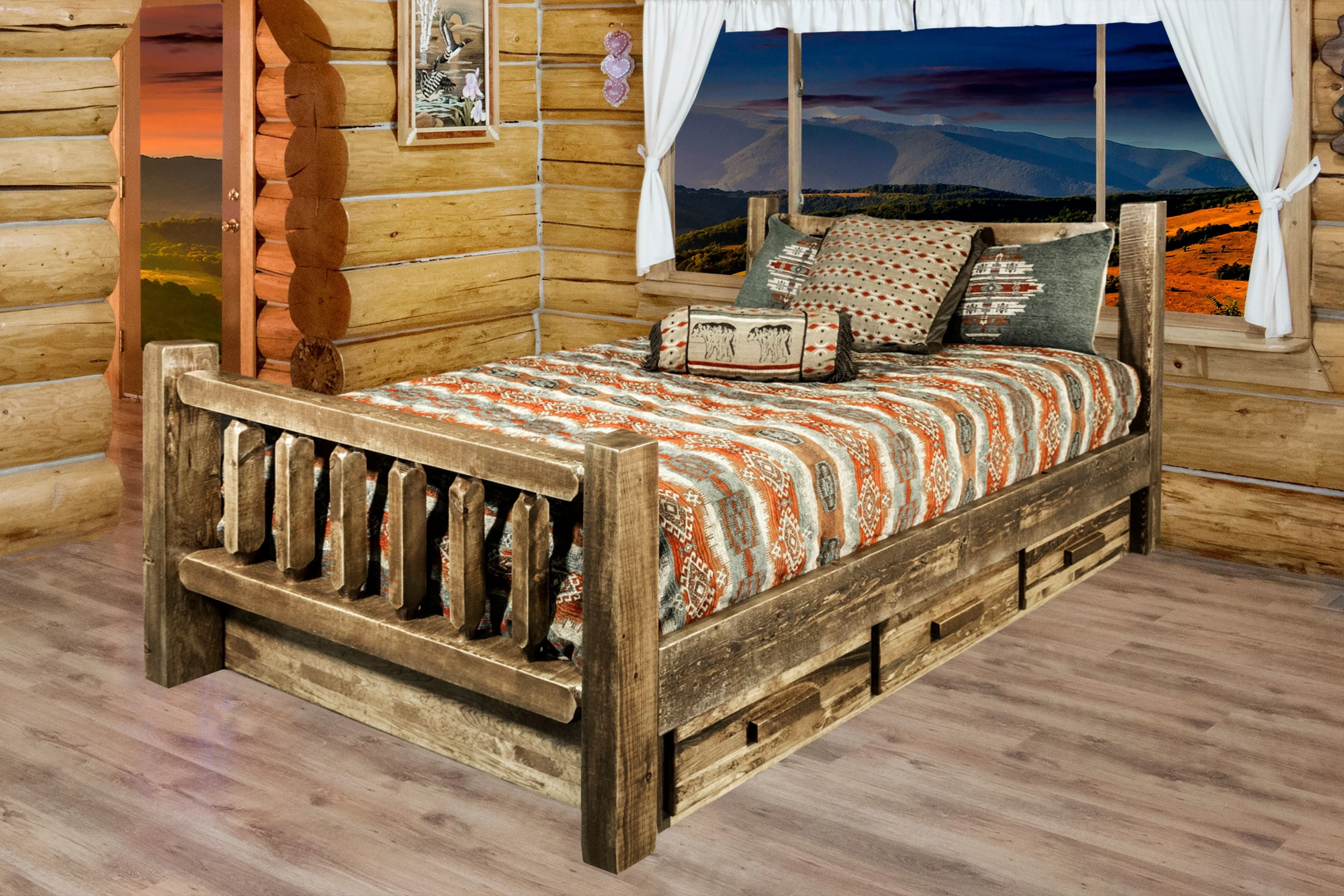 From Montana Woodworks®, the largest manufacturer of handcrafted, heirloom quality rustic furnishings in America comes the Homestead Collection line of furniture products. Handcrafted in the mountains of Montana using solid, American grown wood, the artisans rough saw all the timbers and accessory trim pieces for a look uniquely reminiscent of the timber-framed homes once found on the American frontier. This spindle style bed with storage features the tried and true mortise and tenon joinery system for the ultimate in durability and longevity. Each of the 6 drawers measure a full 21" wide,16" deep and 5.5" high and are mounted on epoxy coated metal slides for years of quiet, trouble free use. Some assembly required. Instructions and hardware included. This item comes professionally pre-finished with premium grade stain and clear lacquer. 550 pound capacity. All Montana Woodworks products come with a 20-Year limited warranty at no additional charge. Hand crafted in Montana U.S.A. using genuine lodge pole pine.