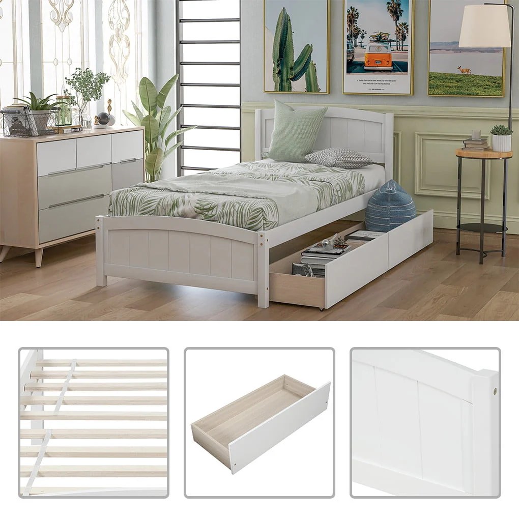 This wood platform bed with two drawers offers enough space for you to store your items well organized. The mattress foundation is constructed from high-quality material ensuring its durability and long service life. The platform bed is easy to assemble, and it is suitable for bedrooms, guest rooms, lounge rooms, and so on. No box spring is required and without need a very convenient foundation. The simple yet elegant wood bed frame is sturdy and comes with slats for extra support.