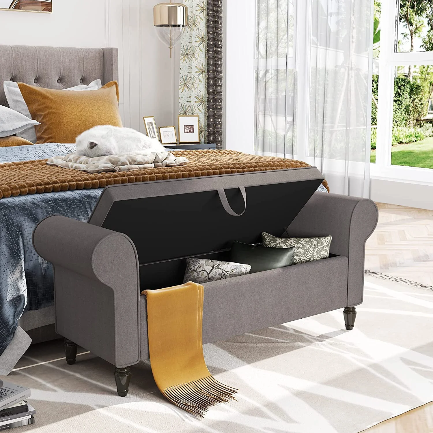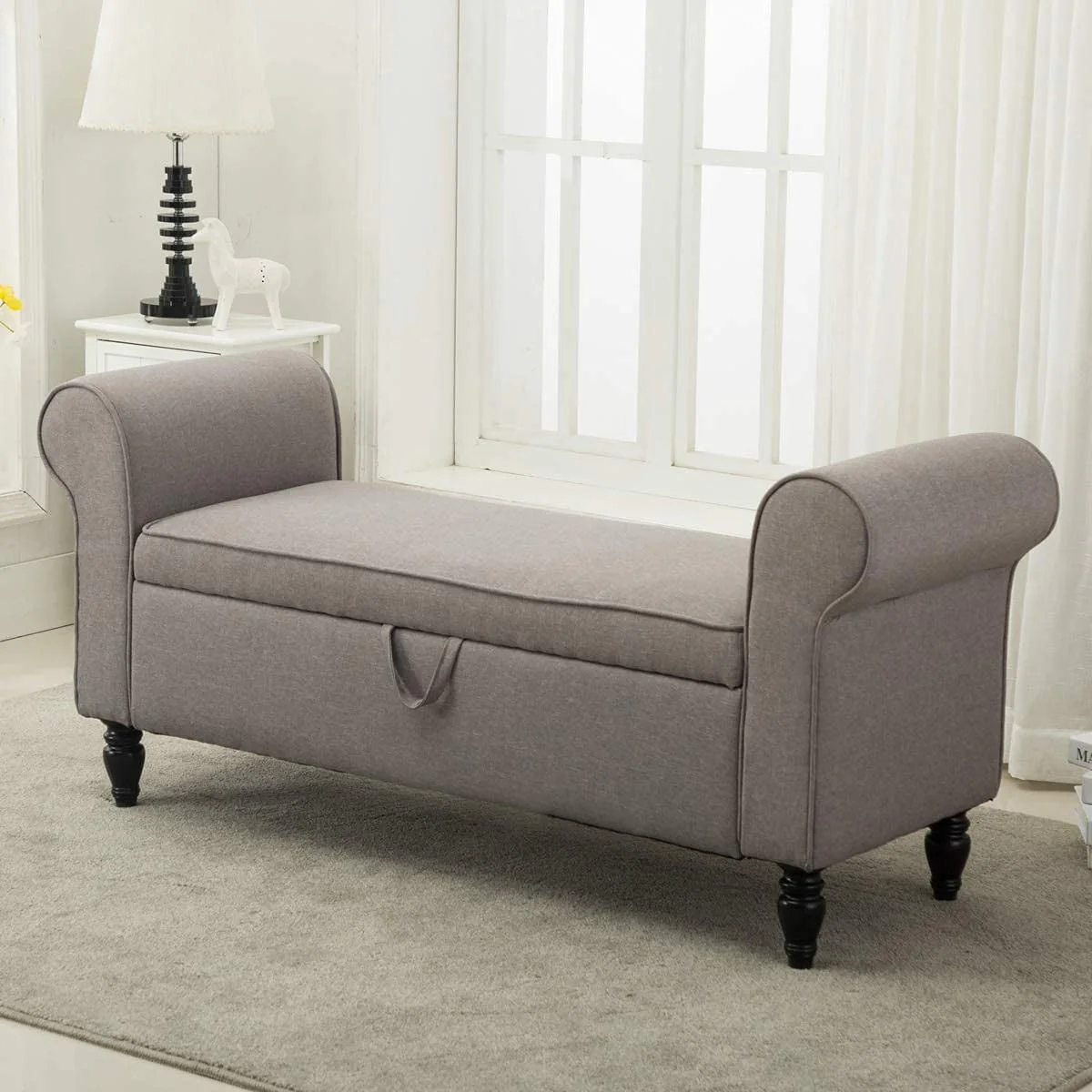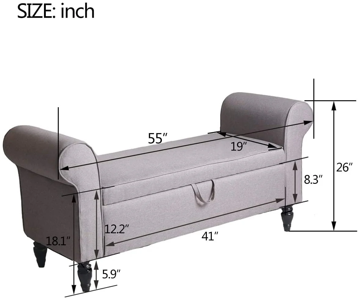 * Bench for the end of bed, 55" Length enables this storage ottoman to be placed at the end of a queen or king sized bed.