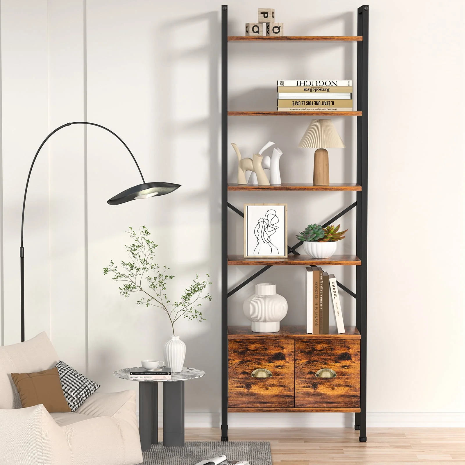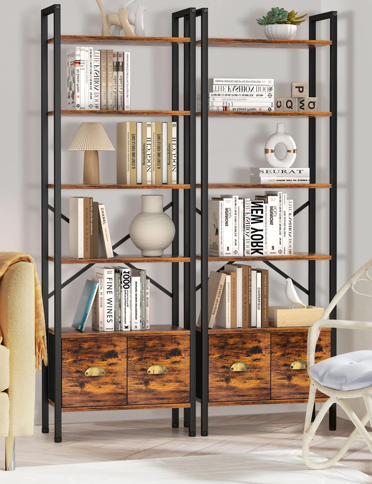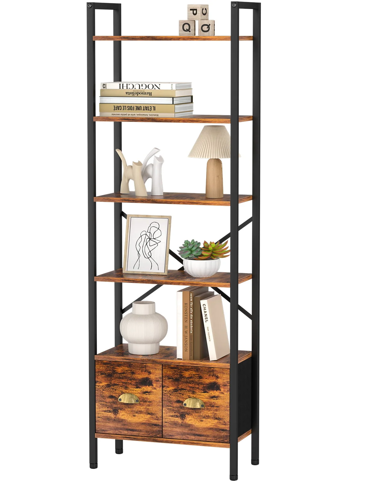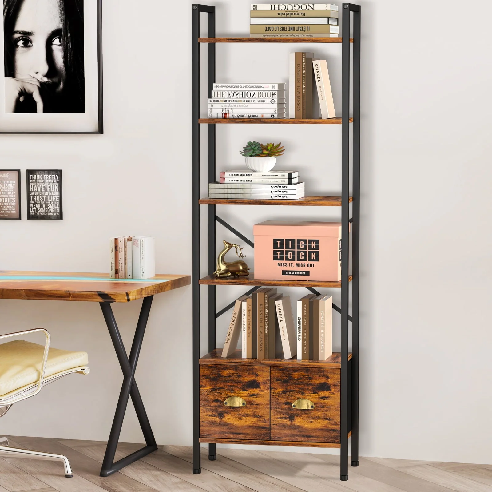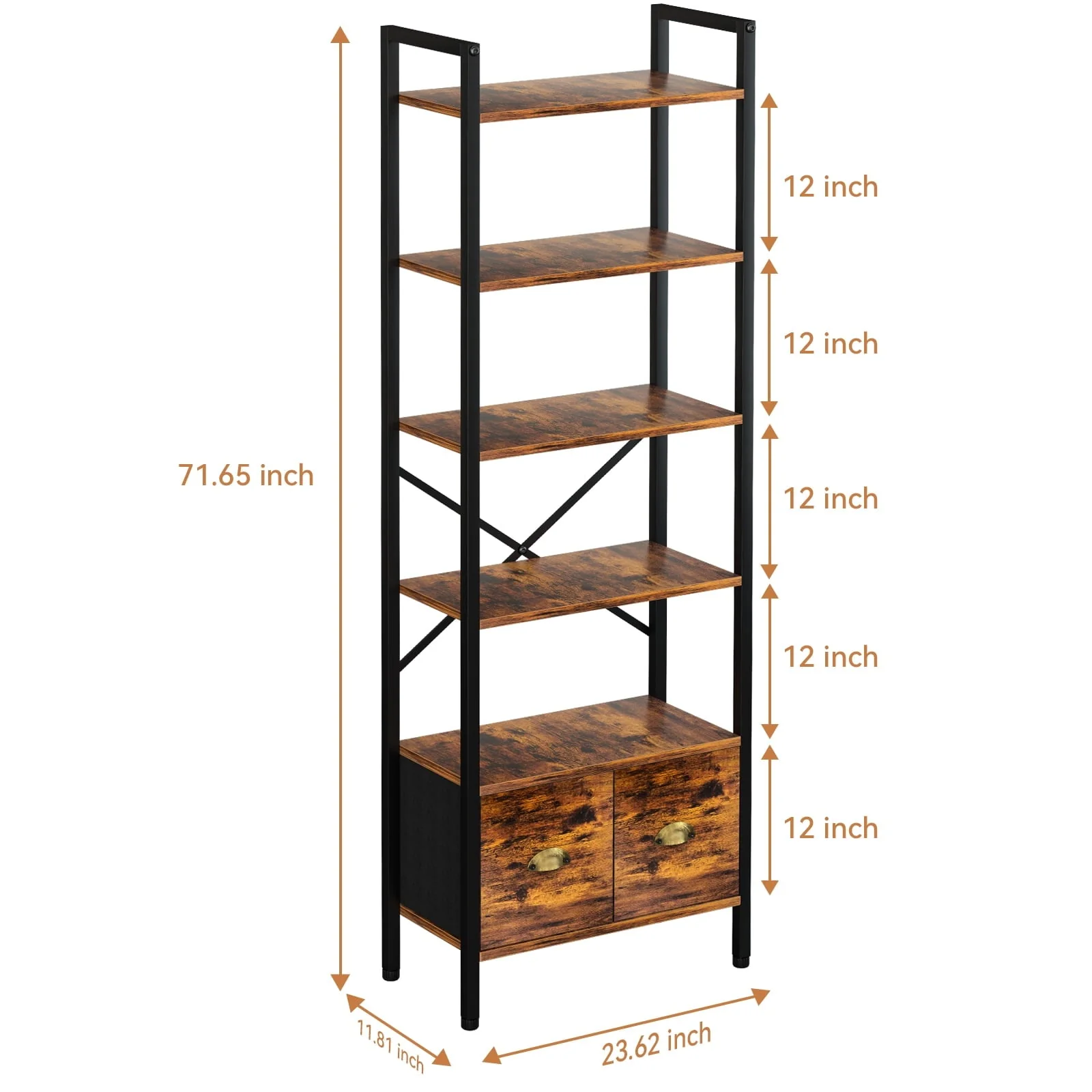 • BEHOST 6 Shelf Bookcase, 70in Tall Bookshelf with 2 Drawers, Set of 1, Rustic Brown
