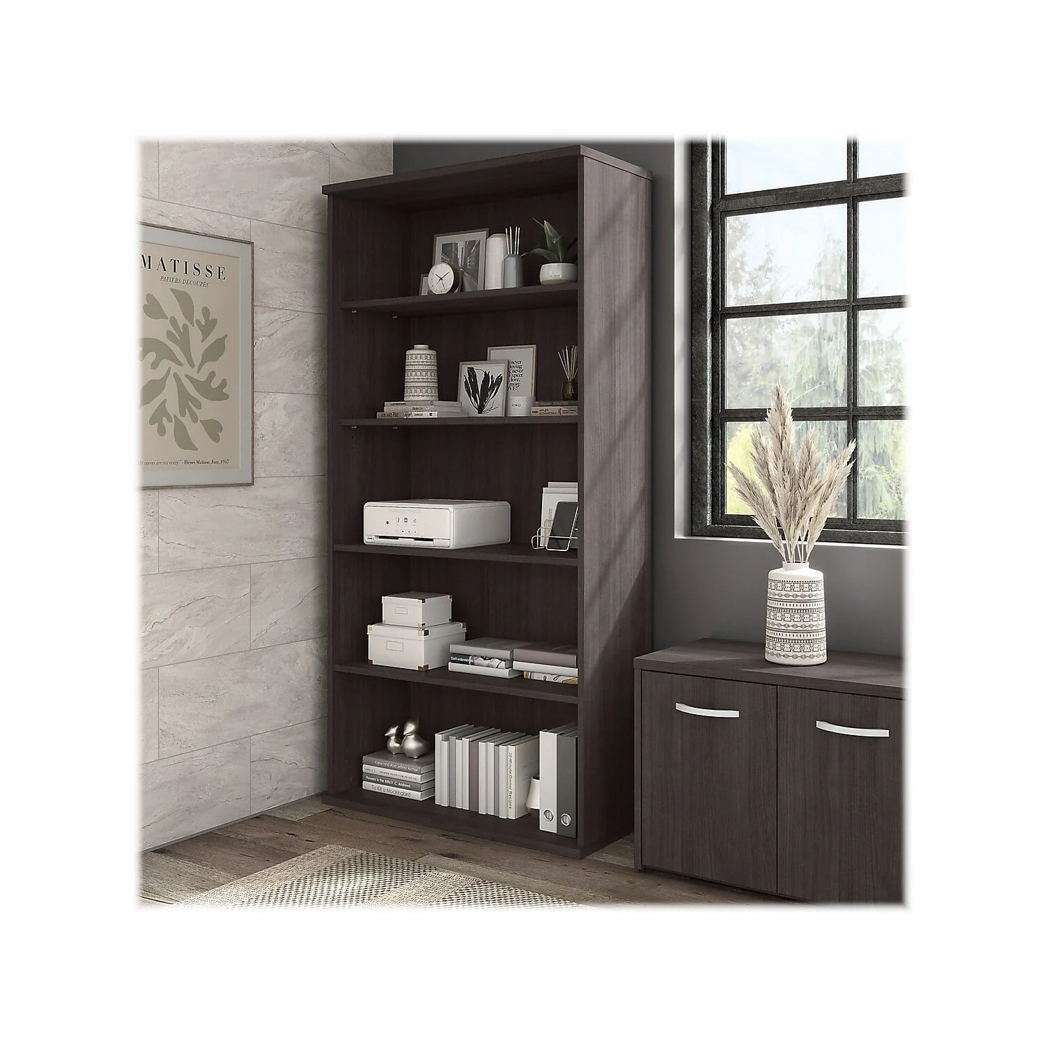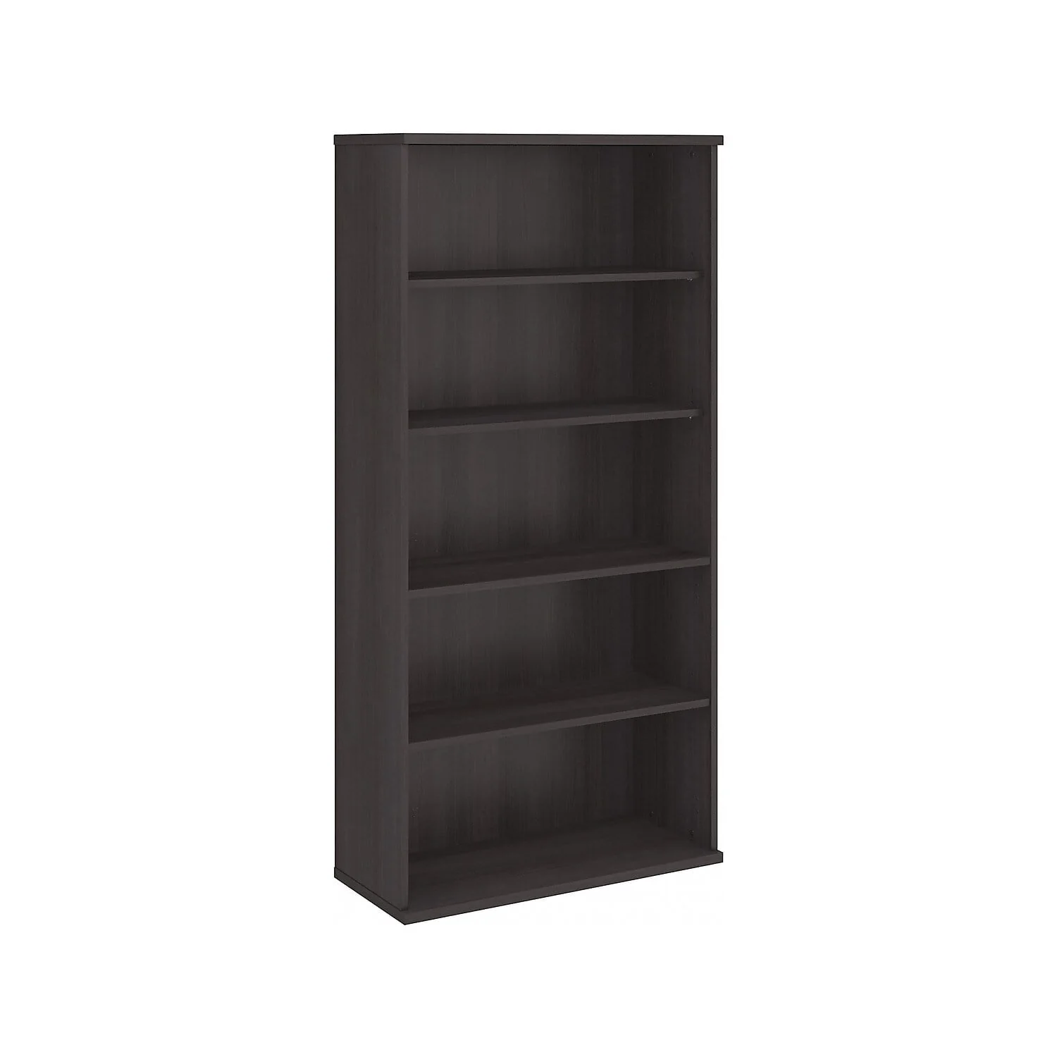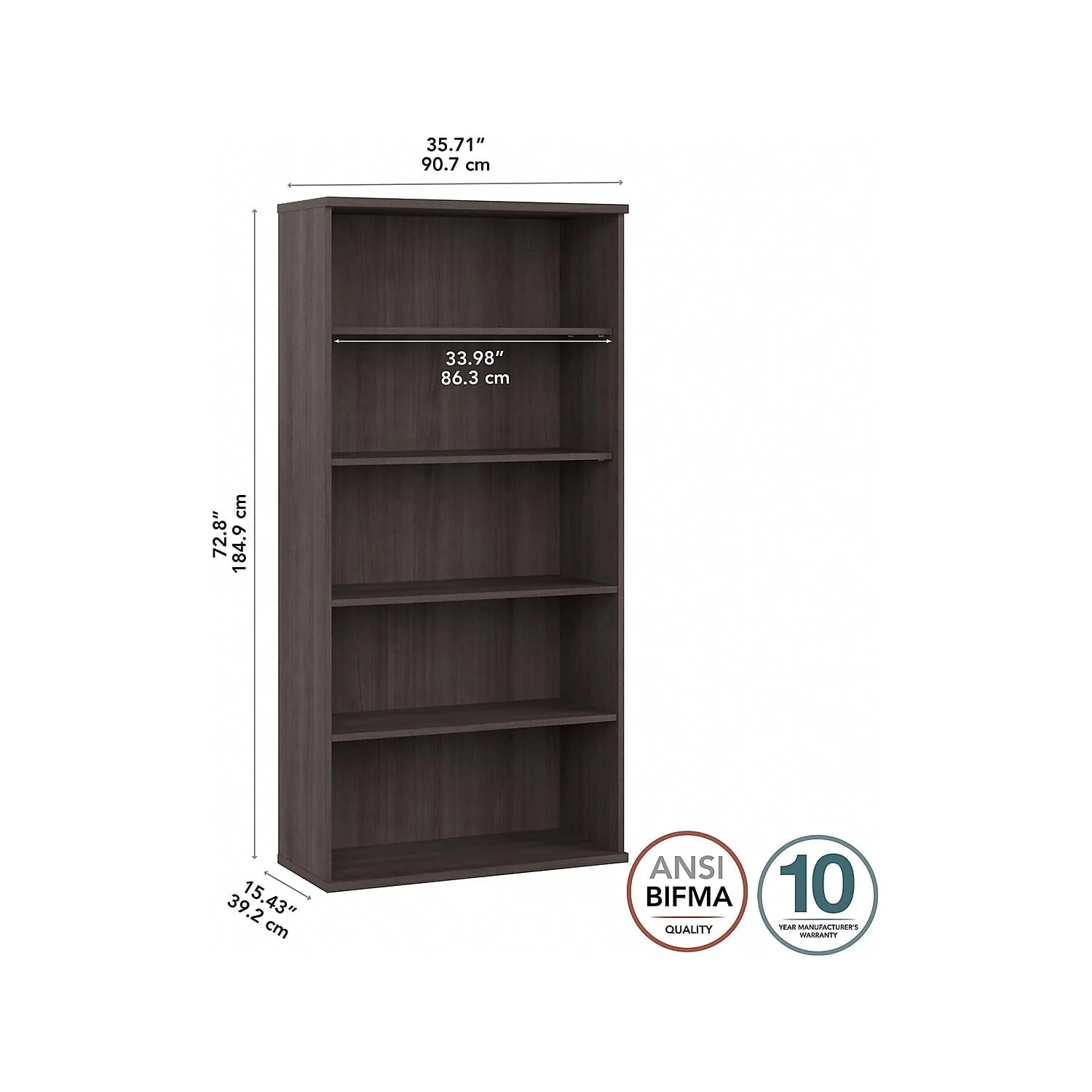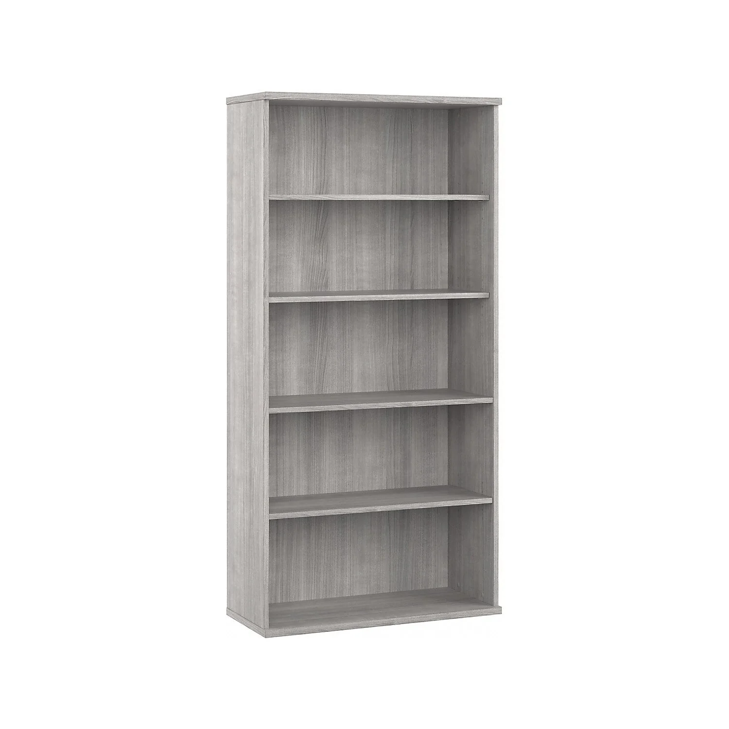 �?Bookcase made of laminate over engineered wood in a storm gray finish.