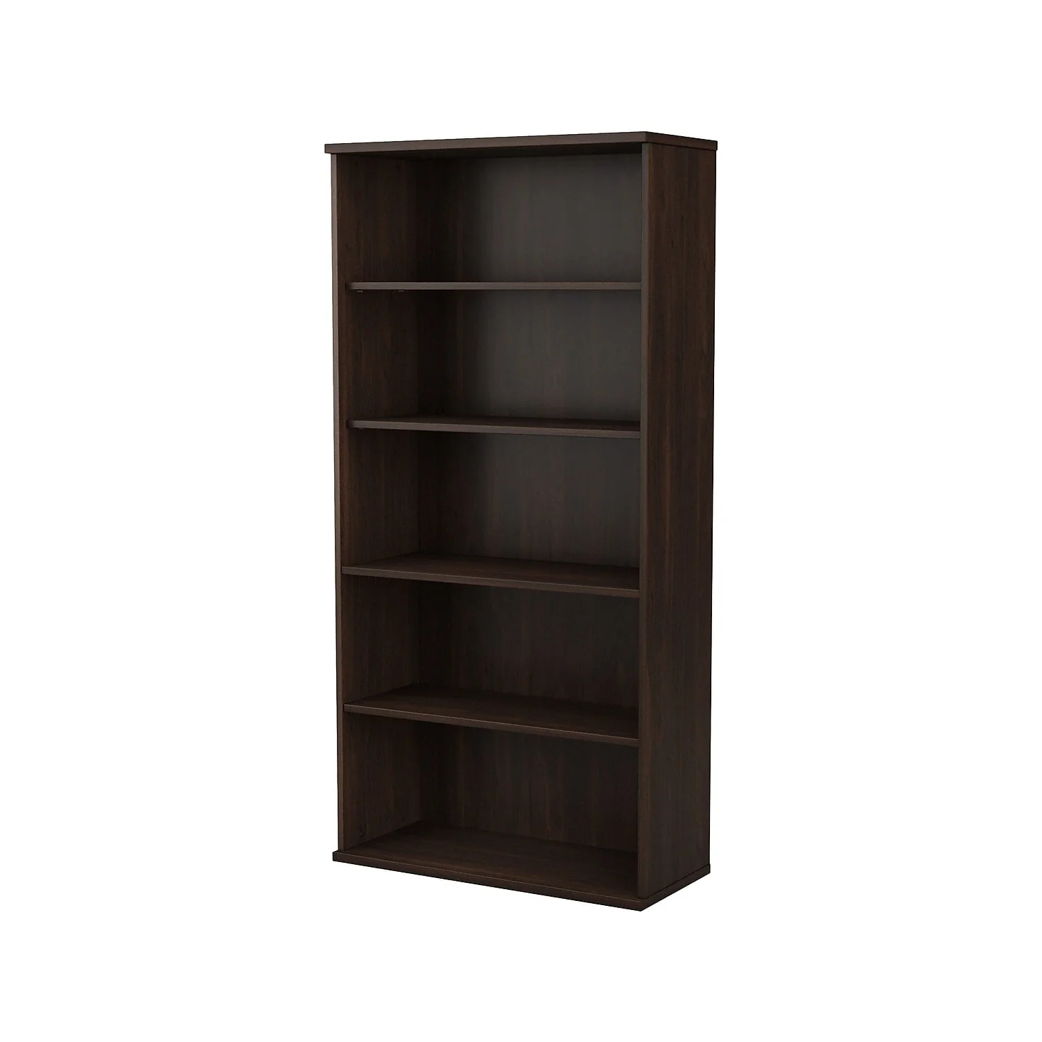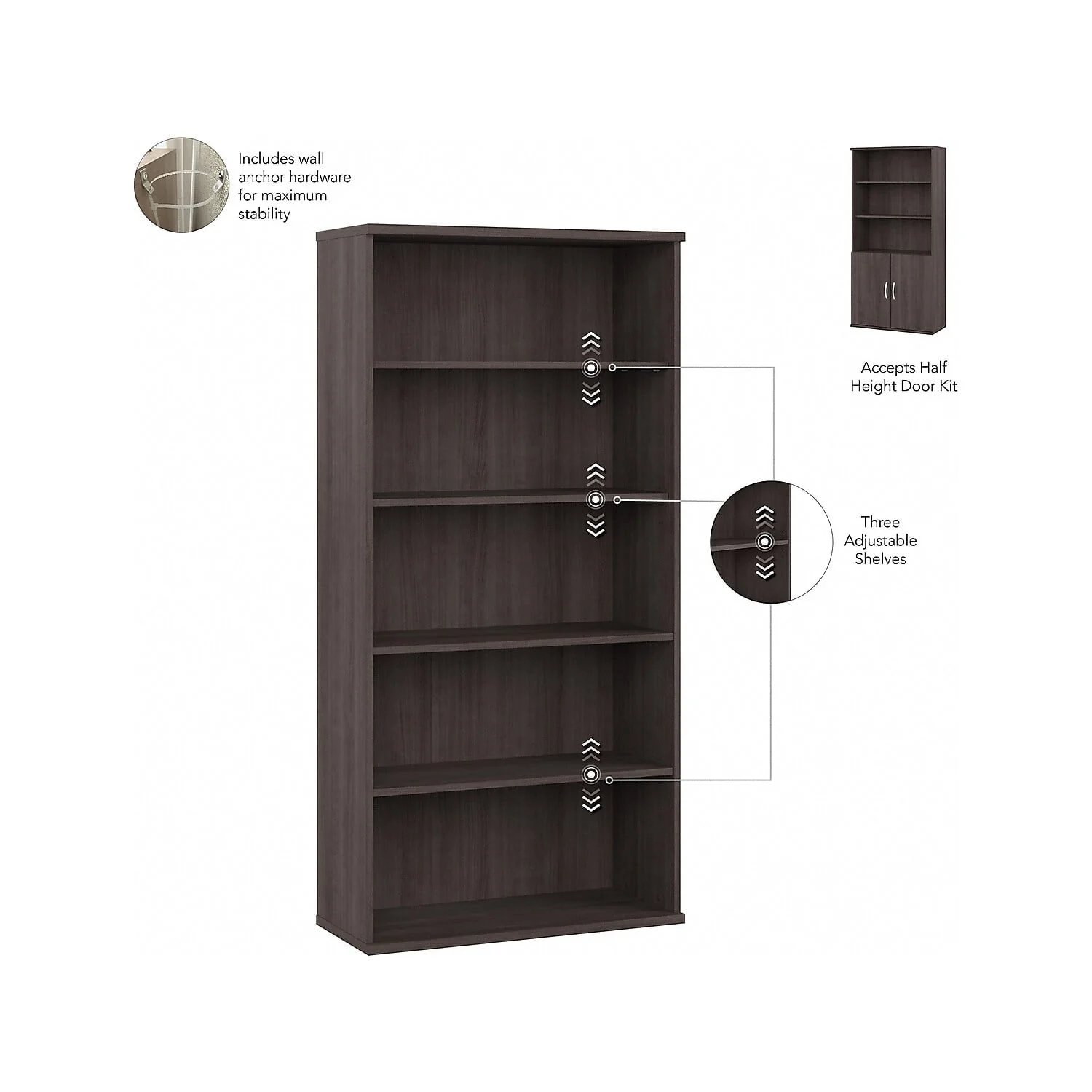�?Two shelves are fixed for stability while three can be adjusted to accommodate books and decorations of various sizes.