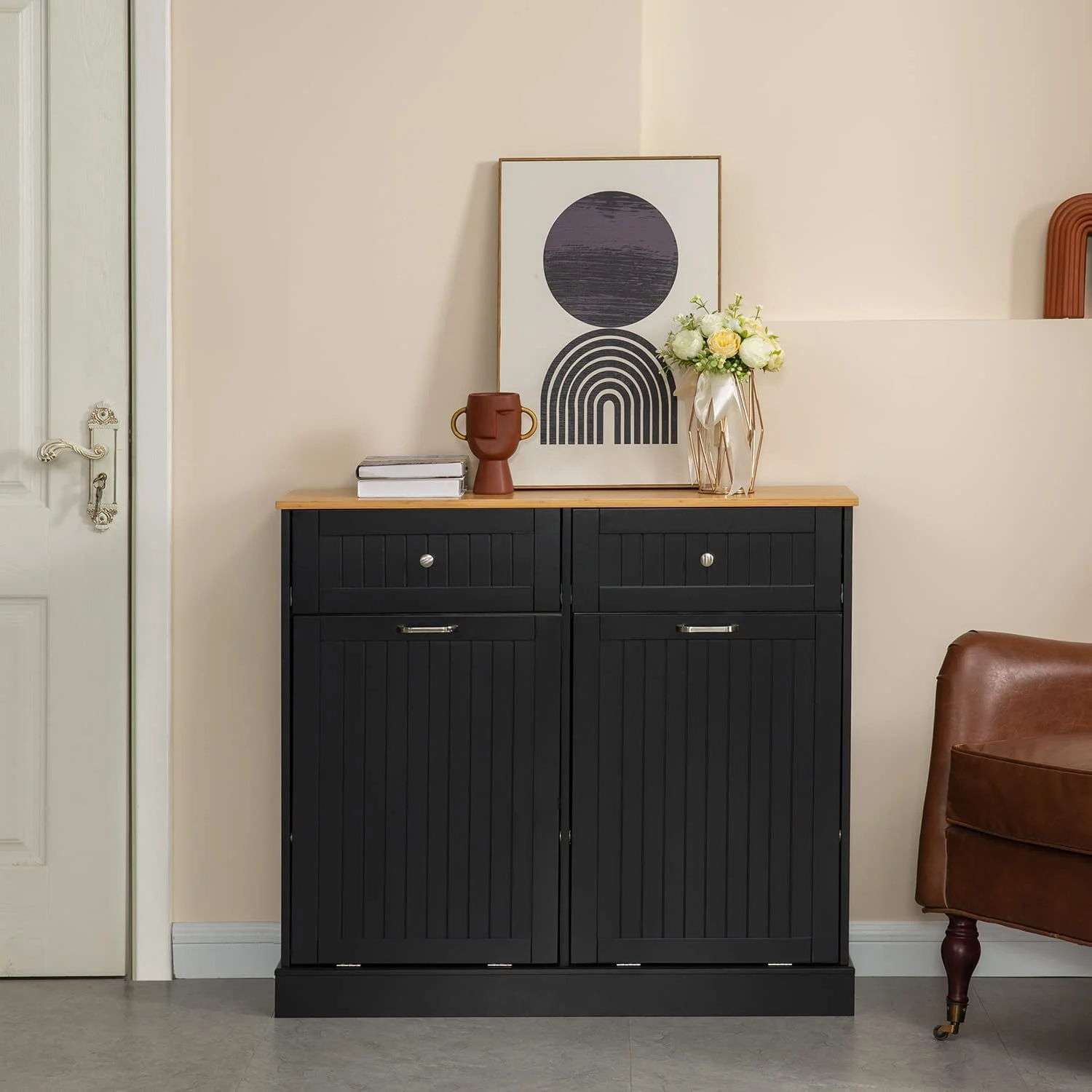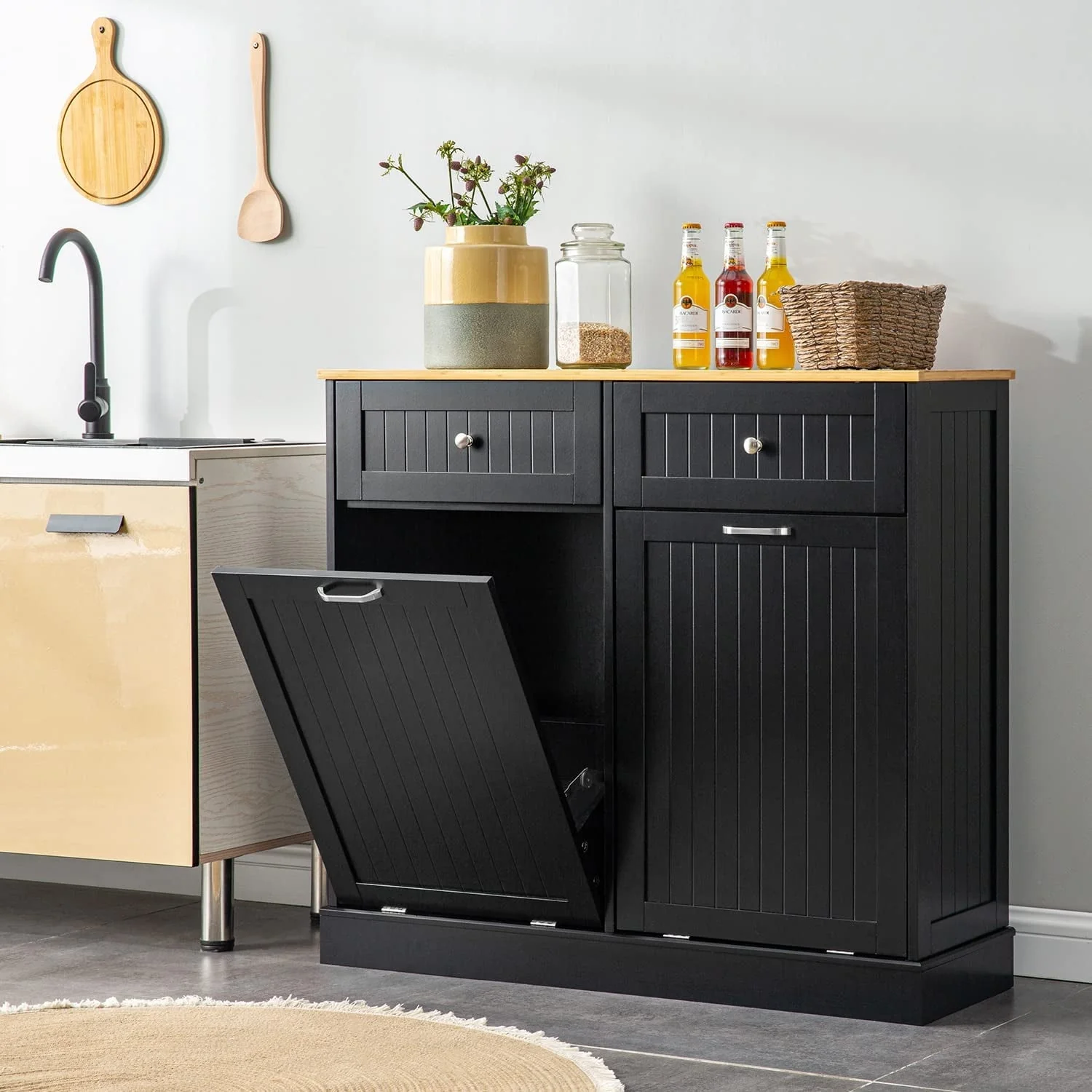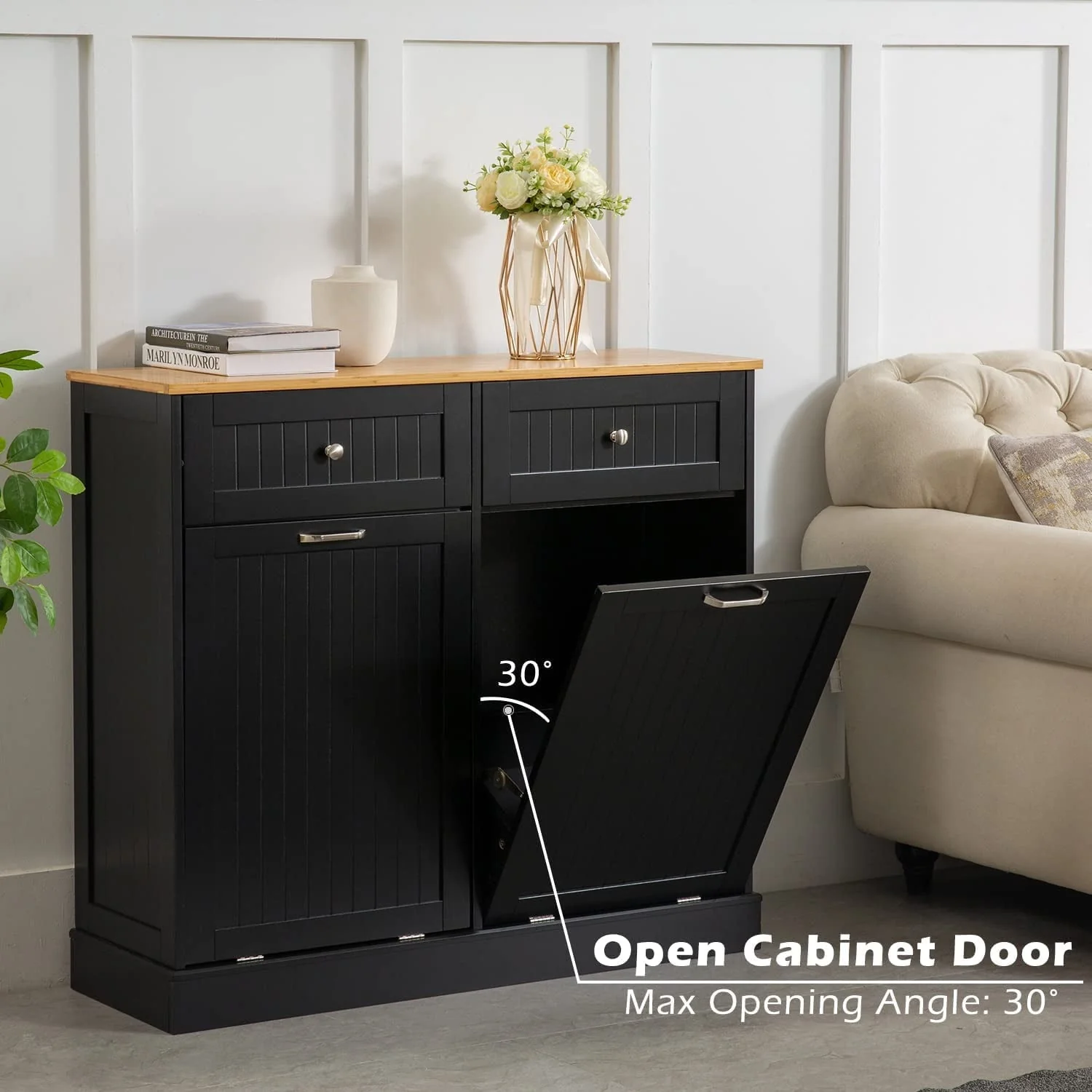 Reliancer Kitchen Trash Cabinet - Double Tilt Out Trash Cabinet with 2 Hideaway Drawers, Solid Wood Tabletop - Free Standing Recycling Cabinet - Pet Proof Trash Can Holder with Storage, Black