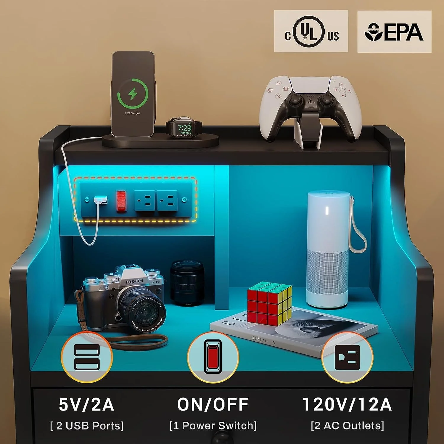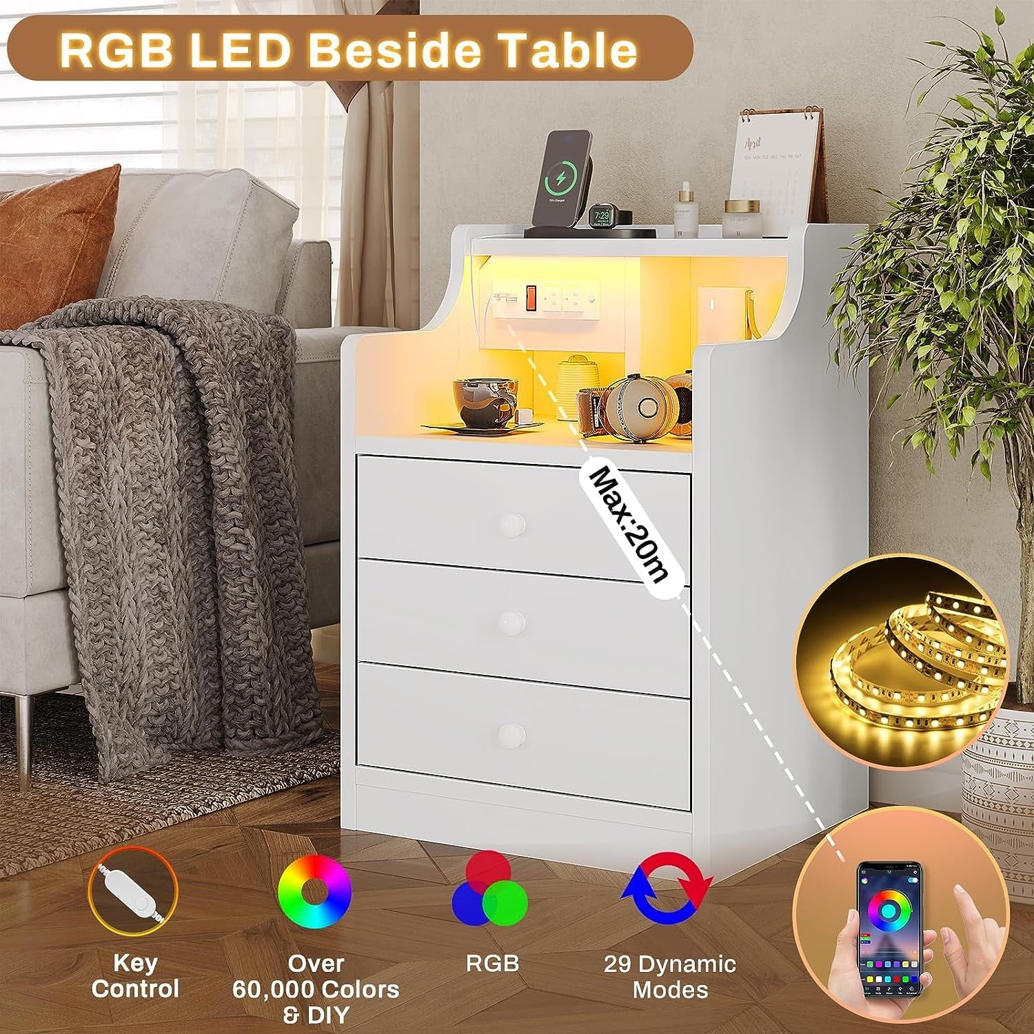 🎁 The Nightstand is equipped with multi-variable RGB colors, you can choose the light and mode according to needs and scenes. Controlled by manual key or phone app, which make your home more modern and fashion at night, create a atmosphere, suitable for parties, etc.