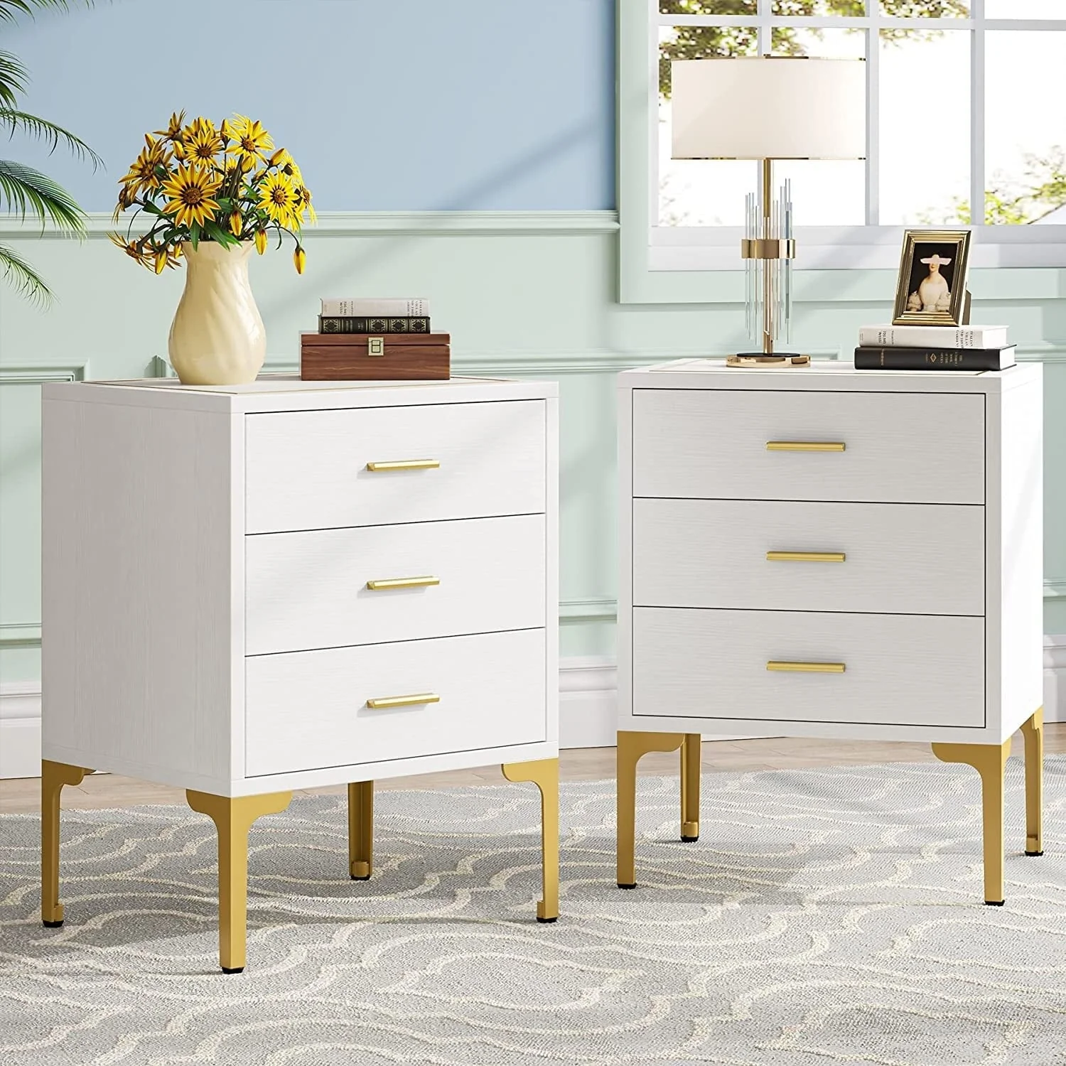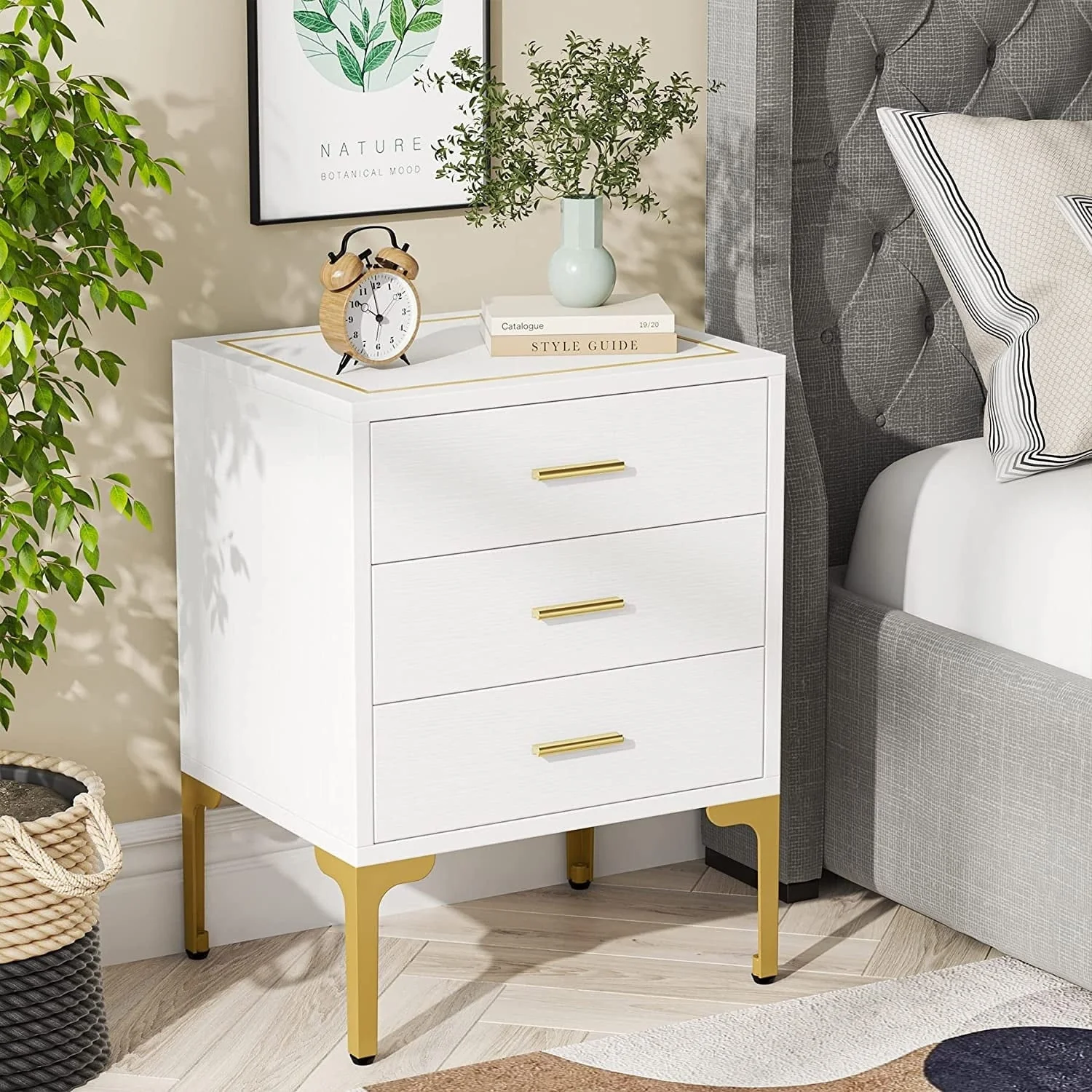 White and Gold Bedside Table: More than a nightstands bedroom but a bedside storage nightstand, 3 drawers white and gold nightstand, sofa end tables side stands for the living room, office supply storage, white and gold side table for the bedroom, suitable for compact spaces, bedroom, guest room, closet, entryway, dorm small apartment, etc
