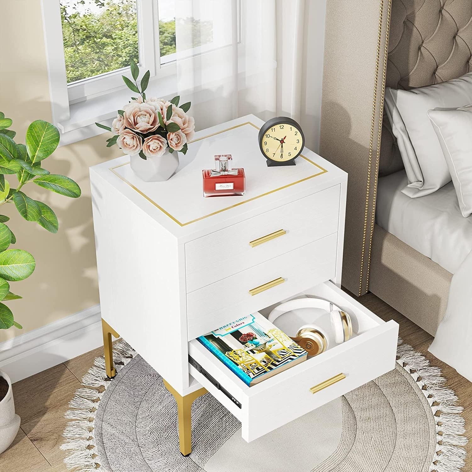 3 Drawers Nightstand: The lamp on the white and gold nightstand is on, your favorite novels lying on the open shelf, and your cozy pajamas and eye masks are in the drawers; with everything under your control, this nightstand is a great piece in any home's decor, complementing most furniture whether traditional, rustic or modern.