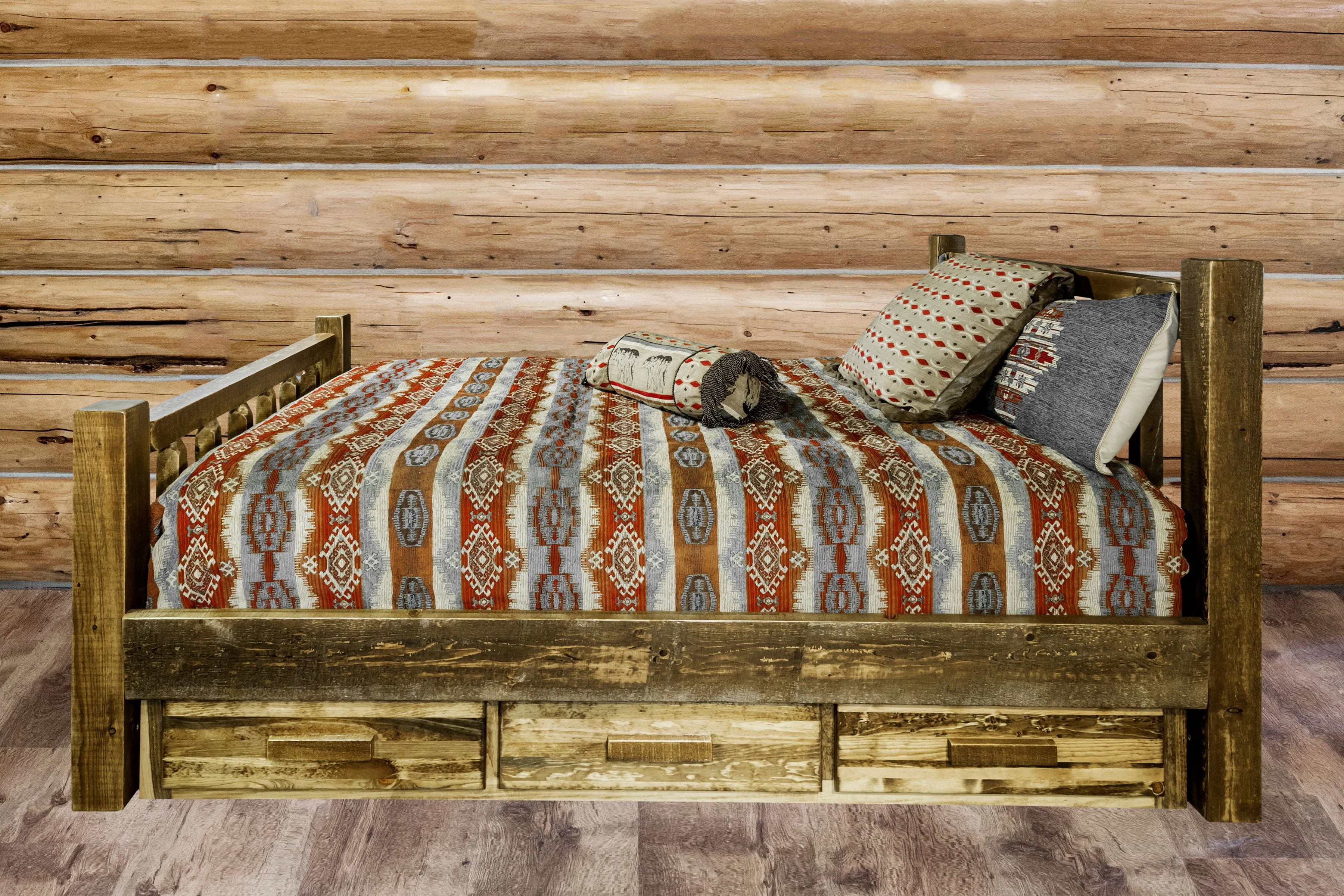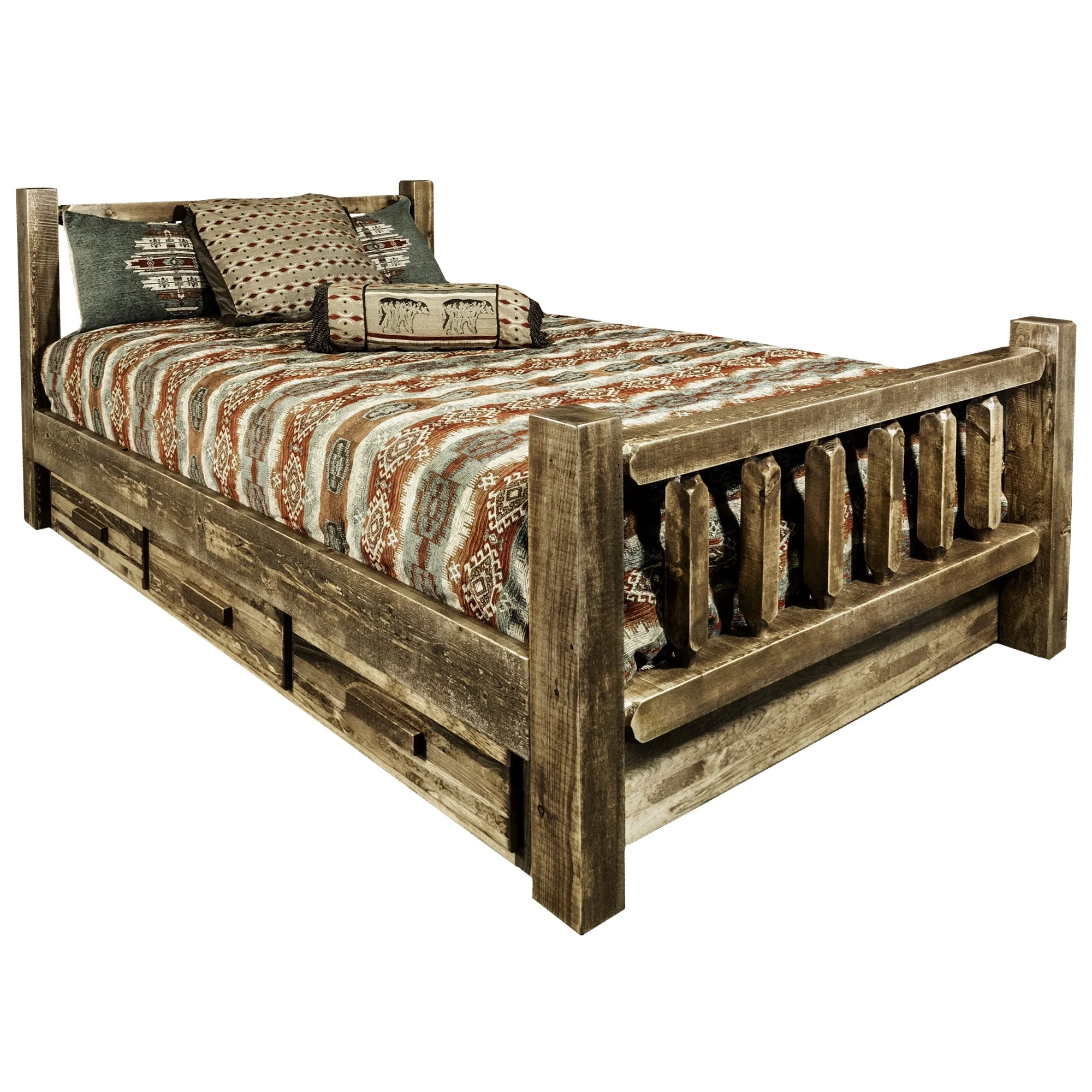 From Montana Woodworks®, the largest manufacturer of handcrafted, heirloom quality rustic furnishings in America comes the Homestead Collection line of furniture products. Handcrafted in the mountains of Montana using solid, American grown wood, the artisans rough saw all the timbers and accessory trim pieces for a look uniquely reminiscent of the timber-framed homes once found on the American frontier. This spindle style bed with storage features the tried and true mortise and tenon joinery system for the ultimate in durability and longevity. Each of the 6 drawers measure a full 21" wide,16" deep and 5.5" high and are mounted on epoxy coated metal slides for years of quiet, trouble free use. Some assembly required. Instructions and hardware included. This item comes professionally pre-finished with premium grade stain and clear lacquer. 550 pound capacity. All Montana Woodworks products come with a 20-Year limited warranty at no additional charge. Hand crafted in Montana U.S.A. using genuine lodge pole pine.