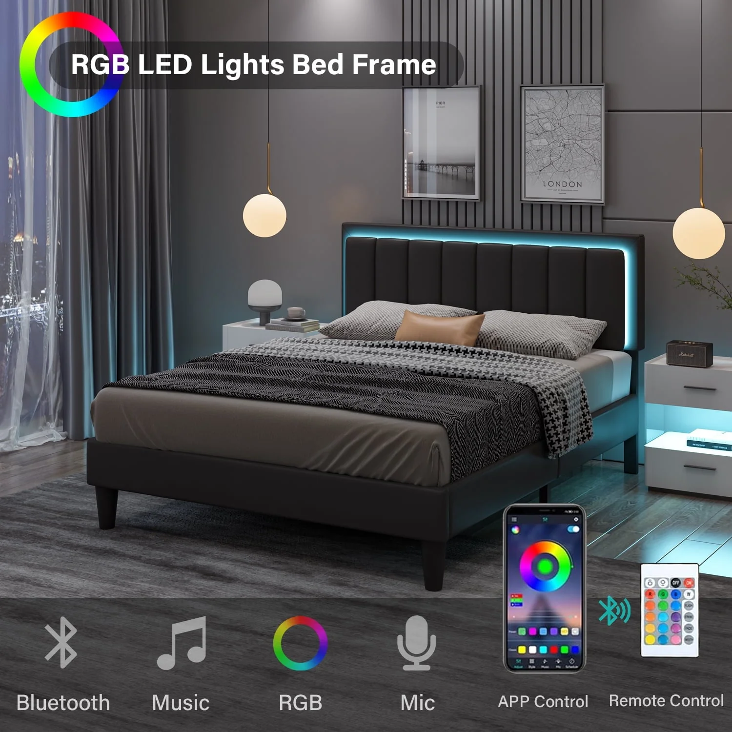 The queen bed frame combines foam fill with line design, can give you soft support like a hug, the queen LED bed frame with high quality headboard can be wiped with a soft and damp cloth. The upholstered headboard is equipped with light, The LED light with a variety of colors to choose from, It can meet simple lighting needs, but also can create a romantic bedroom atmosphere, bring more experience to your life.