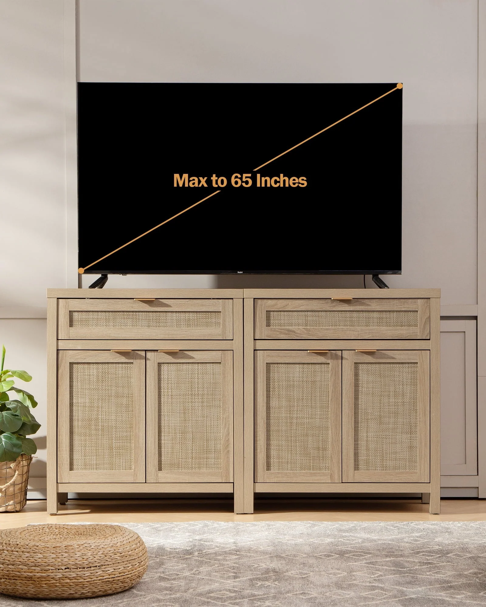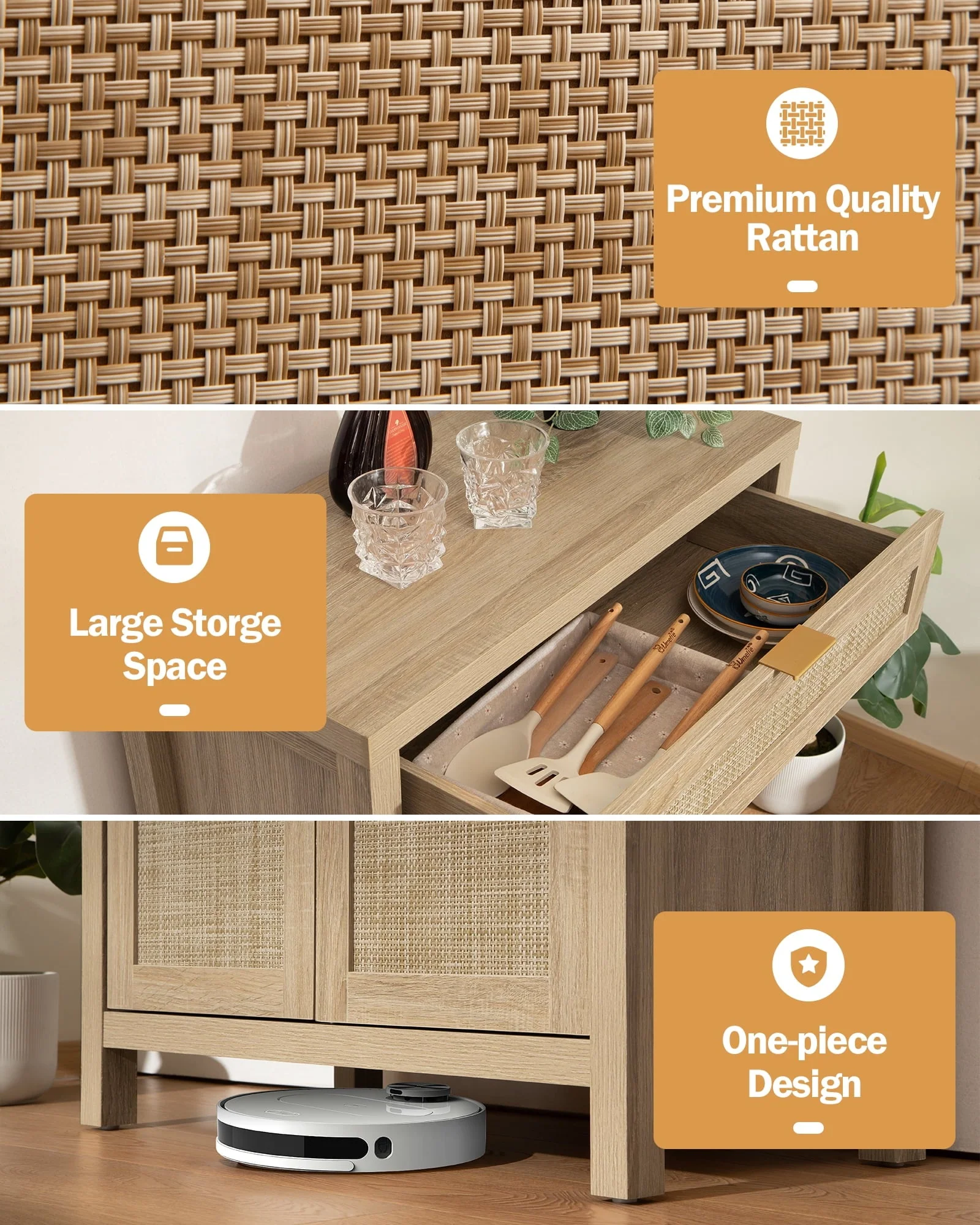 Nopurs Rattan Sideboard Buffet Cabinet Set of 2, Boho Storage Cabinet Buffet Table with Doors and Drawer, Coffee Bar Cabinet for Kitchen Entryway Living Dining Room, Light Oak