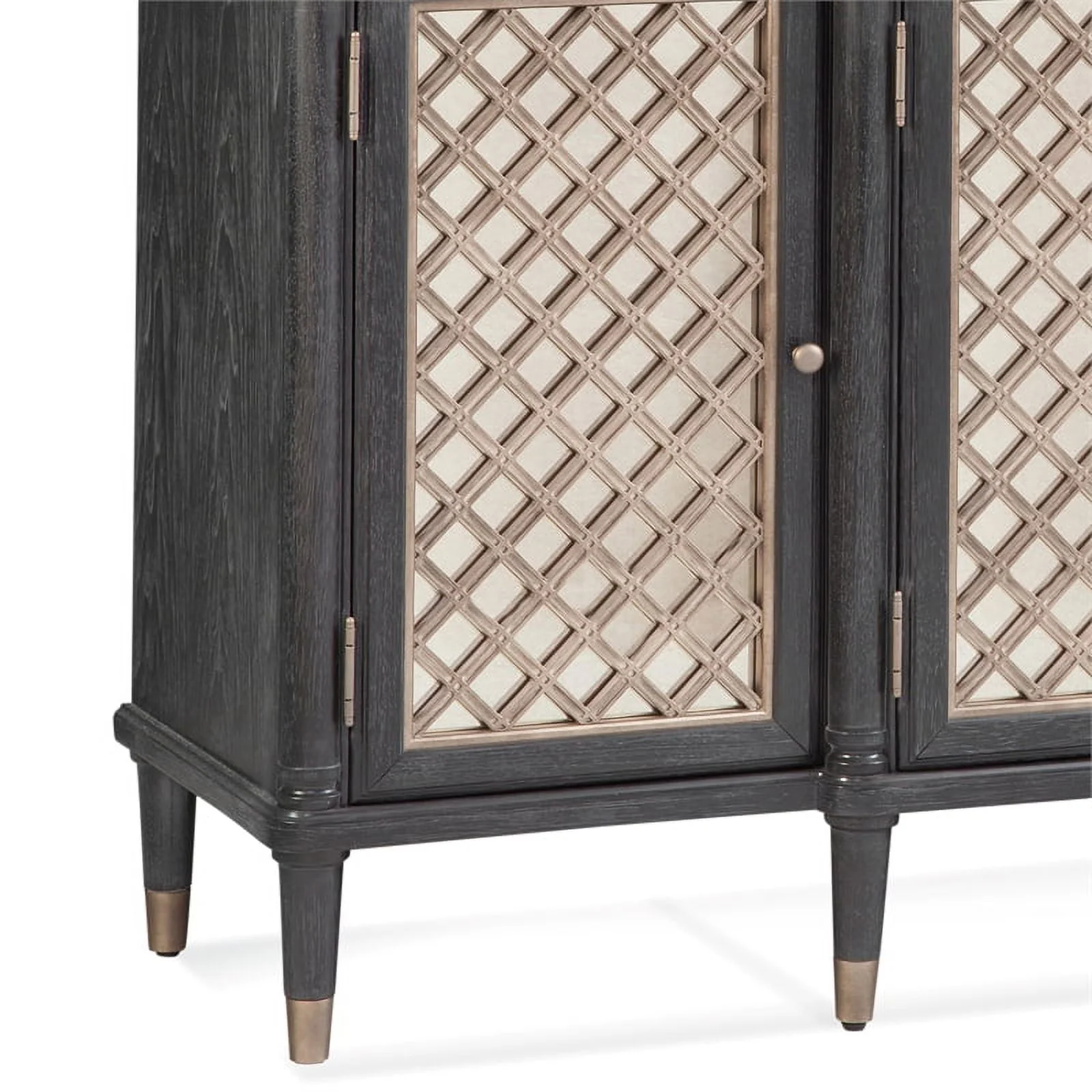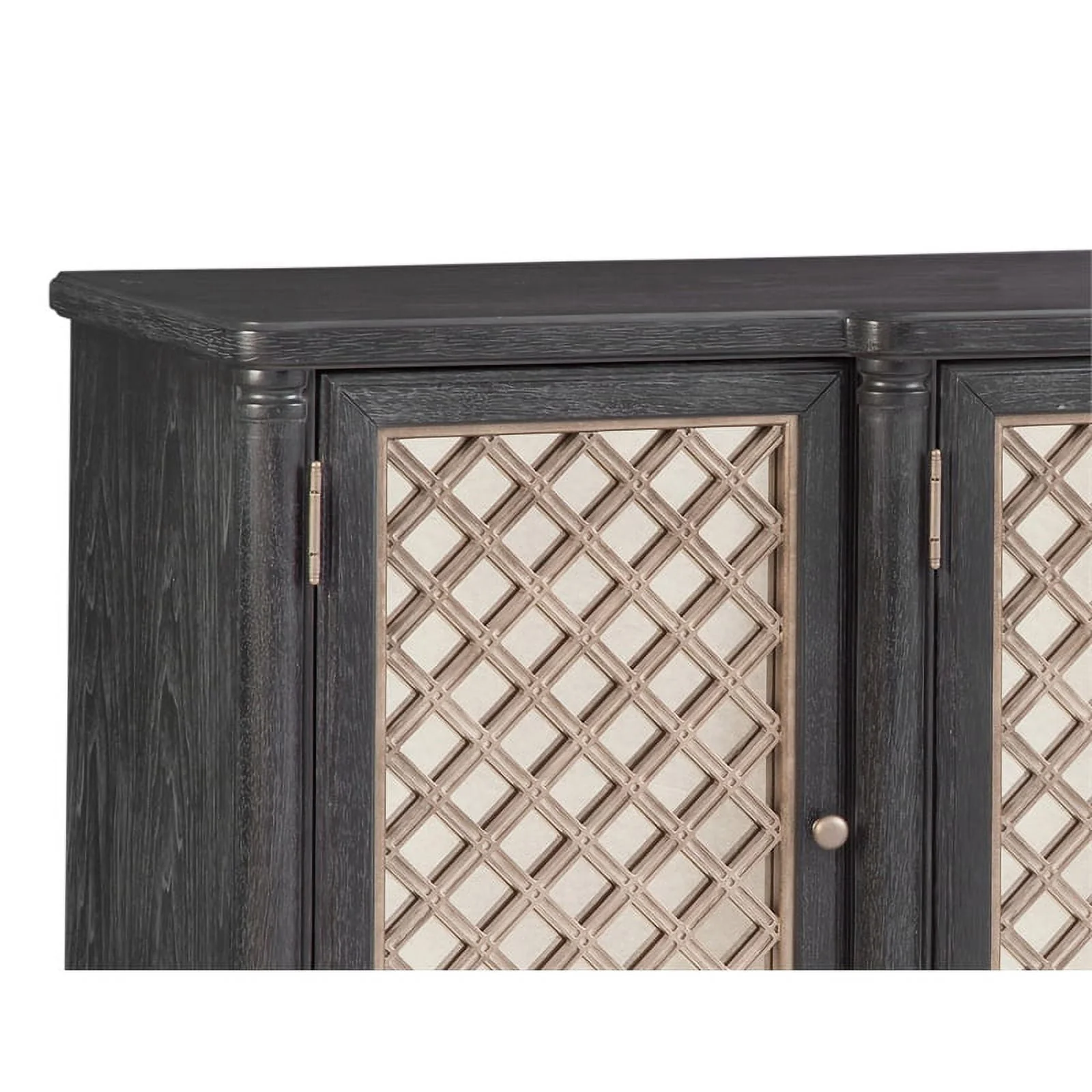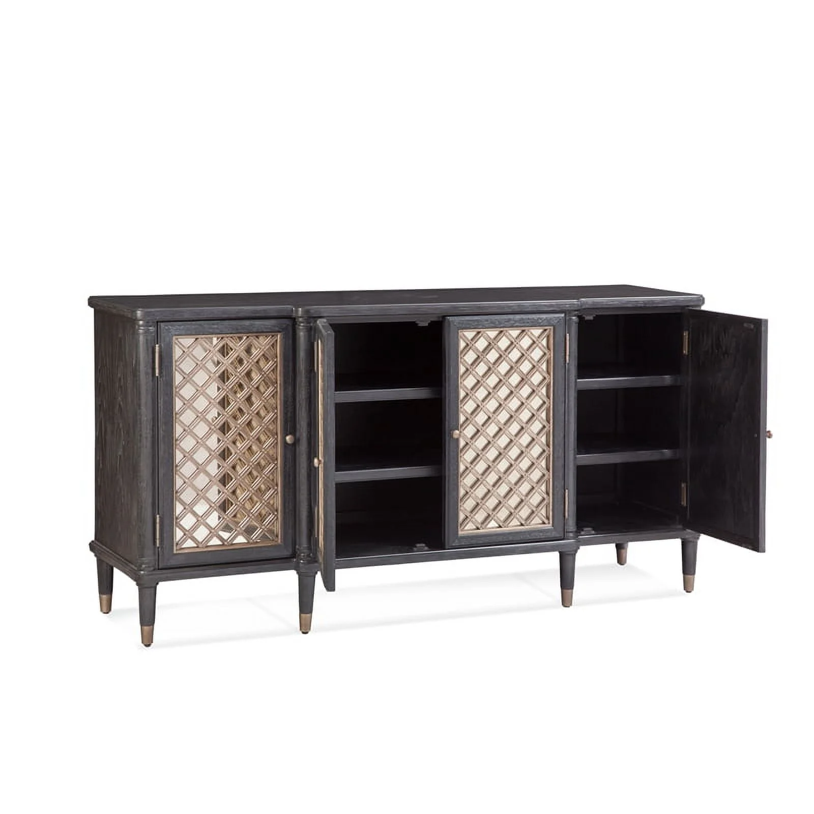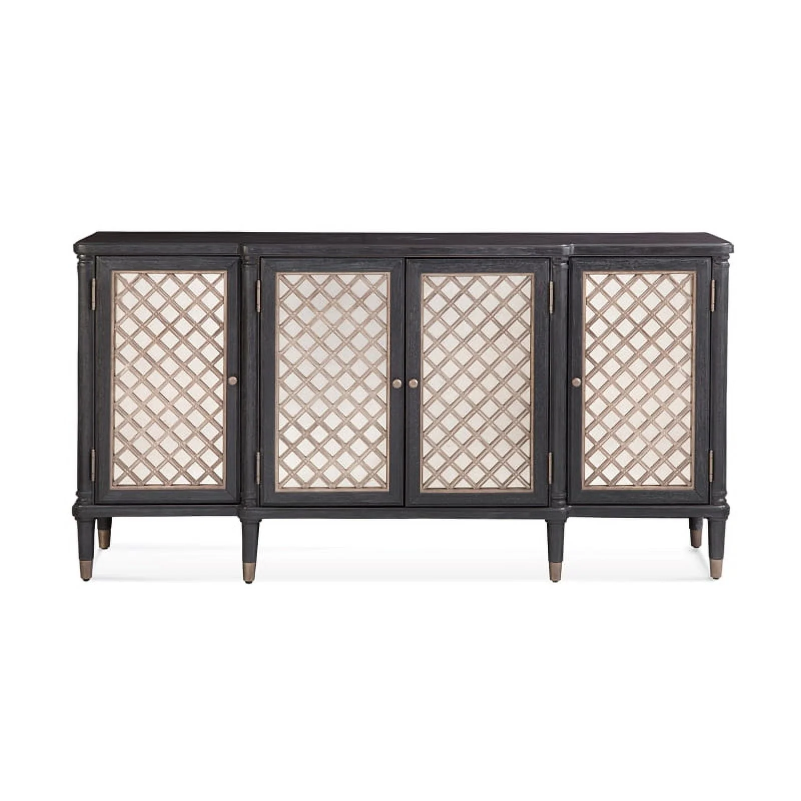 The Groveland server features a breakfront design, half-rounded pilasters and fully turned feet with bronze finished ferrules and four doors with six adjustable shelves. The doors feature lightly antiqued mirror and intricately detailed overlay moldings, and antique silver round door pulls. Soft close hinges. Adjustable floor levelers. Media cable management cutouts. COO: India.