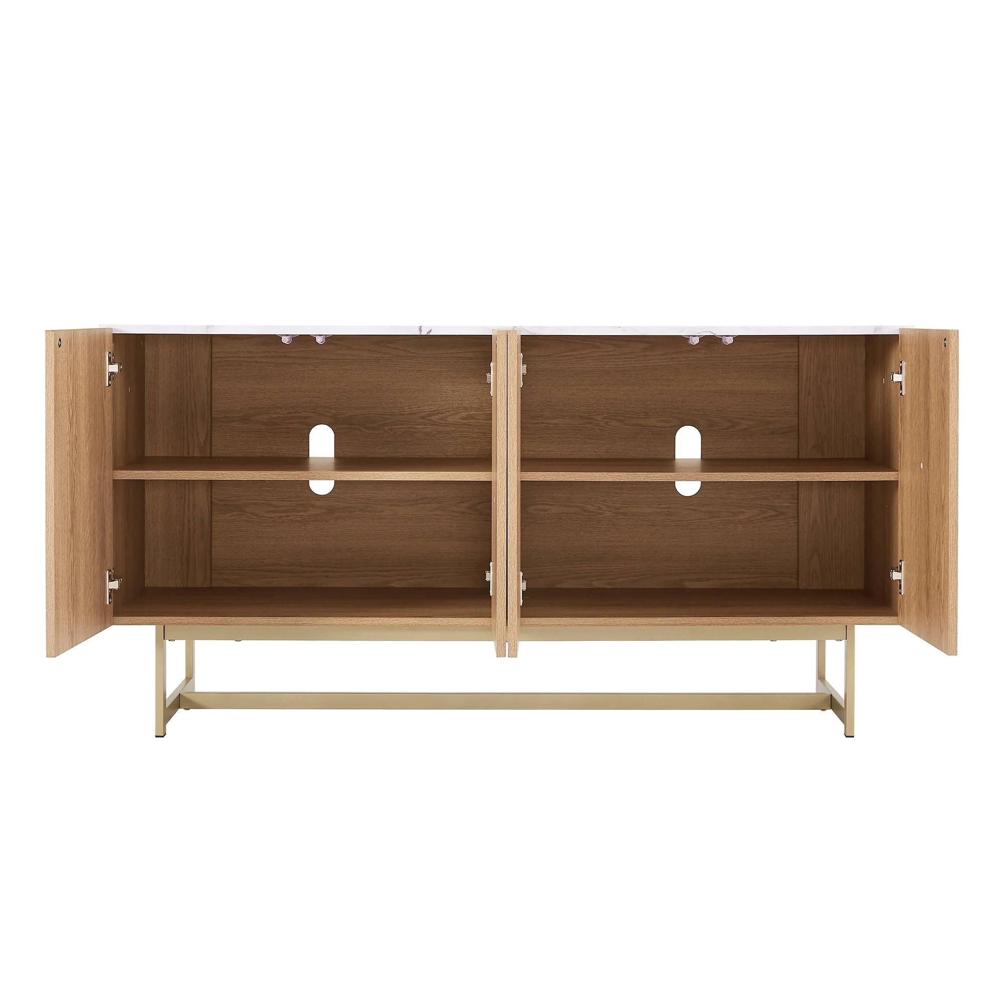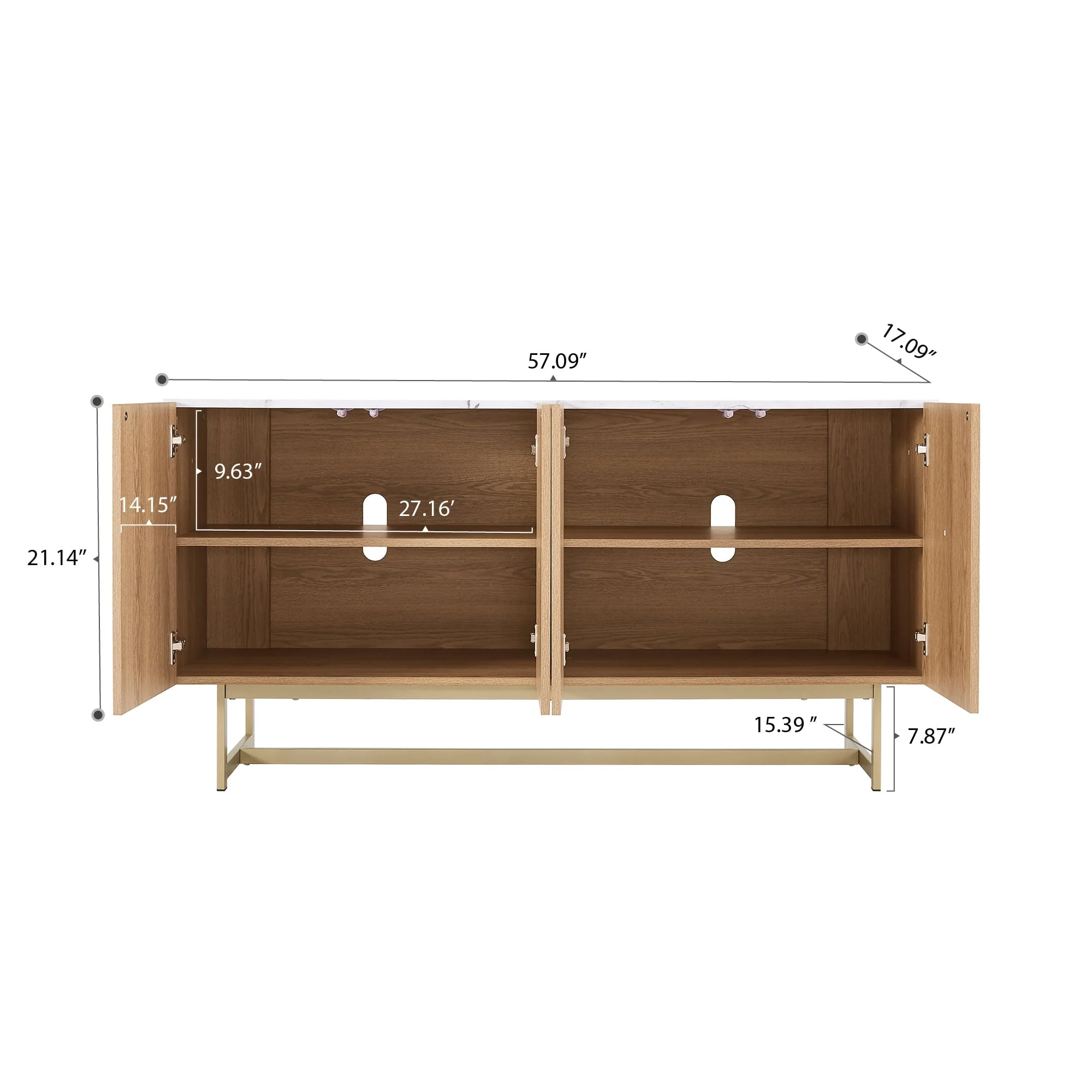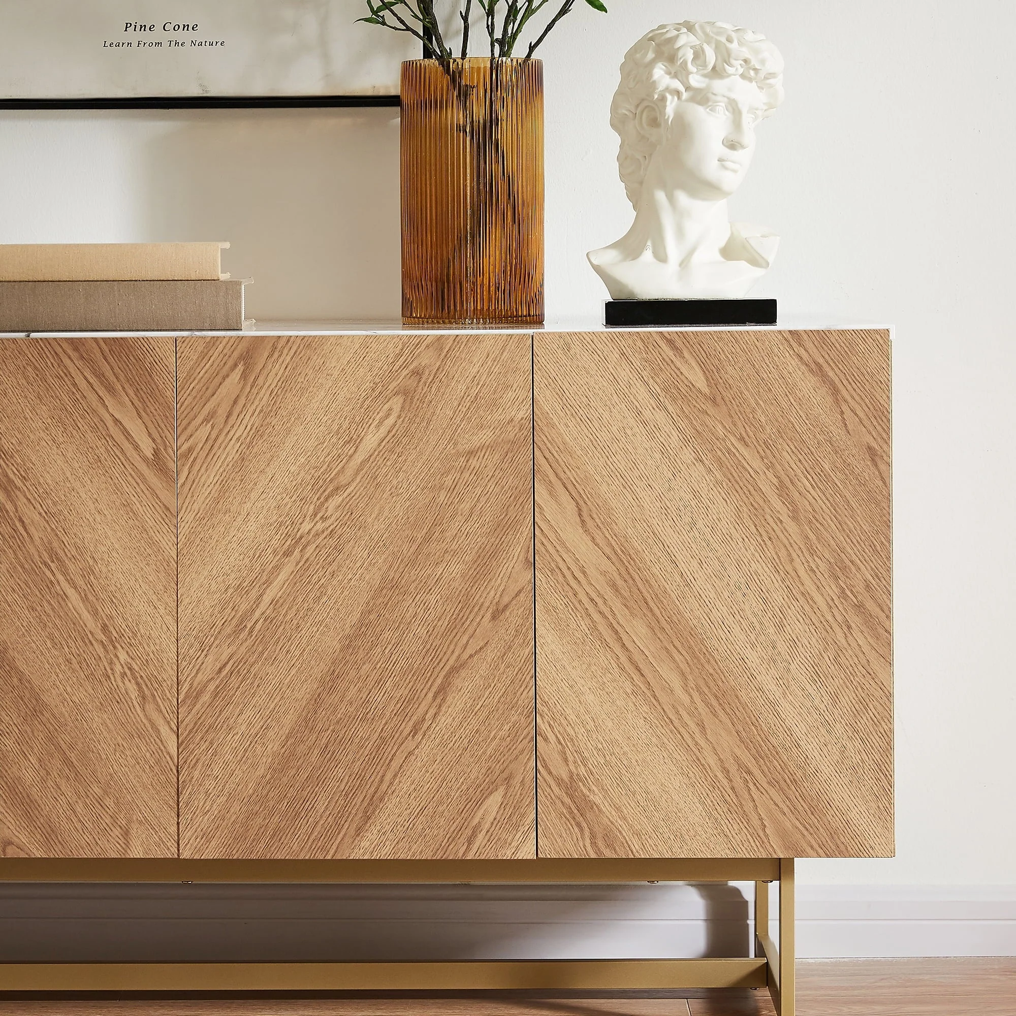 Roomfitters 57�?mid Century Modern TV Stand, Herringbone Pattern Buffet Cabinet Sideboard Credenza, Marble Top Media Console Entertainment Center for Living Room, Entryway (Oak Wood, Gold Metal Legs)