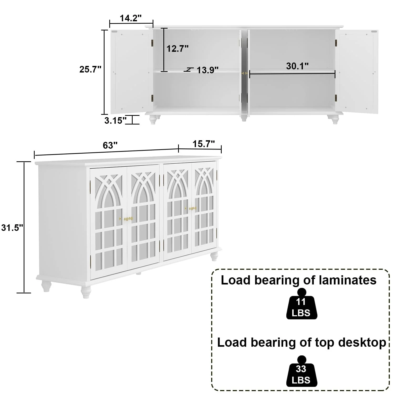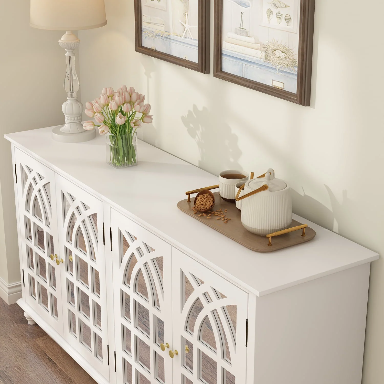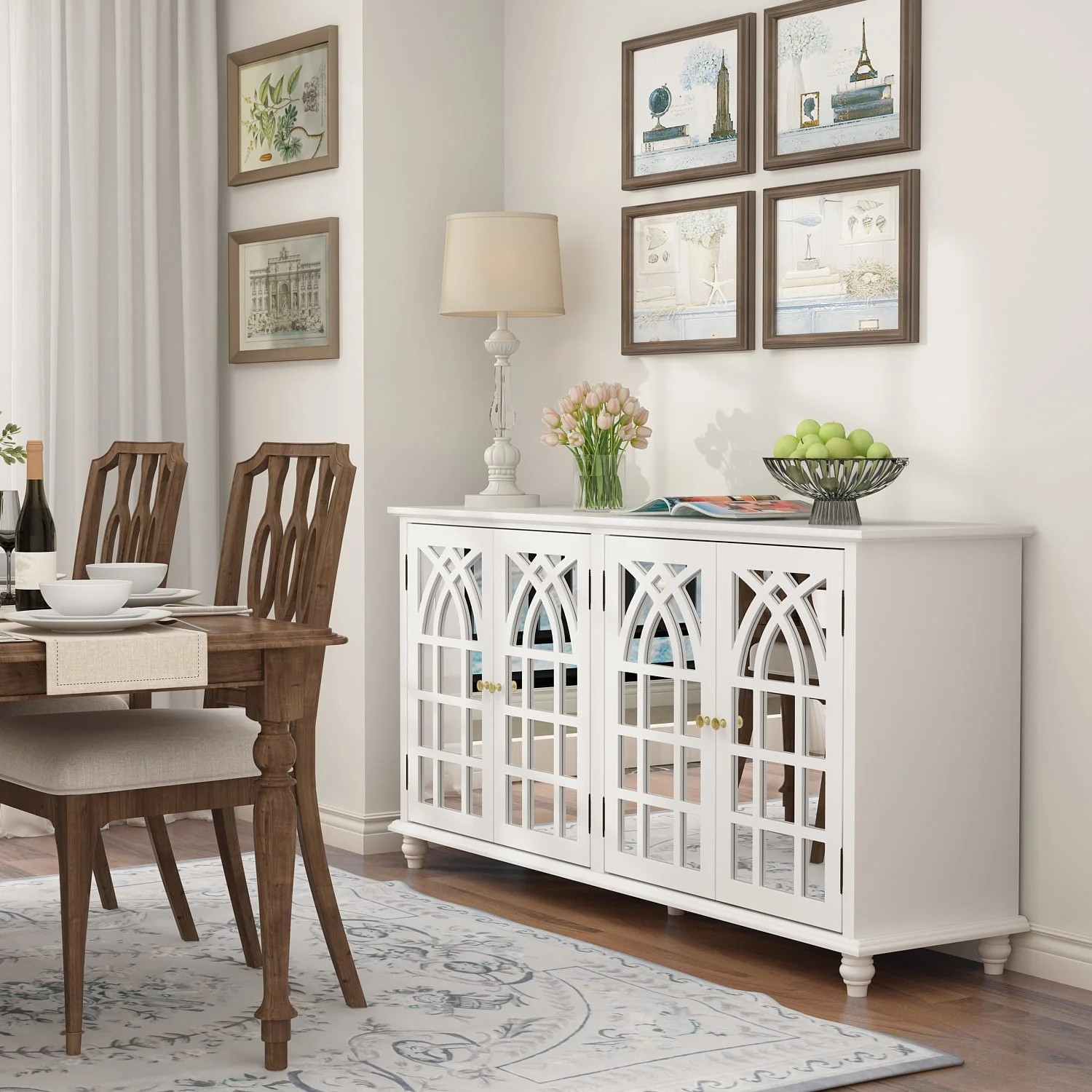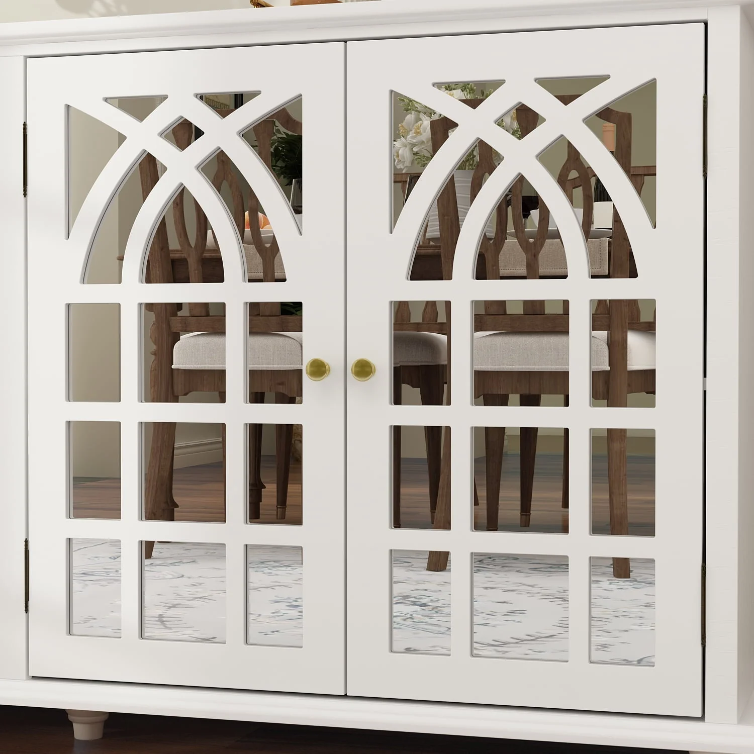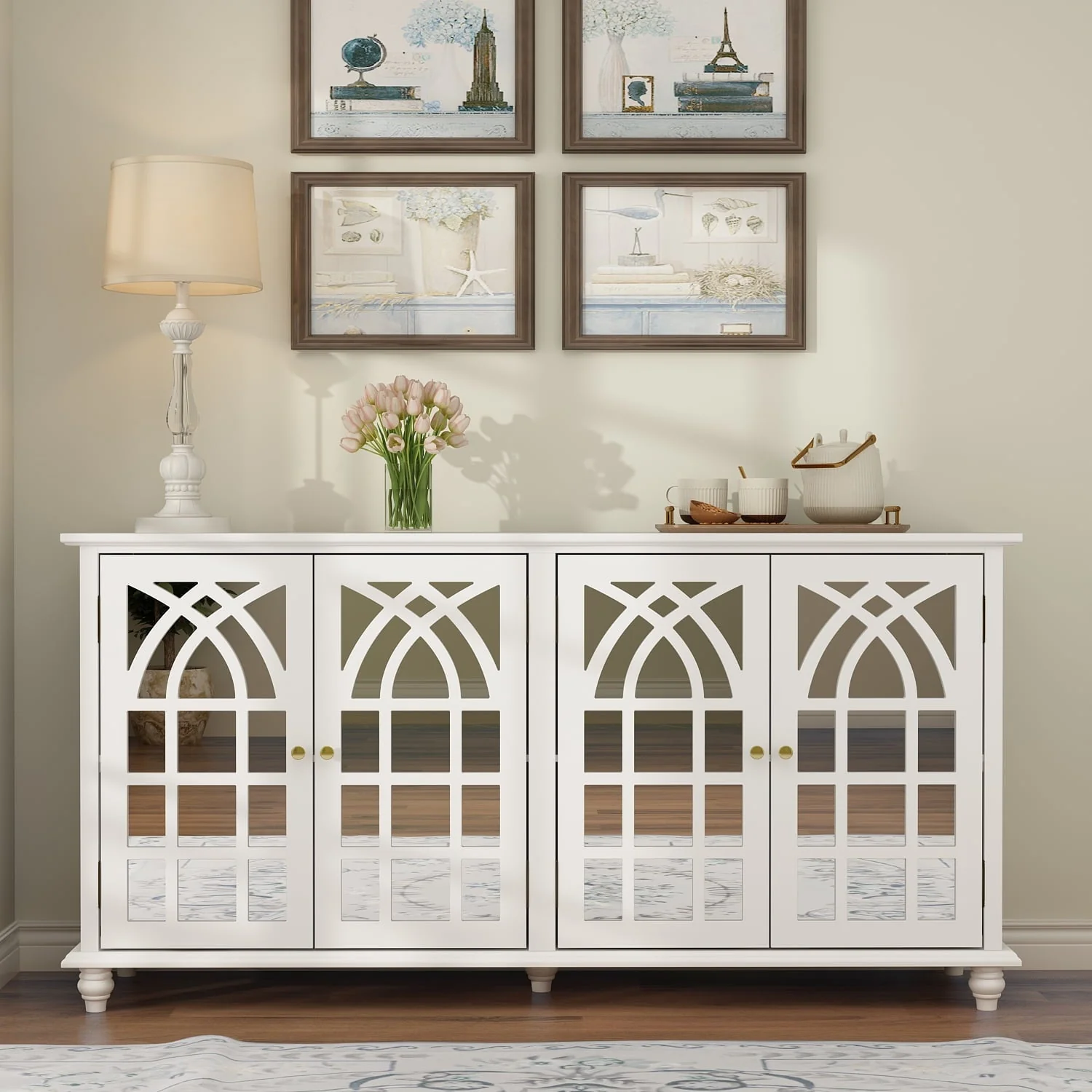 The dining Buffet server quatrefoil design kitchen storage cabinet with mirrored doors offers an elegant and luxurious storage solution to your dining space. This kitchen buffet features four mirrored front doors with elegant wood detailing that creates a beautiful transitional look. Featuring with a simply stylish design that catches all eyes and comes in different colors to match the decoration of your living space. Our space-saving console helps make your home feel aesthetic and neat. Spacious top for your family portraits, decorations, or plants. All parts and instructions are in one package that is shipped in a very secure box that has foam and protective boards surrounding it to avoid any damage to your furniture.