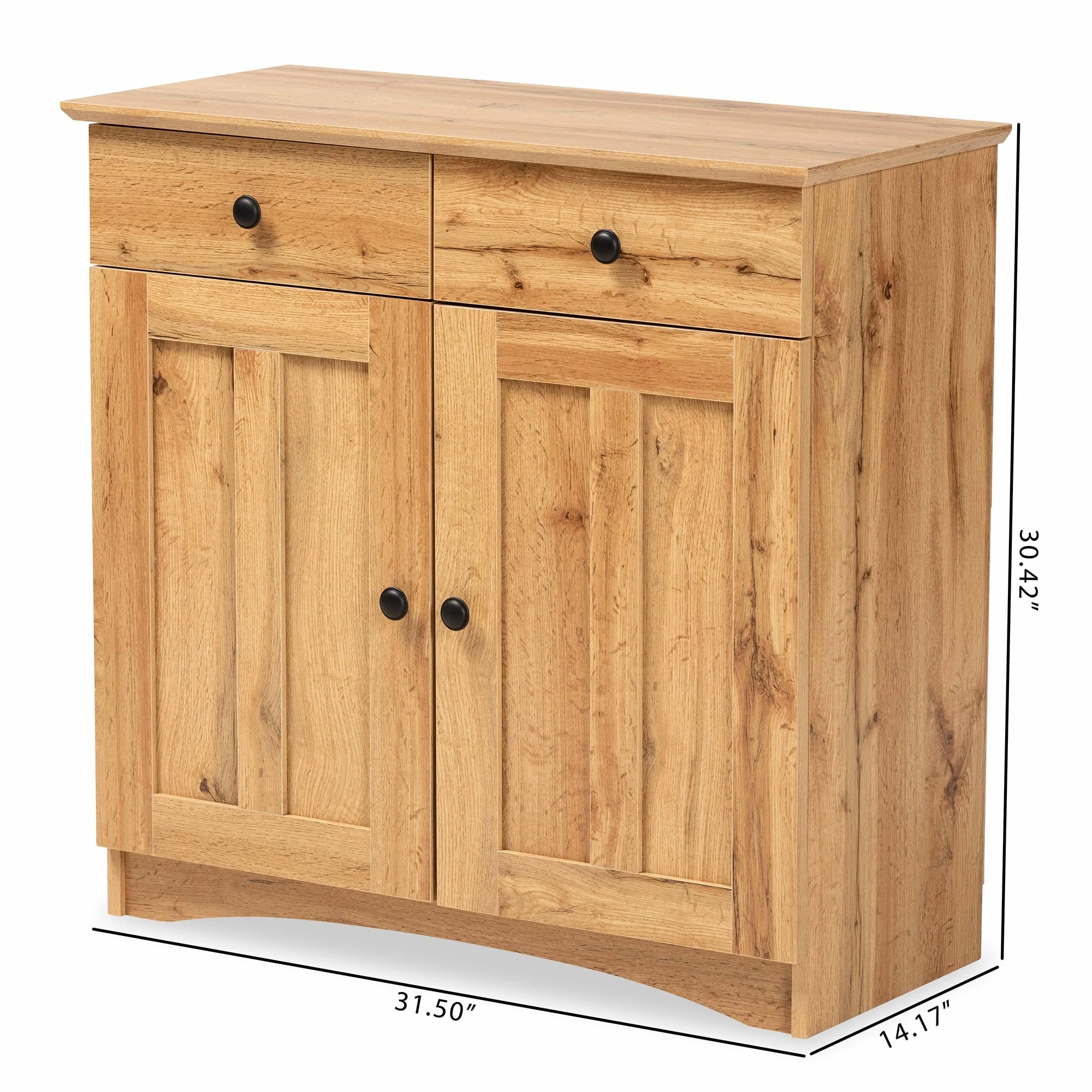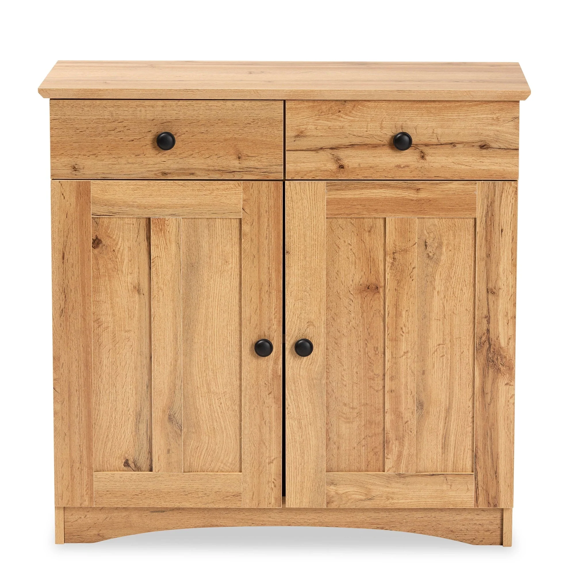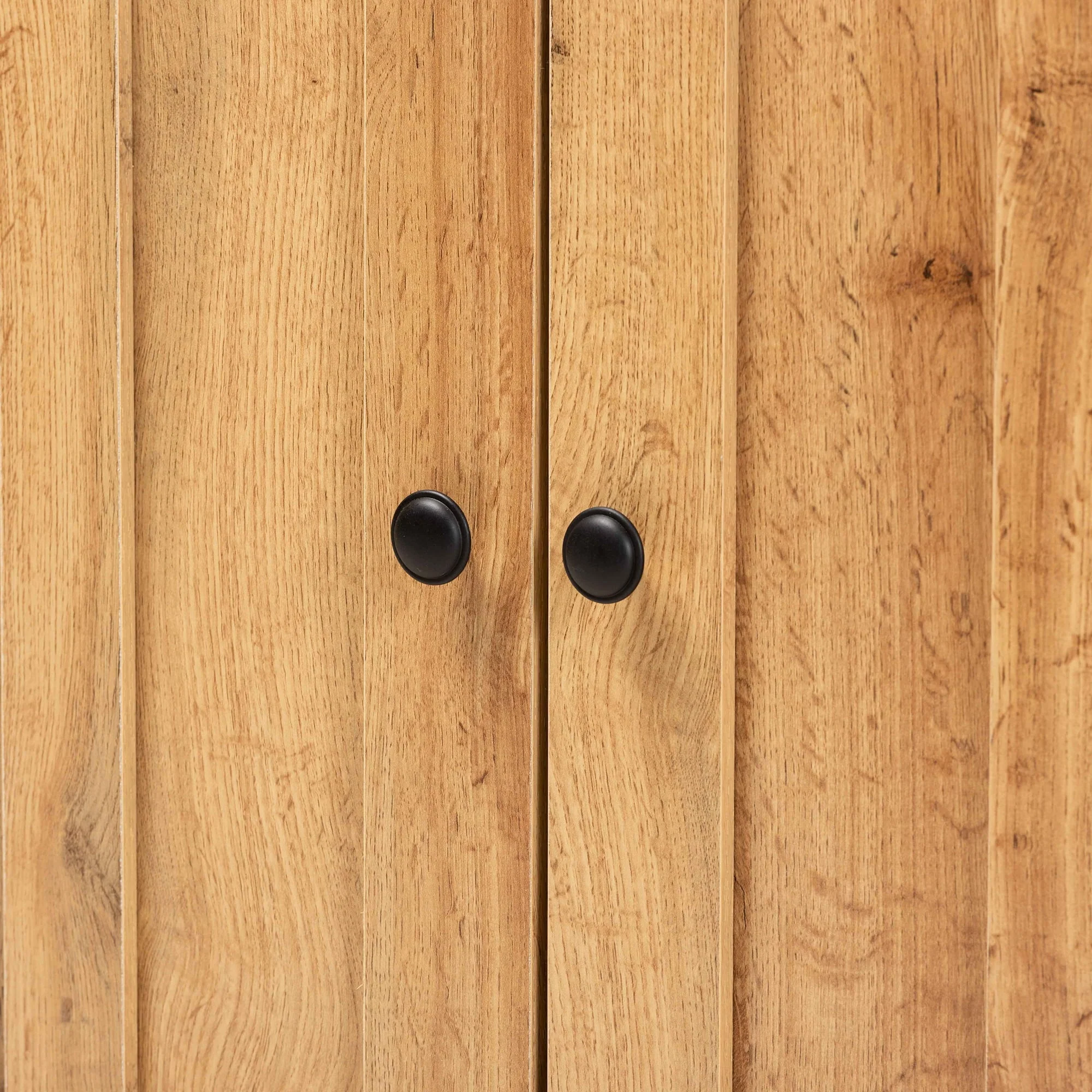 Grace your dining room with the clean, luxurious look of the Lauren kitchen cabinet. Made in Malaysia, this cabinet is constructed from sturdy wood featuring a natural oak brown finish for a timeless display that complements a wide range of interior designs. Two drawers, fitted with round black finished metal knobs, offer ample space to organize utensils, while two large shelves behind the doors provide space for large cookware. Requiring assembly, the Lauren showcases expert craftsmanship with inset detailing. With superb storage in a sleek, streamlined design, the Lauren kitchen cabinet elevates the efficiency of the modern kitchen.
