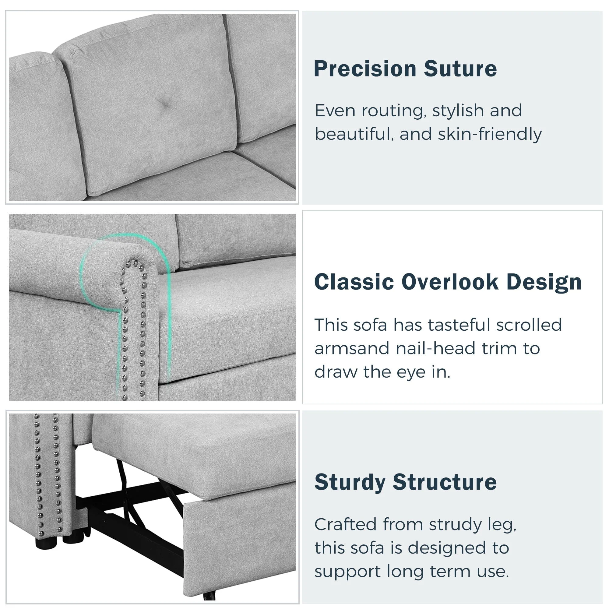 This L-shaped pull-out sleeper set is perfect for adding a cozy, casual feel to any space. It's made from a solid wood frame and upholstered in neutral-toned velvet fabric, so it can easily match a variety of different home environments. Featuring curled armrests and rivet accents, this sofa's classic design adds charm to your living room. Plush cushions and medium-firm seat cushions, and a chaise longue with storage so you can have extra sheets, pillows and blankets ready for visiting guests.