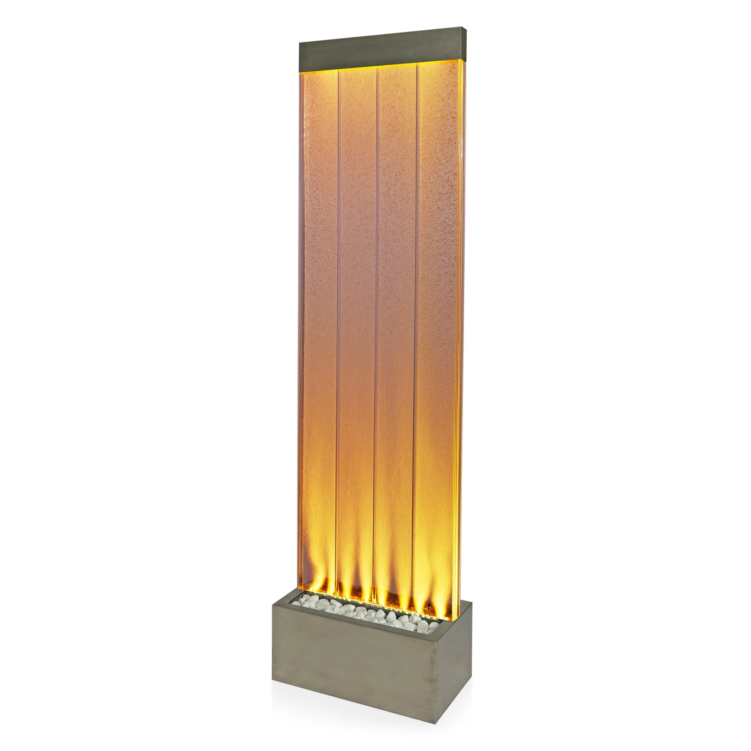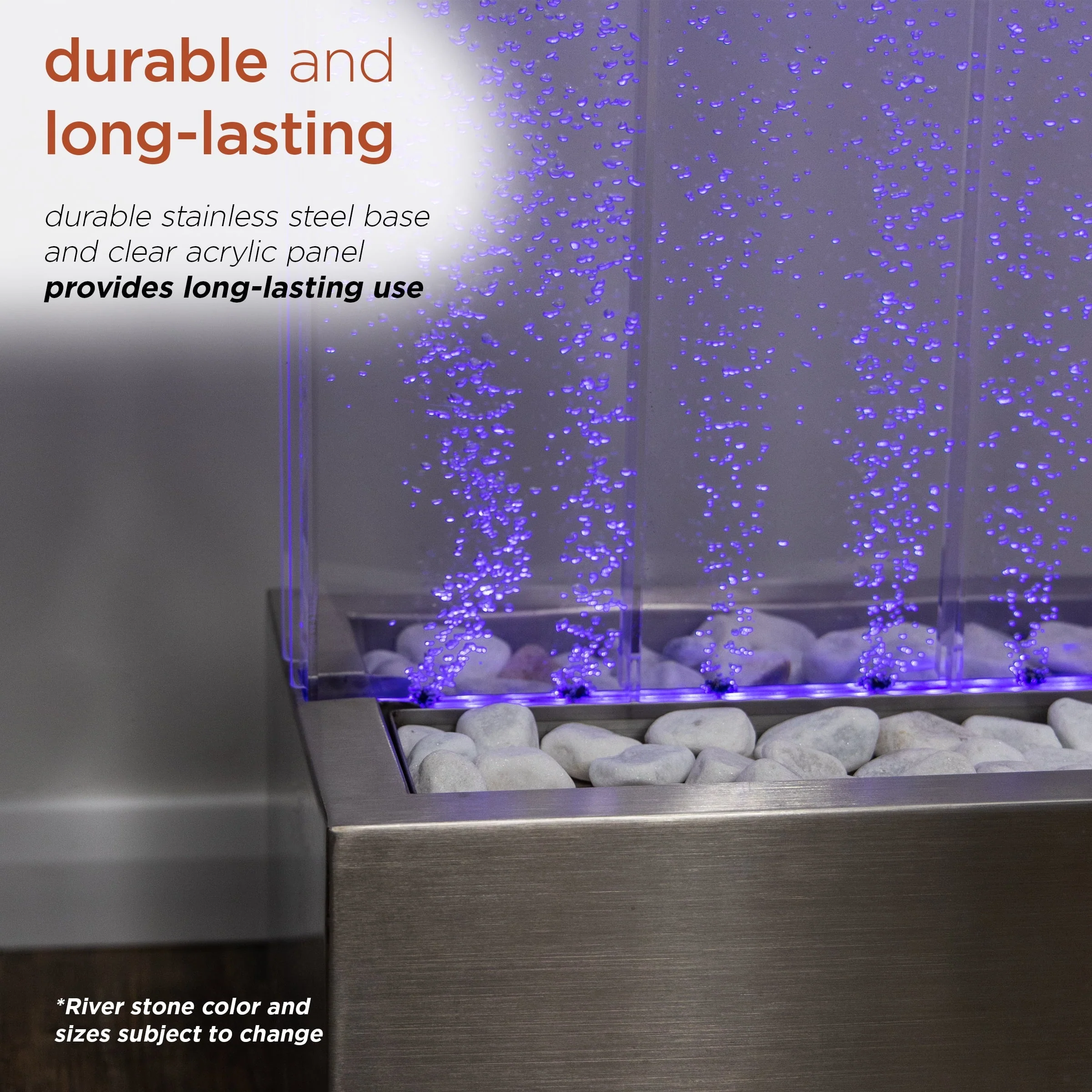Bring tranquility to your home with the Alpine Corporation 72"H Bubble Wall Fountain with Color-Changing LED Lights and Remote. This decorative bubble wall features water cascading down a clear bubble-filled panel into a stone-filled silver base with an interior pump that keeps the water flowing - just plug it in! The convenient remote allows you to select from 16 color options, 6 lighting options and turn it on and off. It is great for adding a calming ambiance in your entryway, living room, office and more. The durable stainless steel base and clear acrylic panel provide long-lasting use. To start using the fountain, simply plug in the 6-ft. cord, fill with water, and turn the switch on to start the calming water flow. This free-standing fountain measures 20"L x 11"W x 72"H and it includes a one year manufacturer's warranty from date of purchase.
