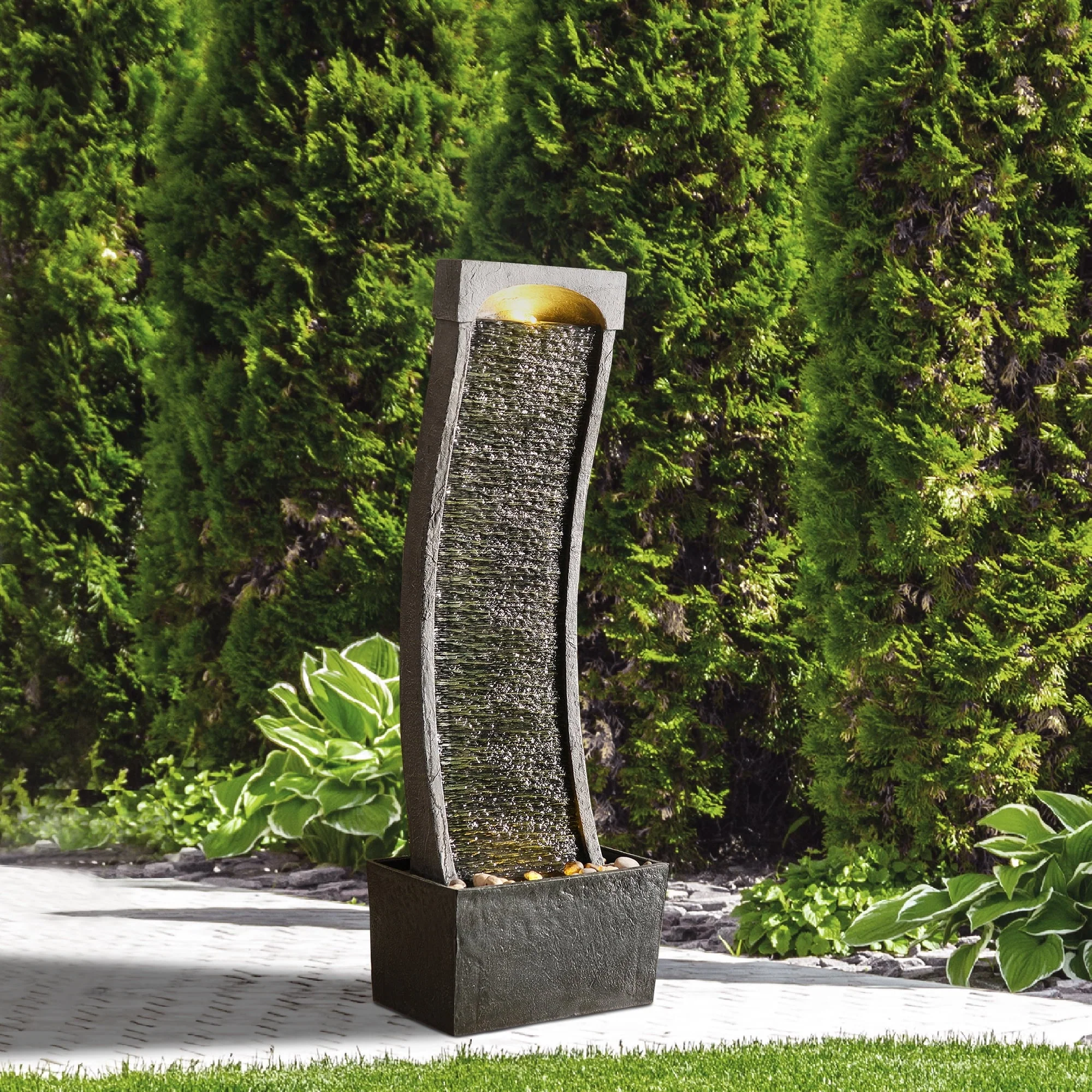 Turn your home's indoor or outdoor area into a relaxing oasis with the Teamson Home Indoor/Outdoor Modern Curved Slate Waterfall Fountain with LED Lights. This decorative waterfall fountain features natural slate ledgestone in a contemporary curved shape for a tranquil and soothing addition to your porch, backyard, or lawn. Constructed from durable polyresin with a natural look and realistic textures, the fountain is weatherproof and rust-resistant. The built-in LED lights keep this fountain illuminated to add a soft glow to your space. Relax to the sounds of the water flow as it trickles down from the top of the waterfall to the pebbled stone basin below for a peaceful escape. For convenient setup, the fountain includes a pump and all necessary parts for installation without the need to purchase additional hardware. This outdoor fountain measures 13" x 8" x 37.75" to easily fit in almost any outdoor space.