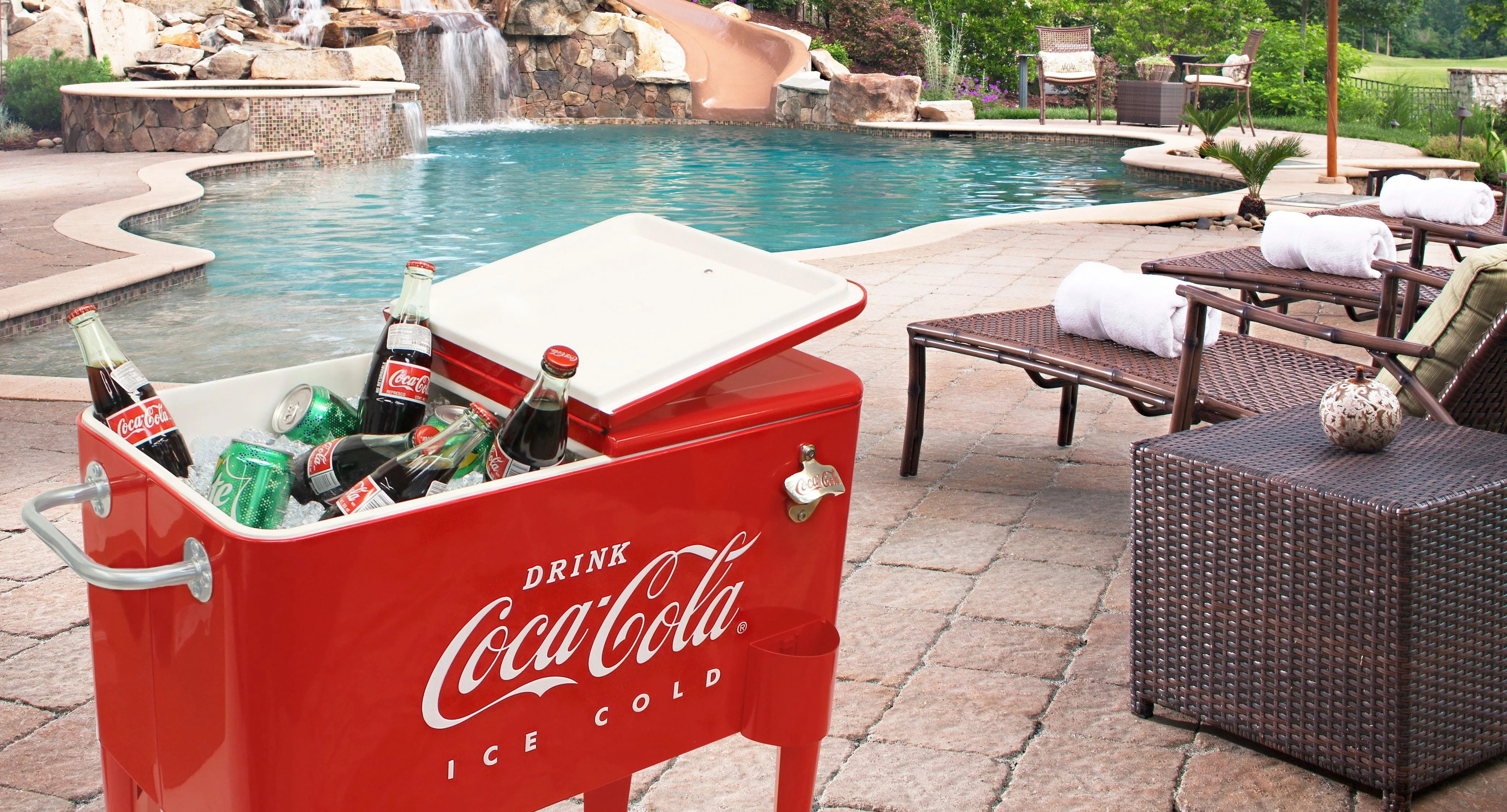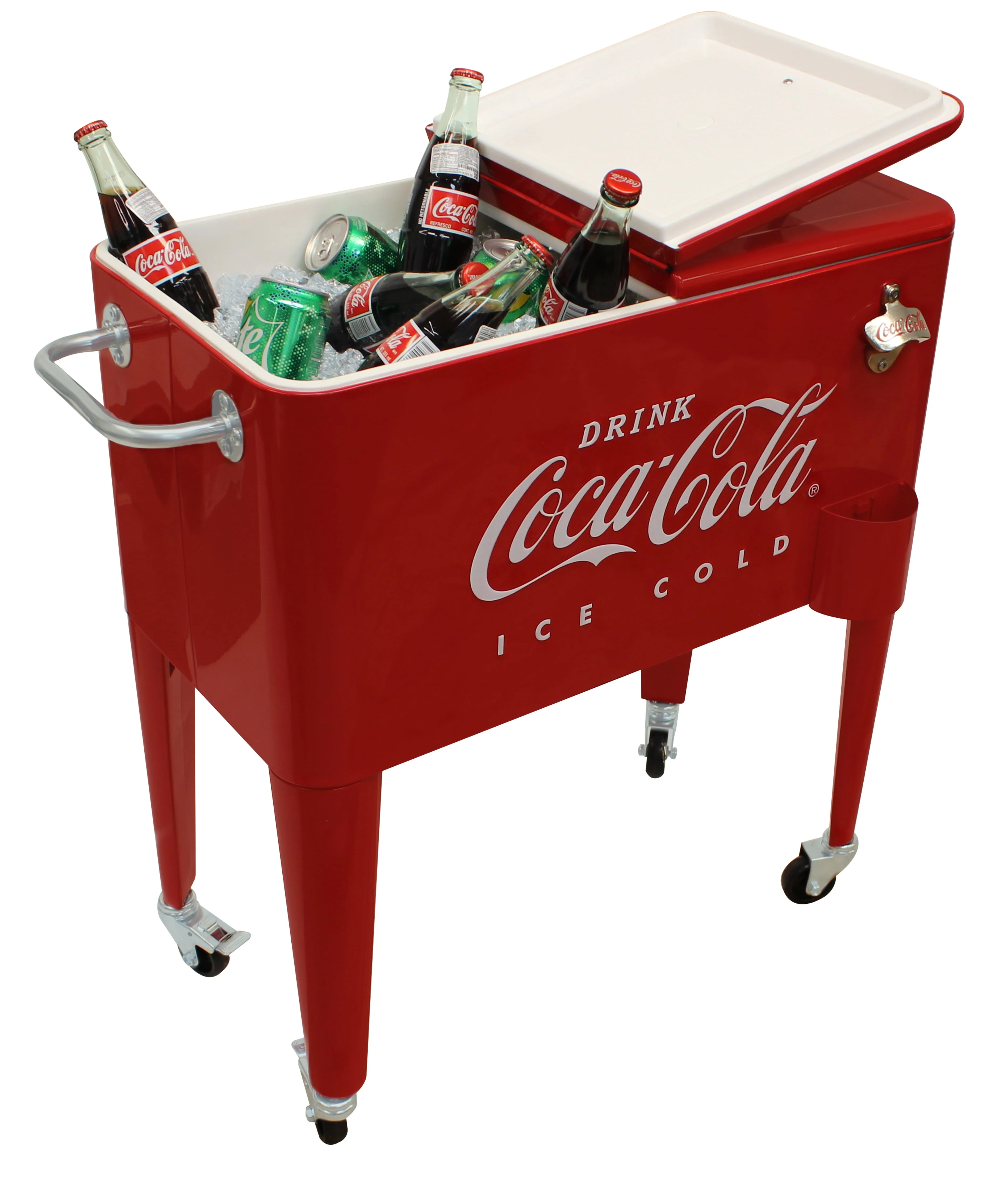 Get the party rolling with our Leigh Country CP 98105 Metal Embossed Retro Outdoor 60 Qt. Cooler Red. It includes a stainless-steel towel bar, a heavy-duty attached bottle opener with the Coca-Cola logo, and attached cap catcher. It's a great way to take the party where you need it and since the casters have brakes, it rolls only when you want it to. Embossed Coca-Cola logo on side of cooler. Part of our Leigh Country Coca-Cola licensed outdoor coolers.