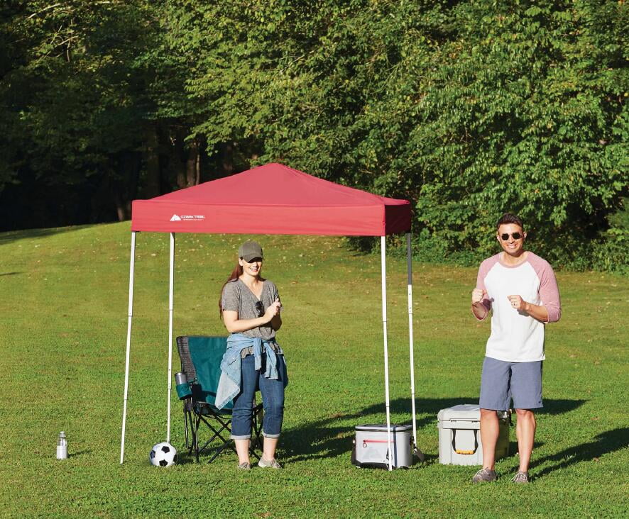Stay protected from the elements with the Ozark Trail 4' x 6' Instant Canopy. It's suitable for camping, fishing and hunting trips, flea markets, the beach and much more. This portable canopy tent can also be used to cover a buffet table during an outdoor party. It's height-adjustable and sets up and disassembles in just minutes, so it can be put to use quickly or taken down in a hurry. The outdoor instant canopy packs away nicely into a storage bag for easy transport when finished using it for the day. It can be stored in the garage, trunk or in a closet until needed and is lightweight so it can be taken along during travel or up and down steps with ease. This Ozark Trail 4' x 6' Instant Canopy provides 24 sq ft of coverage, which makes it ideal for concerts, barbecues, reunions and much more to provide protection from the sun's rays, rain and other elements. It has been made with high-quality materials and a sturdy frame, ensuring extended use.
