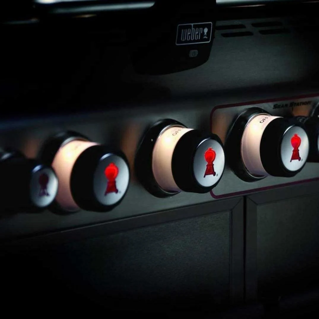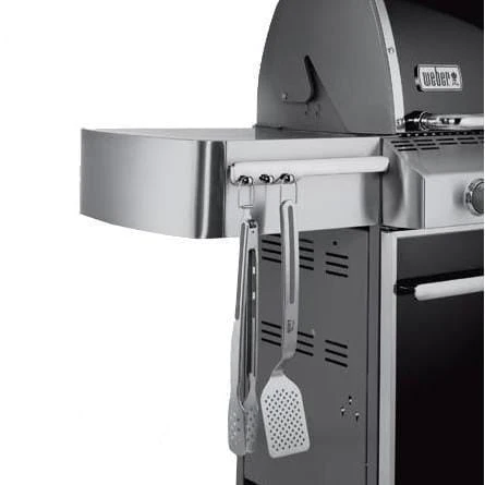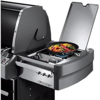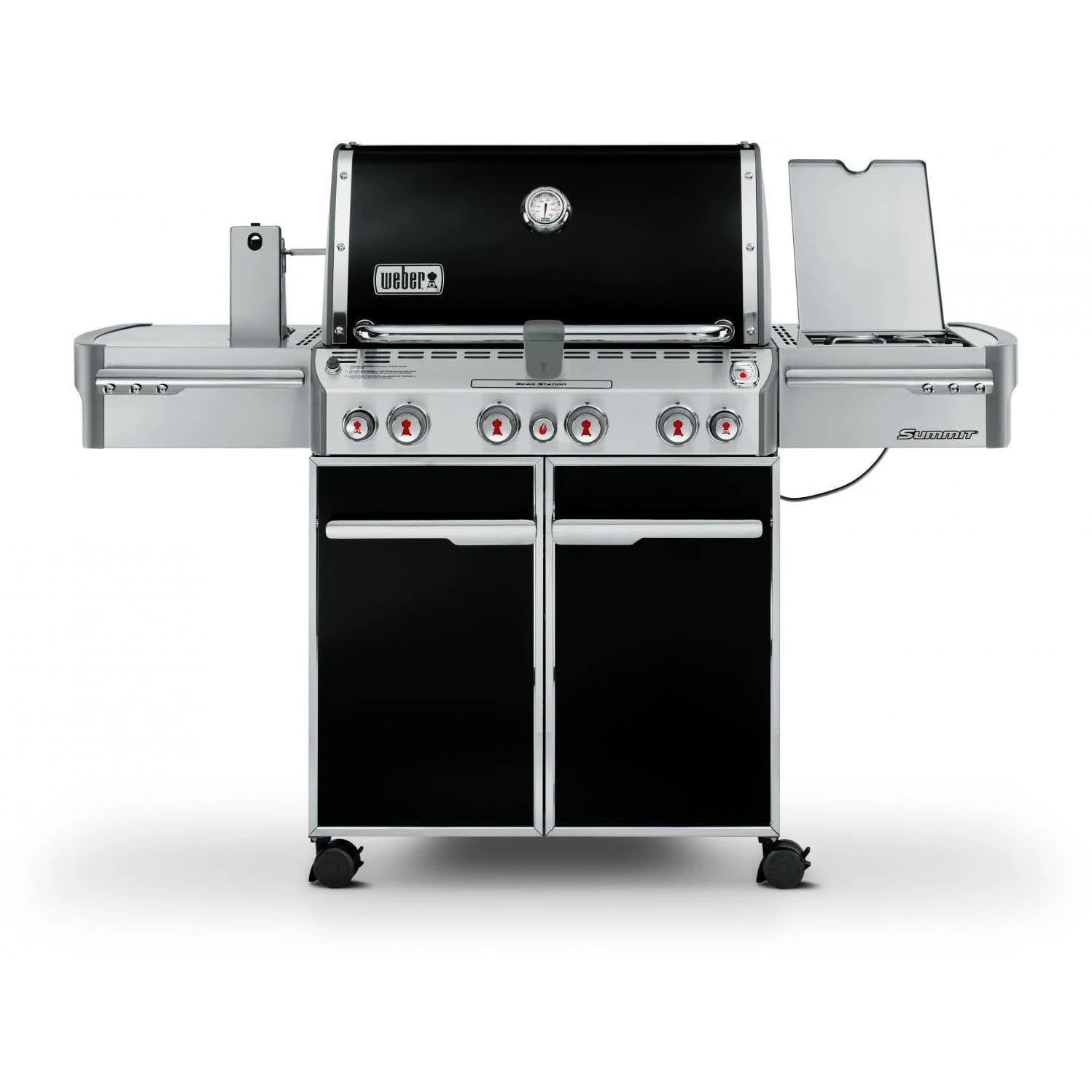 Weber Summit E-470 Propane Gas Grill With Rotisserie, Sear Burner & Side Burner - Black - 7171001. 7171001. Gas Grills. Summit Series gas BBQ grills are the crown jewels of the Weber family, with exclusive features, the highest level of performance and stunning looks. The Weber Summit E-470 is beauty redefined, but it adds more than just style to your backyard. The porcelain-enameled E-470 features 4 stainless steel burners that produce 48,800 BTUs and a 10,600 BTU Sear Station, each with Snap-Jet individual burner ignition to help you get the party started as quickly as possible. The Summit E series propane gas grill comes fully equipped with 9mm (3/8 inch) stainless steel rod cooking grates and stainless steel Flavorizer bars to effectively hold and distribute heat evenly over the 468 square-inch main cooking grid. The warming rack provides an additional 112 square inches for a generous 580 square inches of total cooking area. Summit grills come equipped with a stainless steel grease tray with a catch pan to make clean-up as easy as possible. This Weber E-470 also has a 12,000 BTU flush-mounted side burner that lets you multi-task while grilling, a stainless steel smoker box with a dedicated 6,800 BTU smoker burner and a 10,600 BTU infrared rotisserie rear burner. The Tuck-Away rotisserie system features a flip-up motor and separate spit rod and fork storage inside the cart. This Weber Summit grill has a porcelain-enameled frame and lid and a front-mounted control panel with LED lighted control knobs and a backlit LED propane scale, which works in conjunction with the precision fuel gauge to let you know exactly where you stand on fuel at all times. The attractive black hood has a polished handle and trim and a center-mounted thermometer to monitor cooking temperatures. The grill cart features an enclosed storage area to keep your propane tank out of sight and four heavy-duty casters (2 locking and 2 swivel). The two stainless steel side shelves provide expansi...