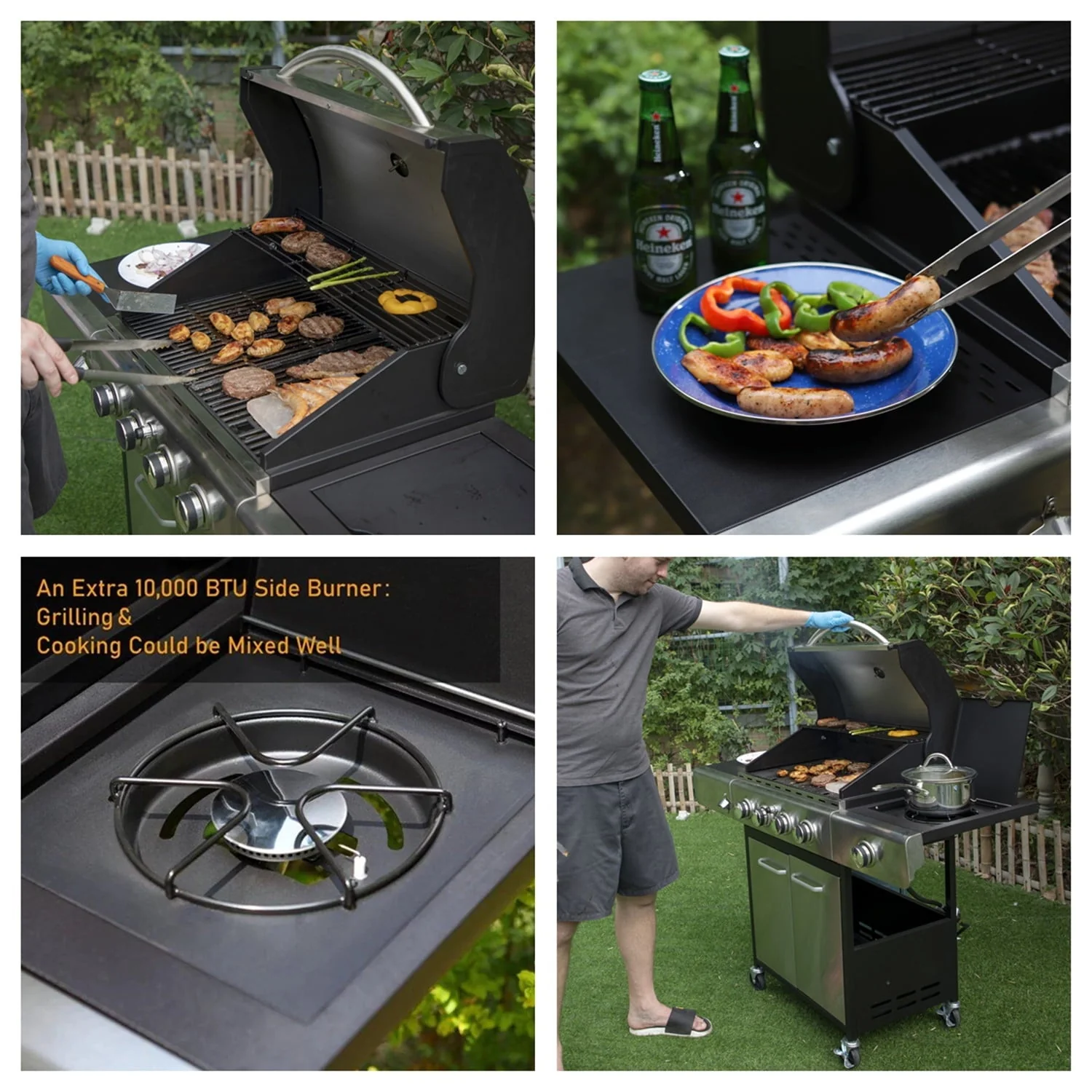 Summit Living 4 Burner Propane Gas Grill with Side Burner is crafted from stainless steel and premium porcelain-enameled materials. With 542 sq. in. of total cooking space this BBQ grill offers enough space to cook for small gatherings or large parties. Its even heat cooking system includes porcelain-enameled cast iron gates, stainless steel burners and porcelain-enamel flame tamer that work together to distribute consistent heat across the entire cooking surface and to reduce grill flare-ups.The double-layer stainless steel lid ensures that the food is evenly warmed, making it more delicious, and it is easy to wipe and clean. It has 4 Stainless Steel burners, can put out 42,000 BTU for per-hour with integrated piezoelectric ignition system, quick start up with the push and turn of a control knob, which is suitable for family gathering or parties.