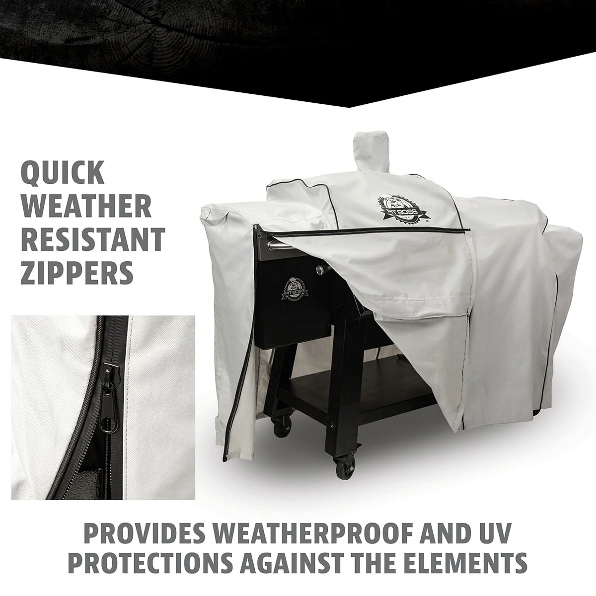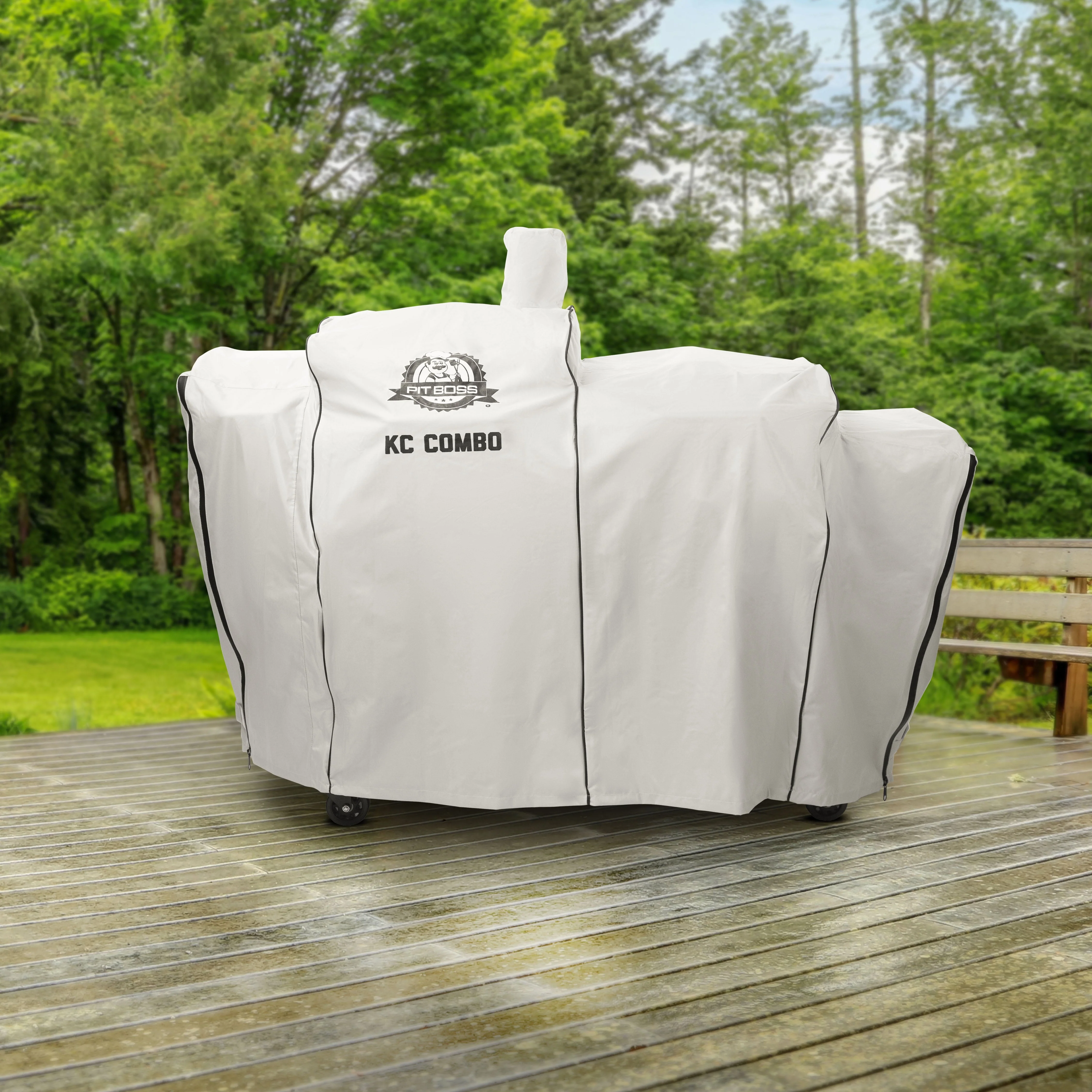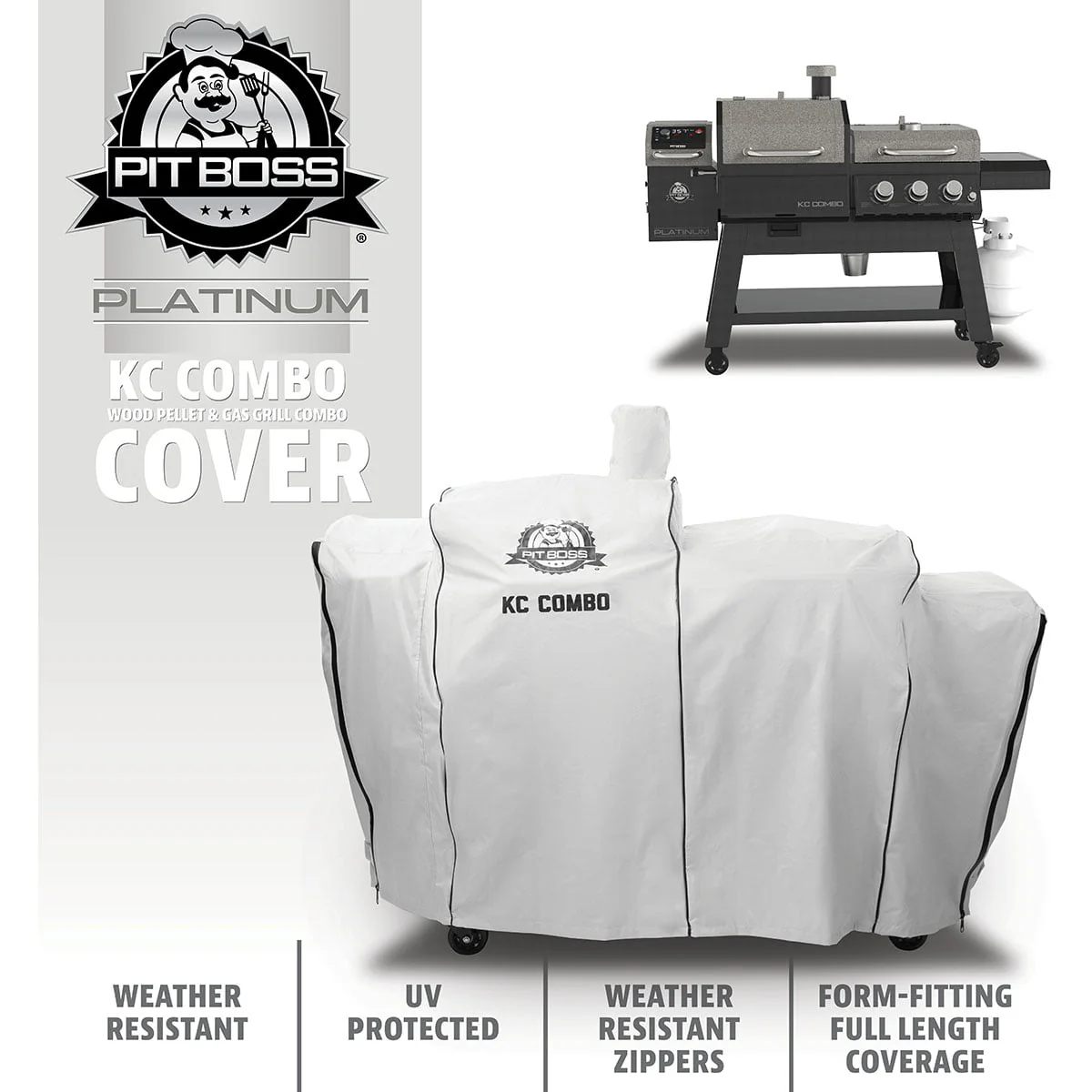 Protect your KC Combo Platinum Grill with a custom-fitting grill cover from Pit Boss available exclusively at Walmart. This cover offers dependable protection made from 600D polyester material and a reinforced PVC backing. With its durable, weather-resistant material, the Platinum KC Combo Grill Cover will prevent outdoor elements like rain, wind, and snow from messing with your grilling machine. When your KC Combo is not in use, built-in UV protection provides shelter from sun damage while zipper closures and easy-to-grip handles make it quick and easy to add or remove the full-length, form-fitting coverage. It's the only grill cover with everything you need to keep your KC Combo Platinum Grill in top shape for years to come.