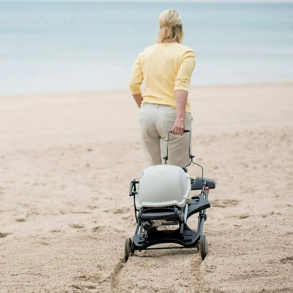 Grill beyond your patio. The Weber Portable Cart is designed to make grilling on-the-go as easy as flipping a burger. Place your Q grill onto the cart and use it as a stationary stand that sits at the optimal grilling height. When ready to take your grilling adventures on the road, simply fold it down and roll it to your car or straight to the beach.