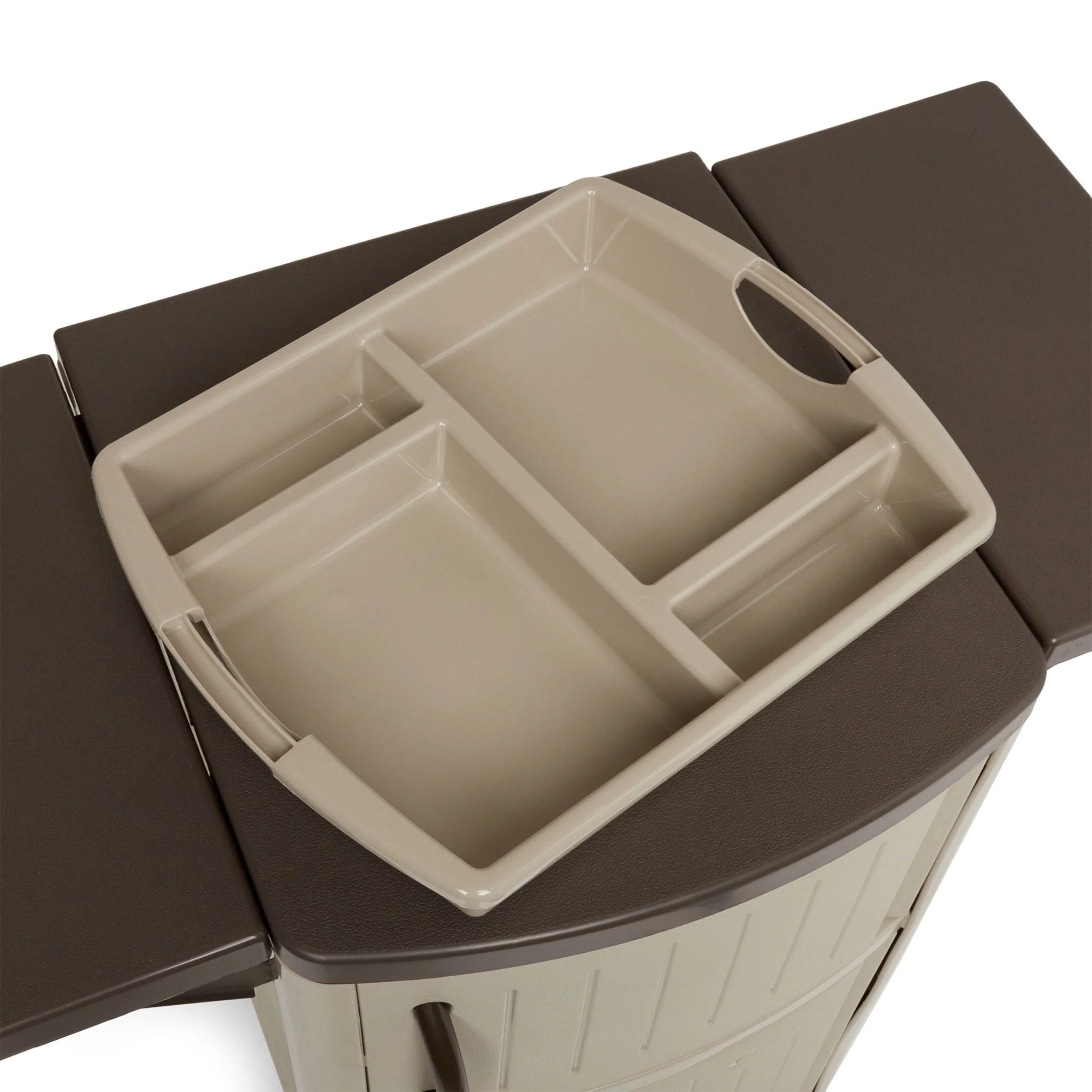 This Suncast serving station patio cabinet has a lot of space for organizing salad, drinks, napkins, condiments and other supplies required for meal preparation. It is constructed of plastic which is low maintenance and resists rust and fading from the outdoor elements. This versatile meal prep cabinet provides 40 inches of counter space with convenient drop leaf extensions for serving. The easy-gliding casters make this serving station highly portable, and the 2-wheel lock for safety when you are using the cabinet for food preparations. Upper and lower cabinets provide space for storing grilling tools or serving supplies and the included removable tray is great for both organization and entertaining.