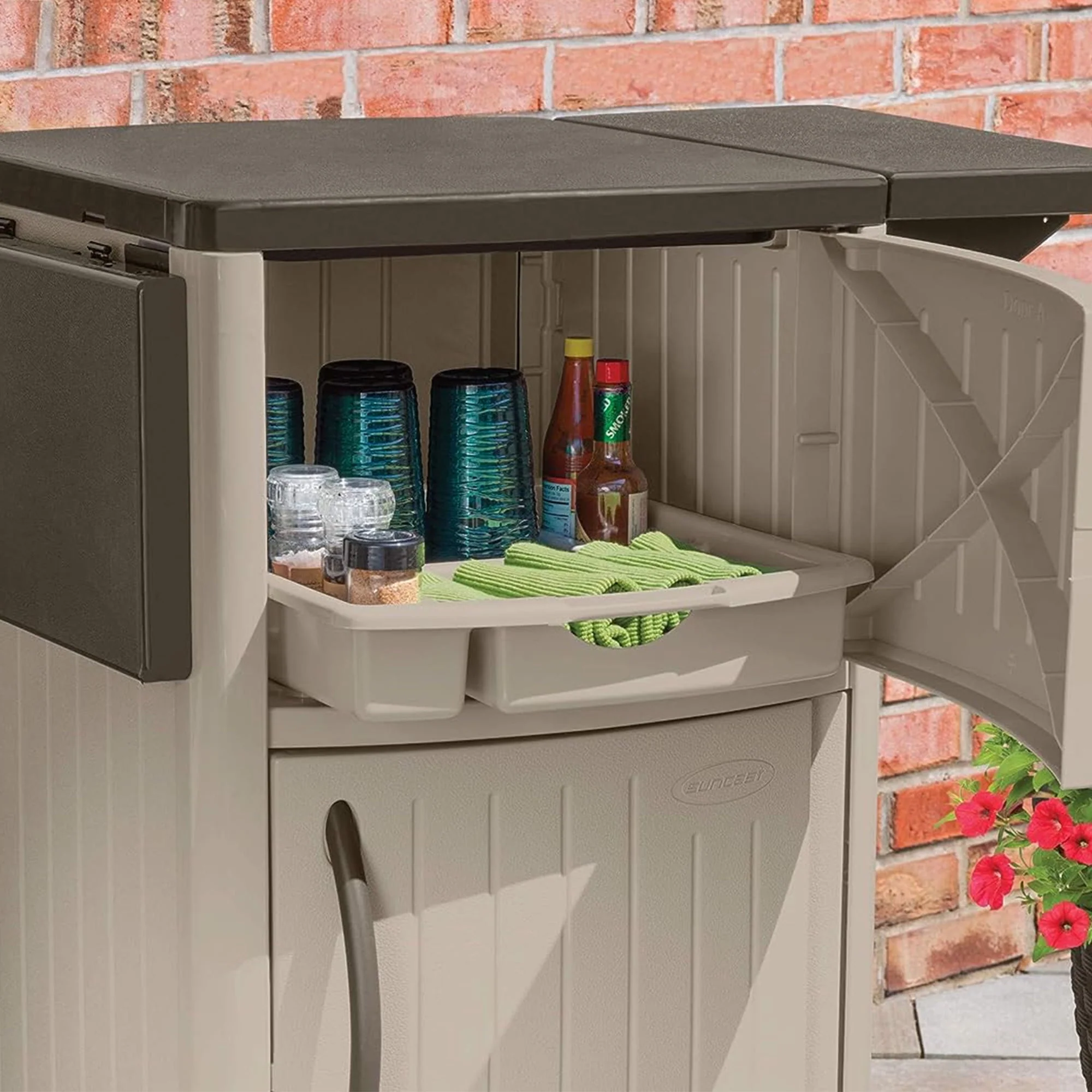 Time to grill but don't have enough space to set everything nearby? Forget running back and forth into the house and simply open up the Portable Outdoor Patio Serving Station Table and Cabinet. Serve up the good times with the Suncast Serving Station Patio Cabinet. The classic design makes a great addition to your yard, deck or patio and comes in handy for all outdoor entertaining and cooking purposes. Great for entertaining and dining al fresco.