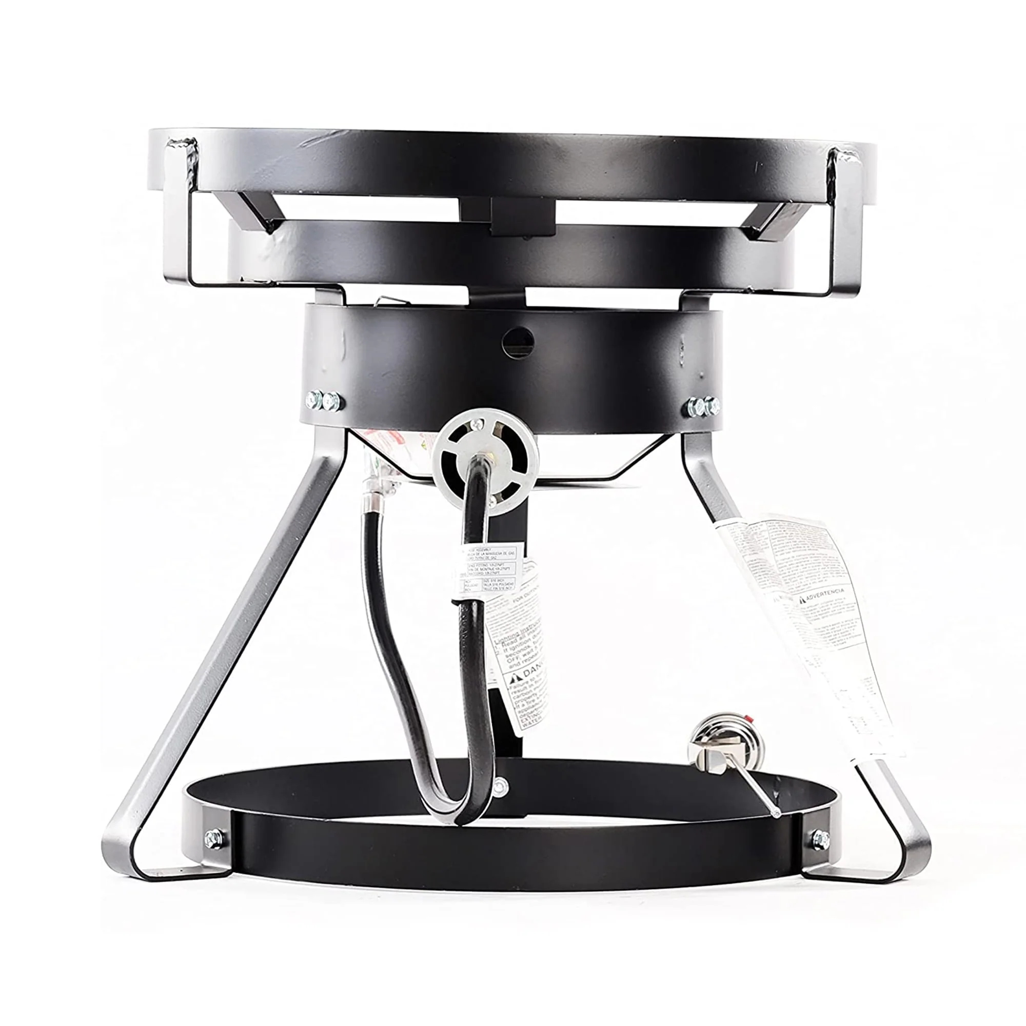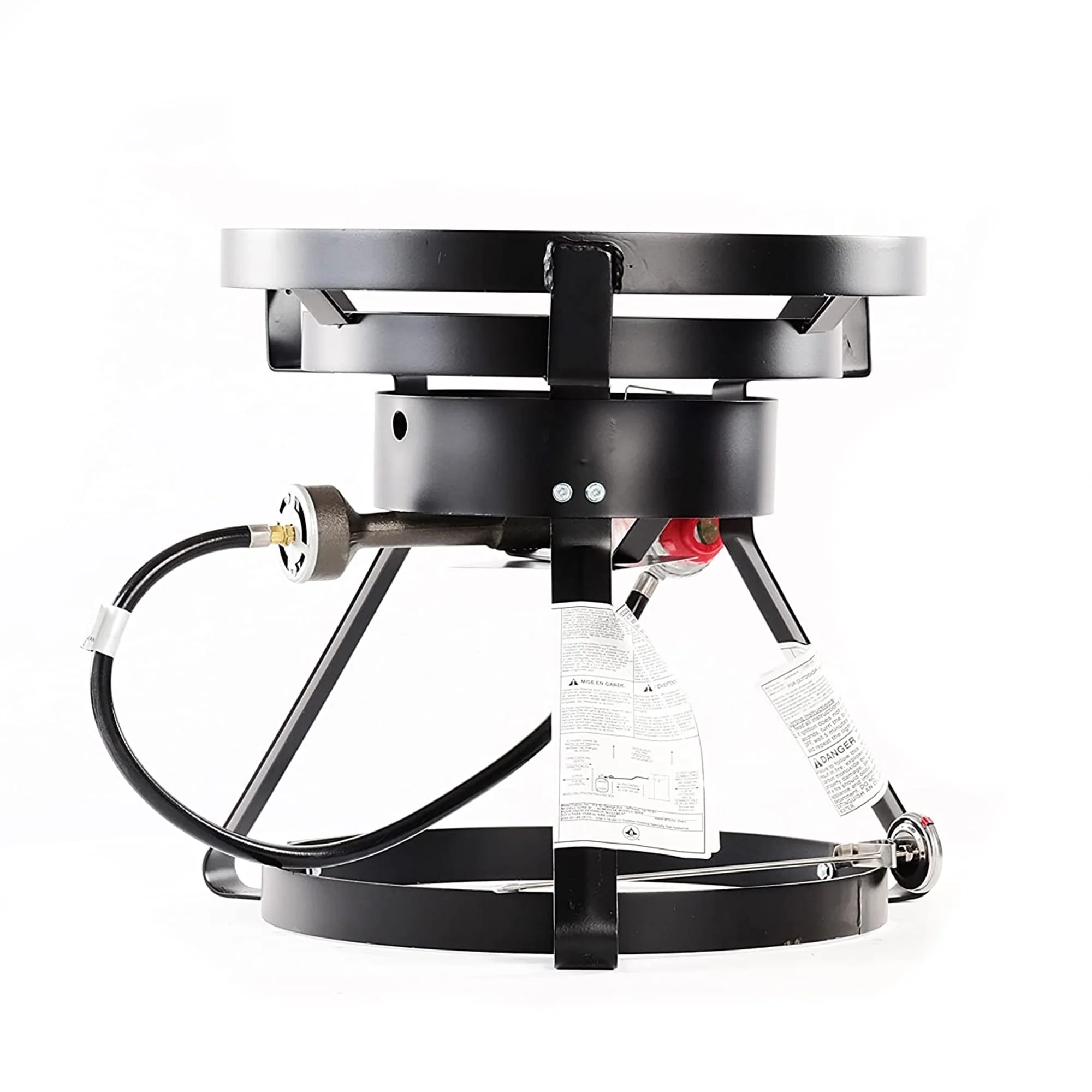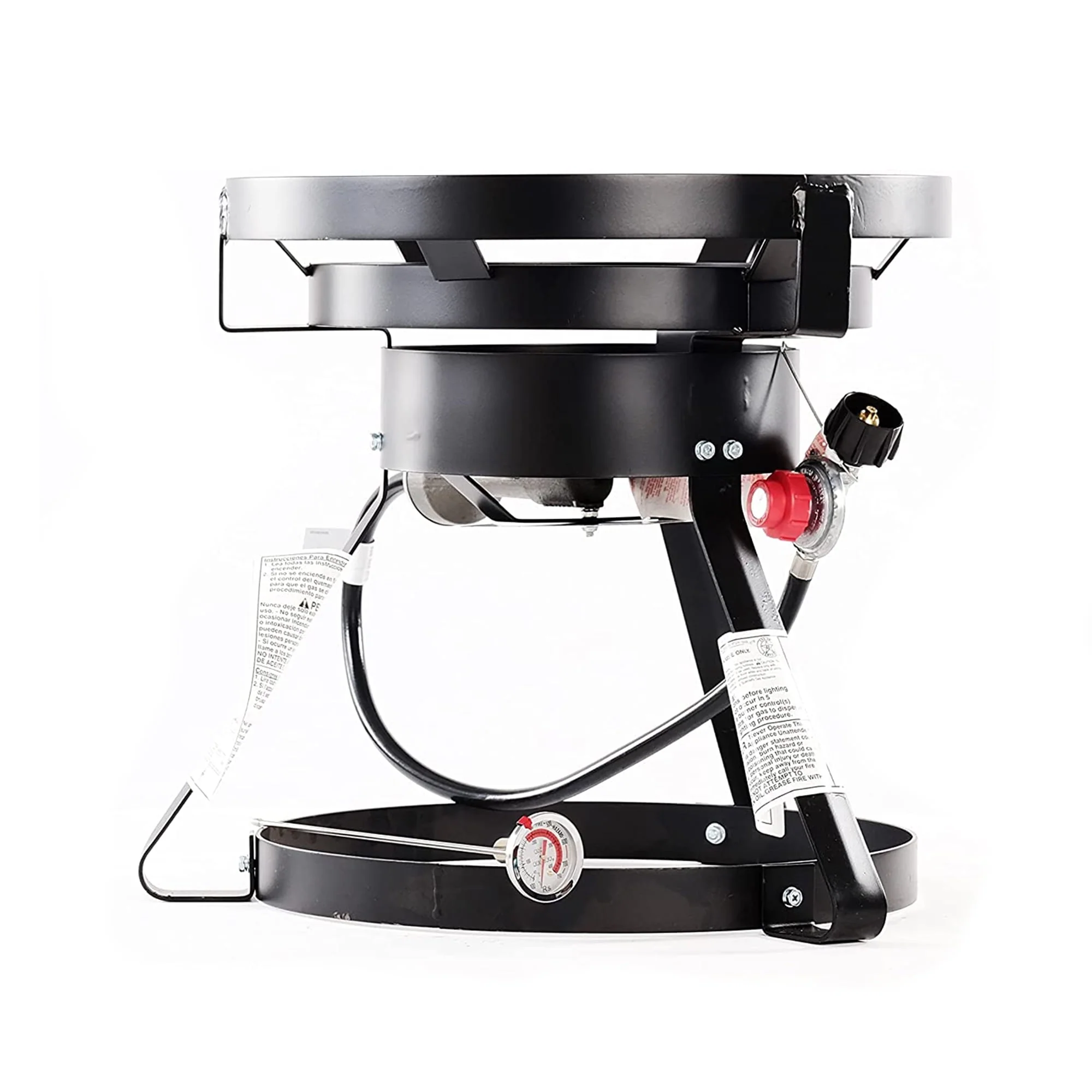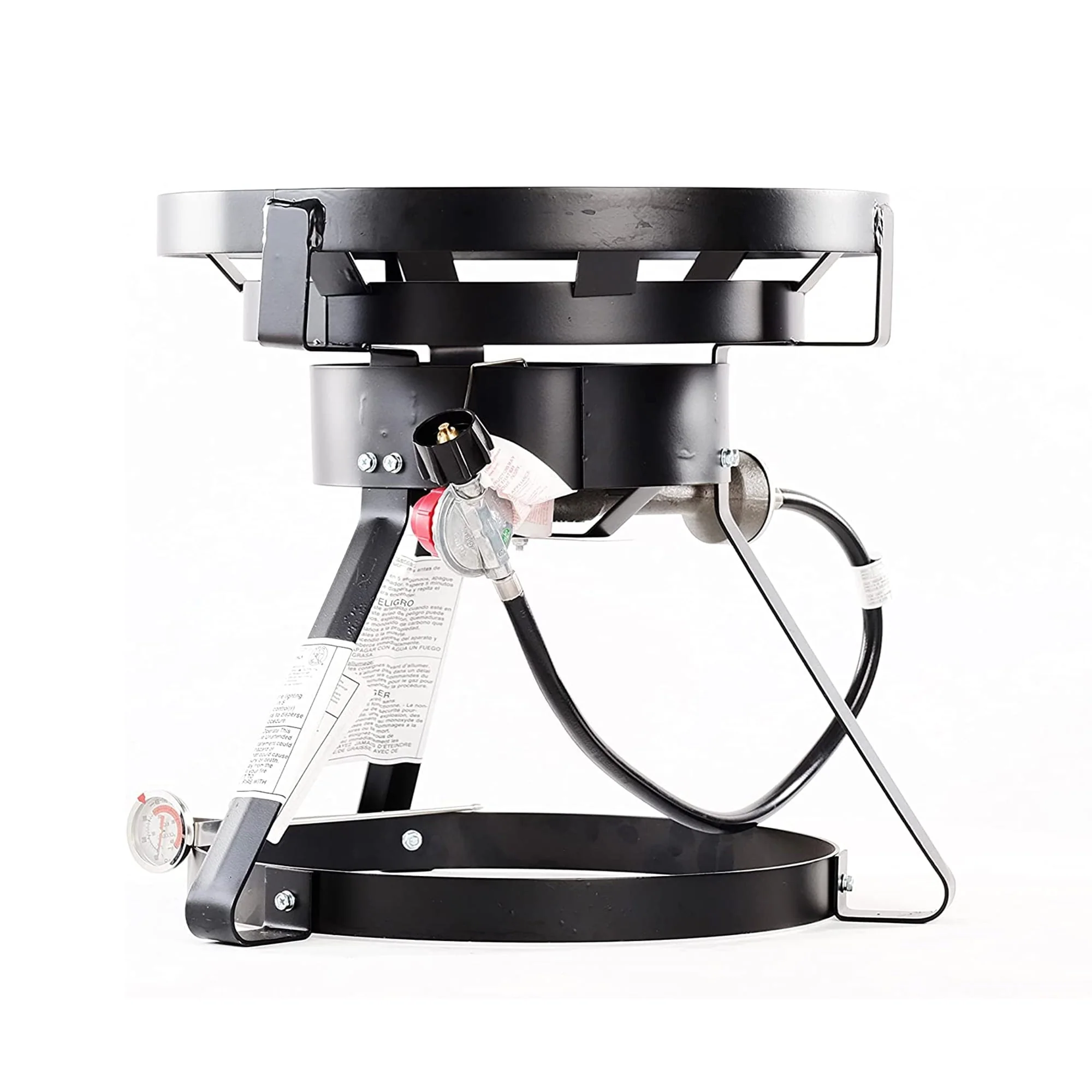 Supported with a solid metal frame, the burner puts out up to 60,000 BTUs of heat, perfect for cooking any large meal. The recessed top ring keeps the pot itself stable, while the large bottom ring provides extra safety and stability while cooking. A flame-protective wind guard keeps your burner working even in windy conditions, great for outdoor food prep. Included with the package is the listed LP hose and regulator with a Type 1 connection, a deep fry cooking thermometer for extra control, and an instruction and recipe booklet.