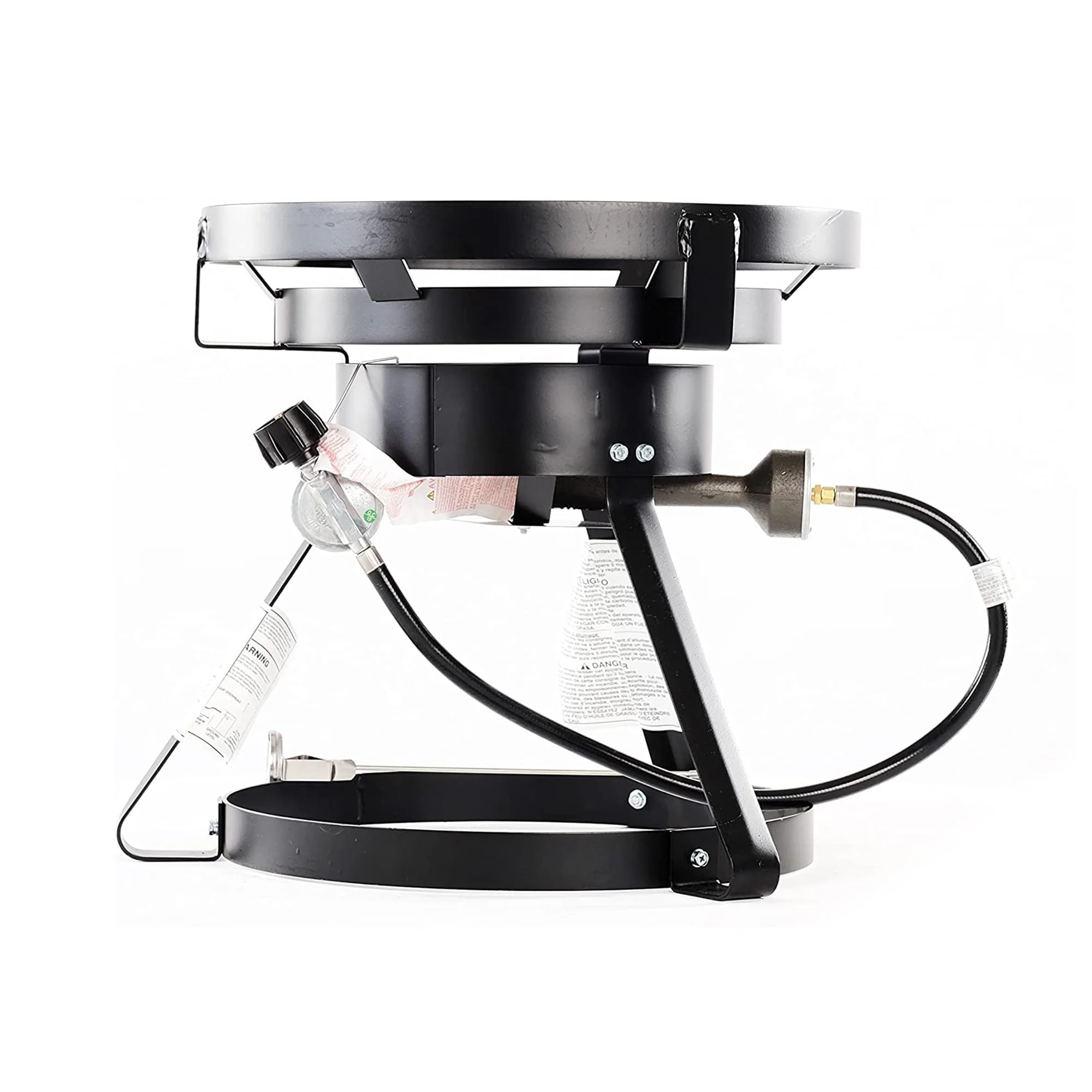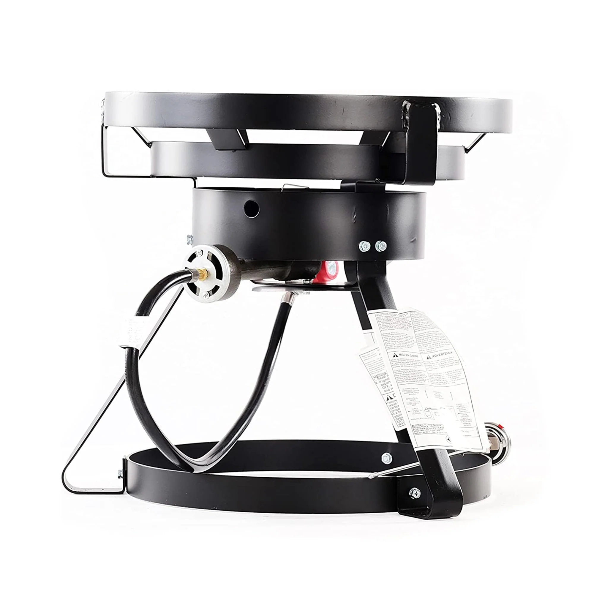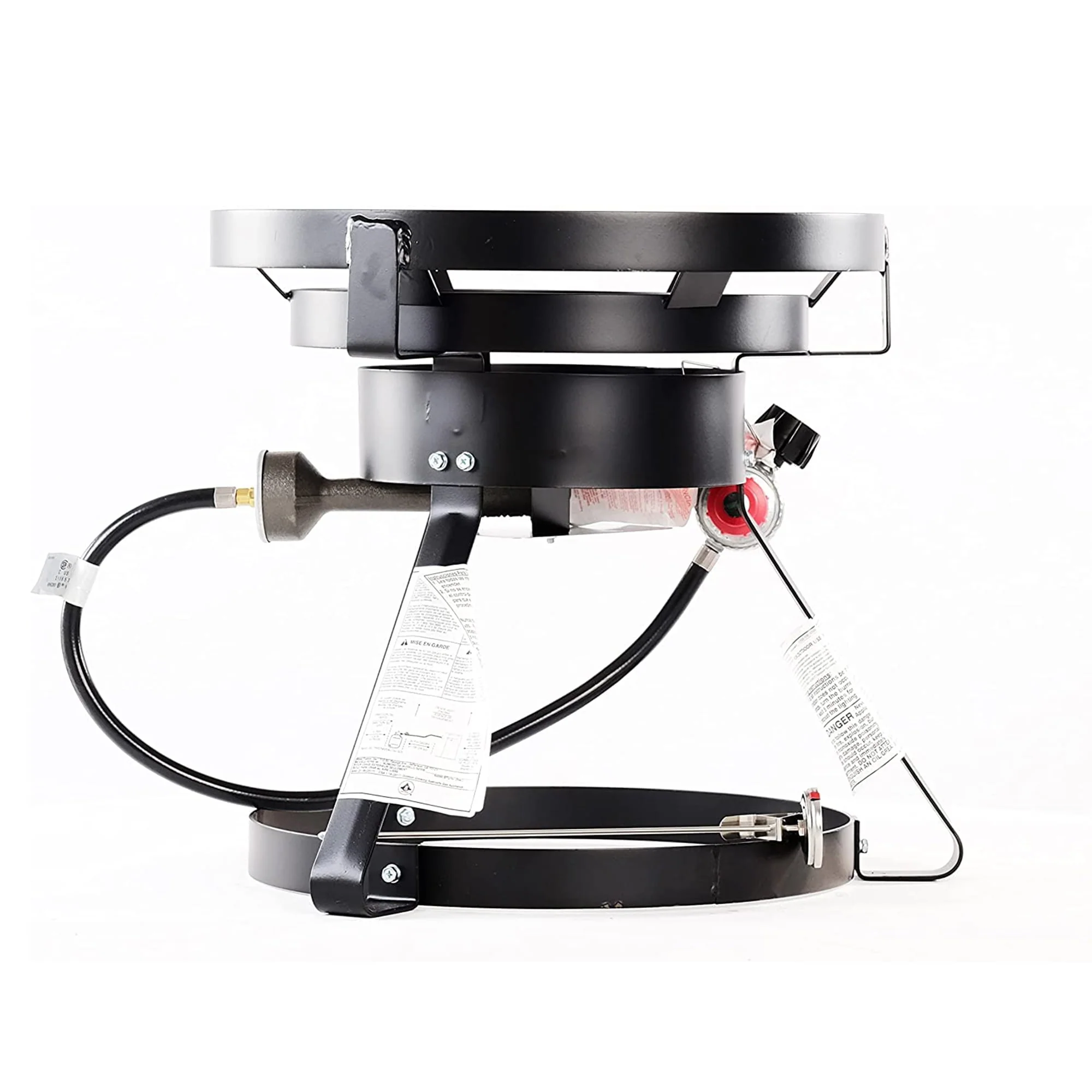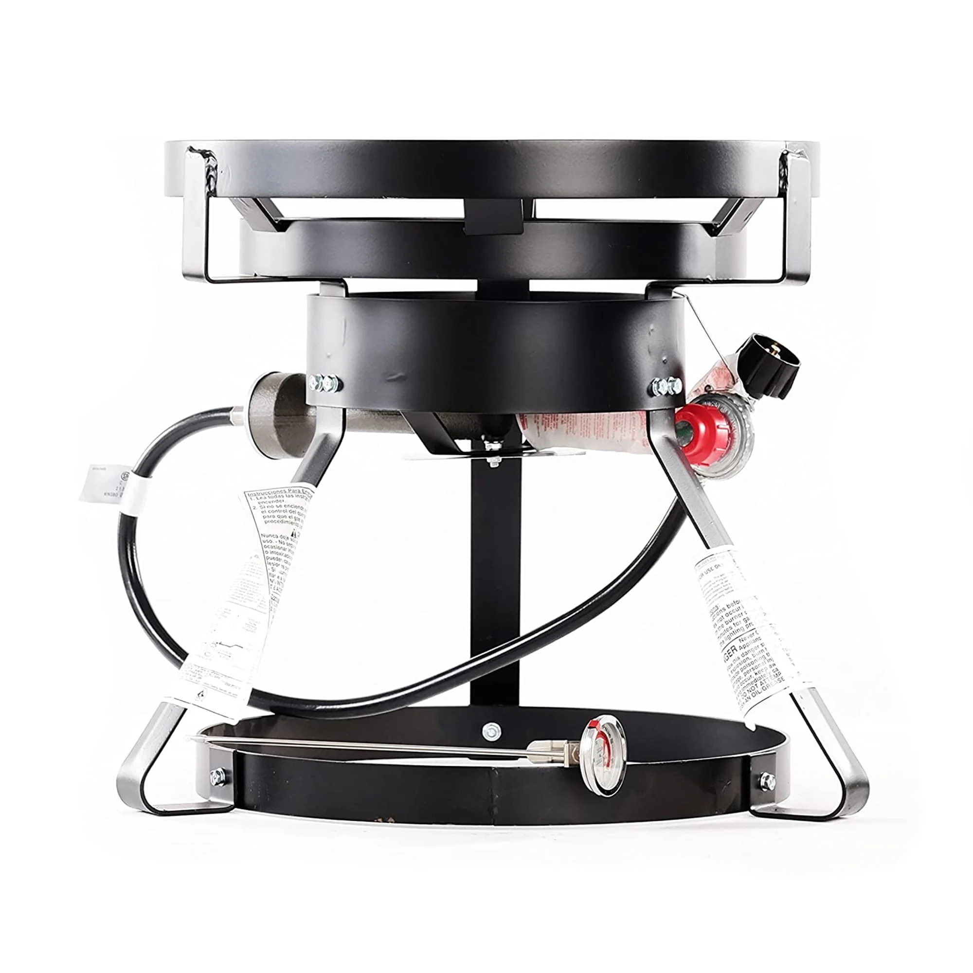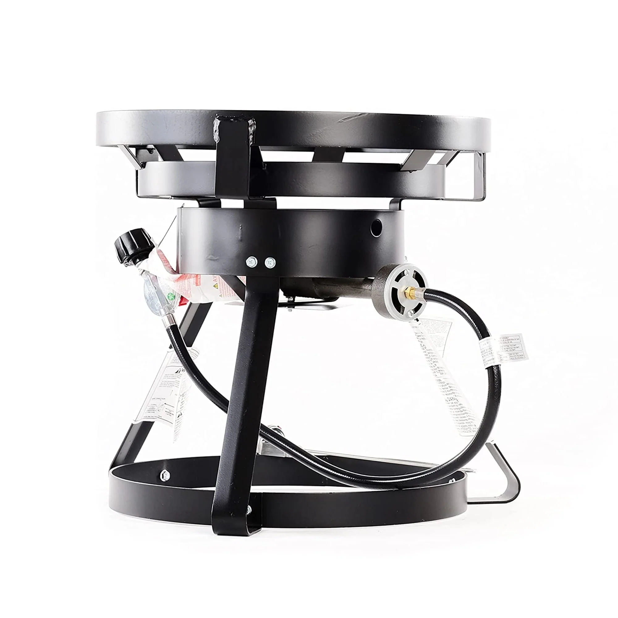 Supported with a solid metal frame, the burner puts out up to 60,000 BTUs of heat, perfect for cooking any large meal. The recessed top ring keeps the pot itself stable, while the large bottom ring provides extra safety and stability while cooking. A flame-protective wind guard keeps your burner working even in windy conditions, great for outdoor food prep. Included with the package is the listed LP hose and regulator with a Type 1 connection, a deep fry cooking thermometer for extra control, and an instruction and recipe booklet.
