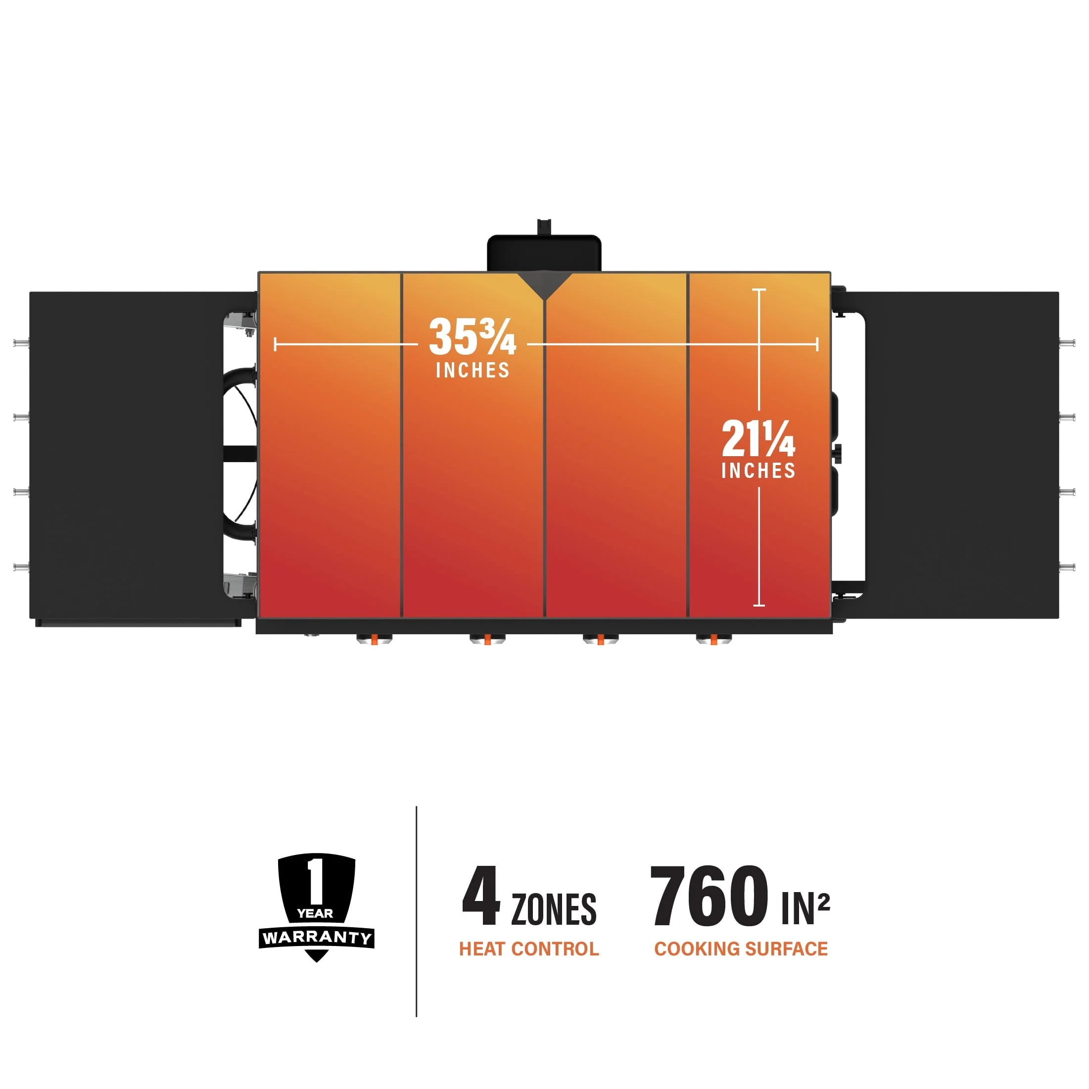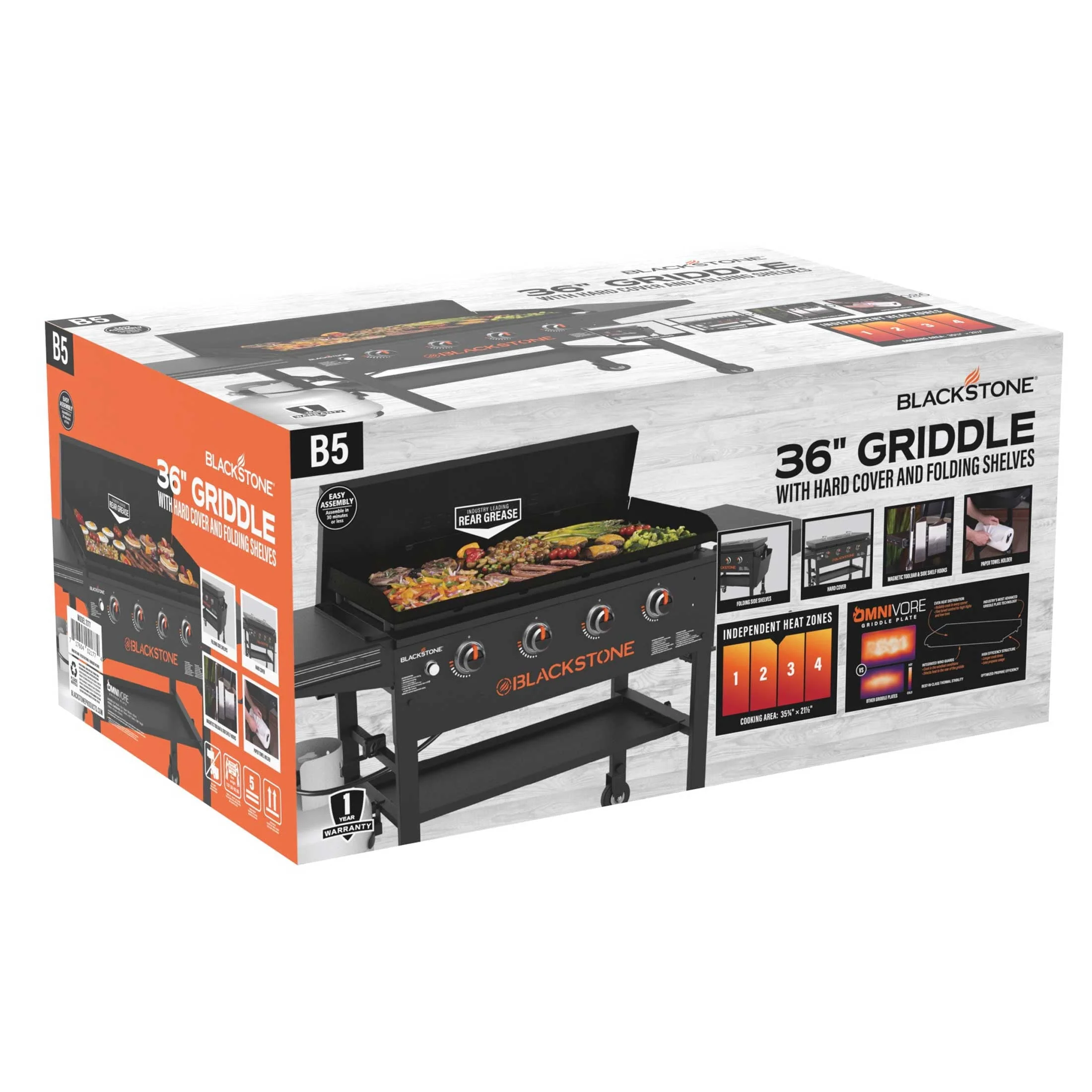 Show off your cooking skills with the Blackstone 36" Griddle Cooking Station, now featuring the Blackstone Omni Griddle Plate. This large griddle with four independently controlled cooking zones is just what you need for your backyard parties, barbecues, and campouts. The propane-fueled Blackstone 36" Griddle gives you 768 square inches of cooking space for the best griddling experience. On top of that, this griddle provides you with four independent cooking zones so you can cook everything at the same time at different temperatures. The new and improved Omni griddle plate has a patented design that heats your cooktop surface more evenly than ever before. Extra features include the side shelves that are designed specifically with your Blackstone griddle tools in mind, featuring tool hooks and a magnetic toolbar so all your Blackstone accessories are within easy reach. NOTE: This griddle is not compatible with the current Blackstone natural gas conversion kit.